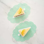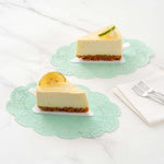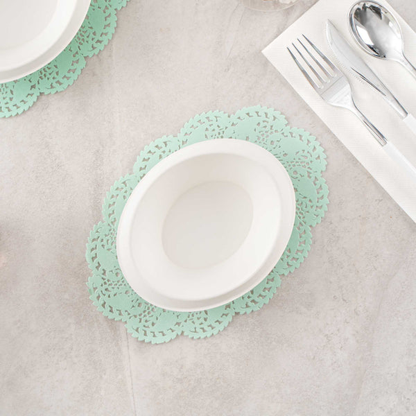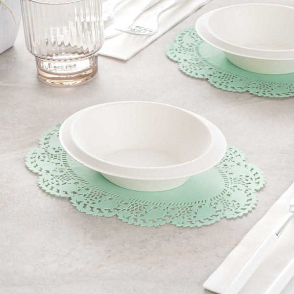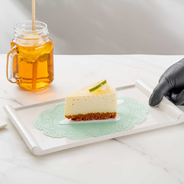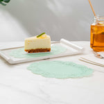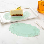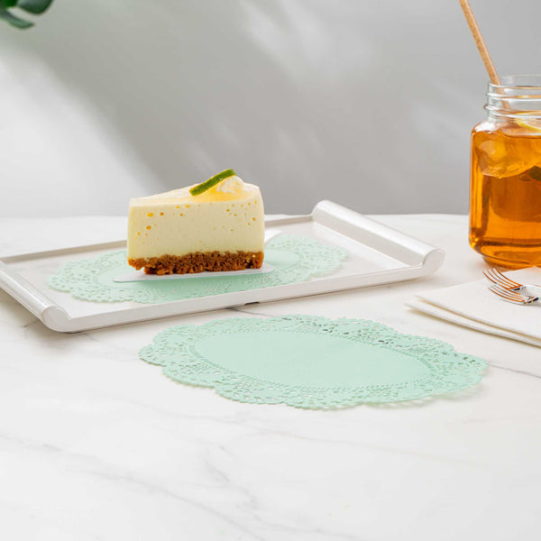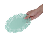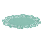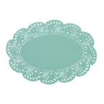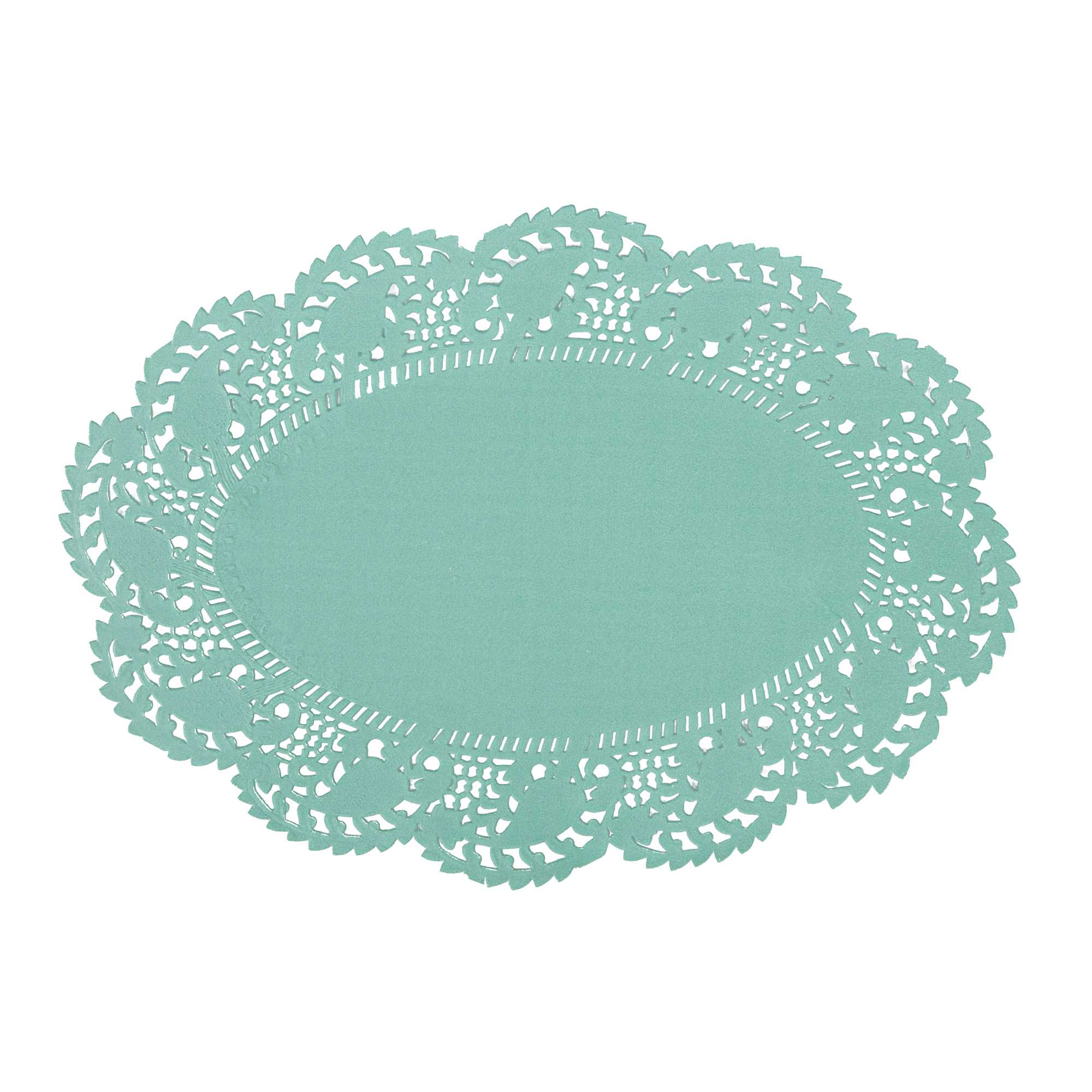 Elevate your dessert displays with our Pastry Tek Oval Teal Paper Doilies, perfect for creating stunning food presentations. Crafted from high-quality paper, these lace doilies provide exceptional durability, ensuring your desserts at bakeries or catered luncheons remain intact without tearing. The intricate lace-like details of these table doilies not only increase the visual appeal of your food presentations but also serve as functional barriers, effectively protecting surfaces and absorbing moisture. The teal colored finish of these paper doilies allows them to seamlessly complement a wide range of table settings and themes, making them ideal for various events and occasions. Designed to be disposable, these lace doilies eradicate the hassle of post-event cleanup, offering a convenient and time-saving solution for busy cafes and food establishments. Use these small doilies under cupcakes, petit fours, macarons, and other small treats to add an elegant touch. Measuring 9 inches in length by 6.5 inches in width, these colored paper doilies are perfect for a variety of uses. Sold in a 4,000 count box.