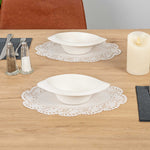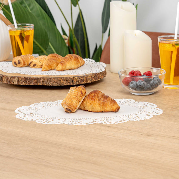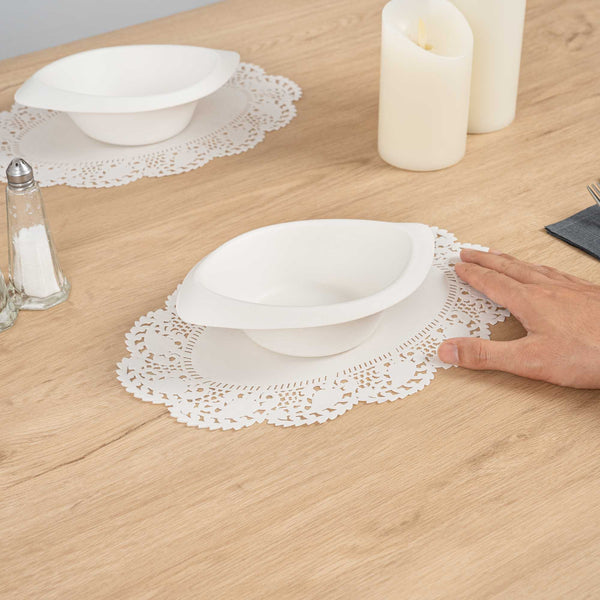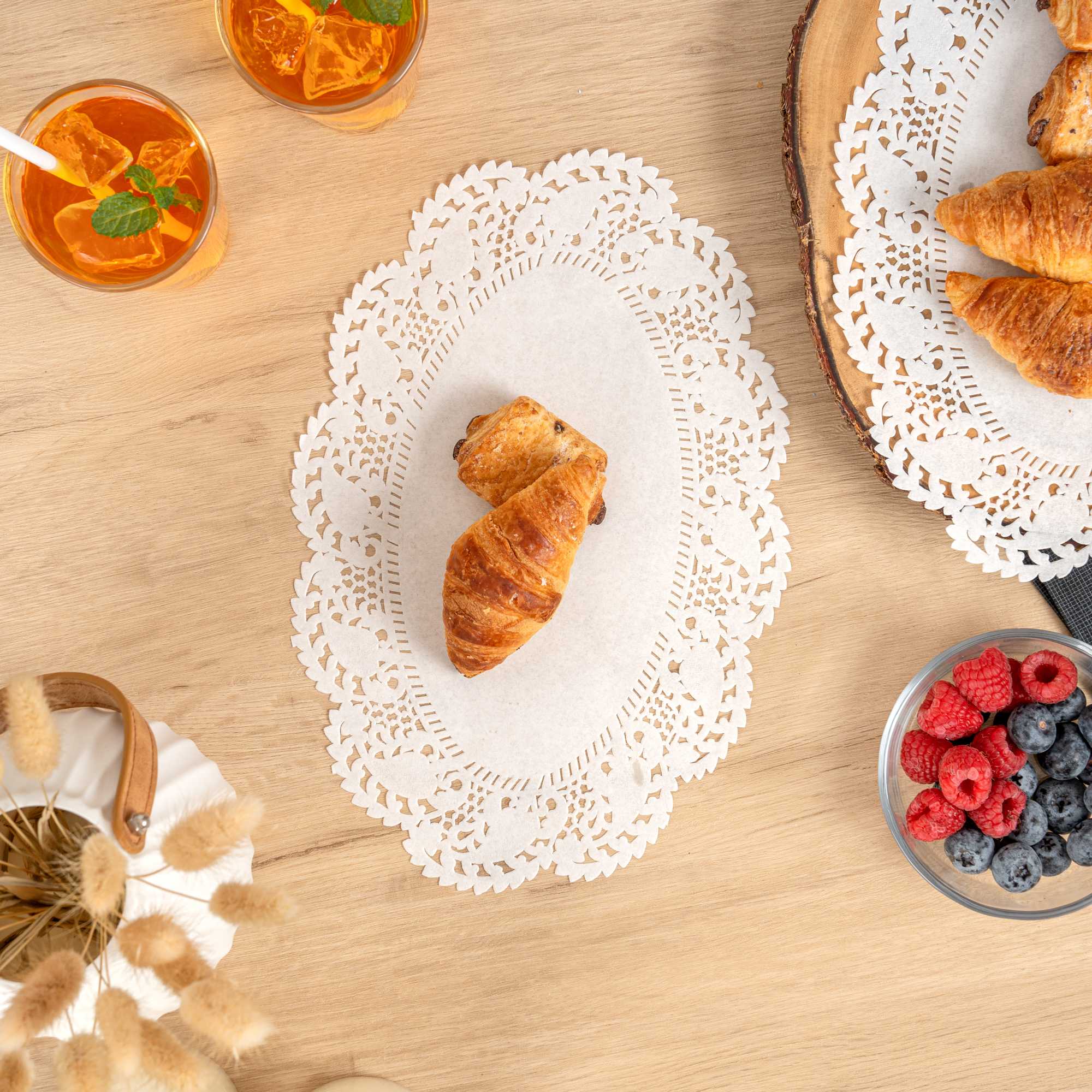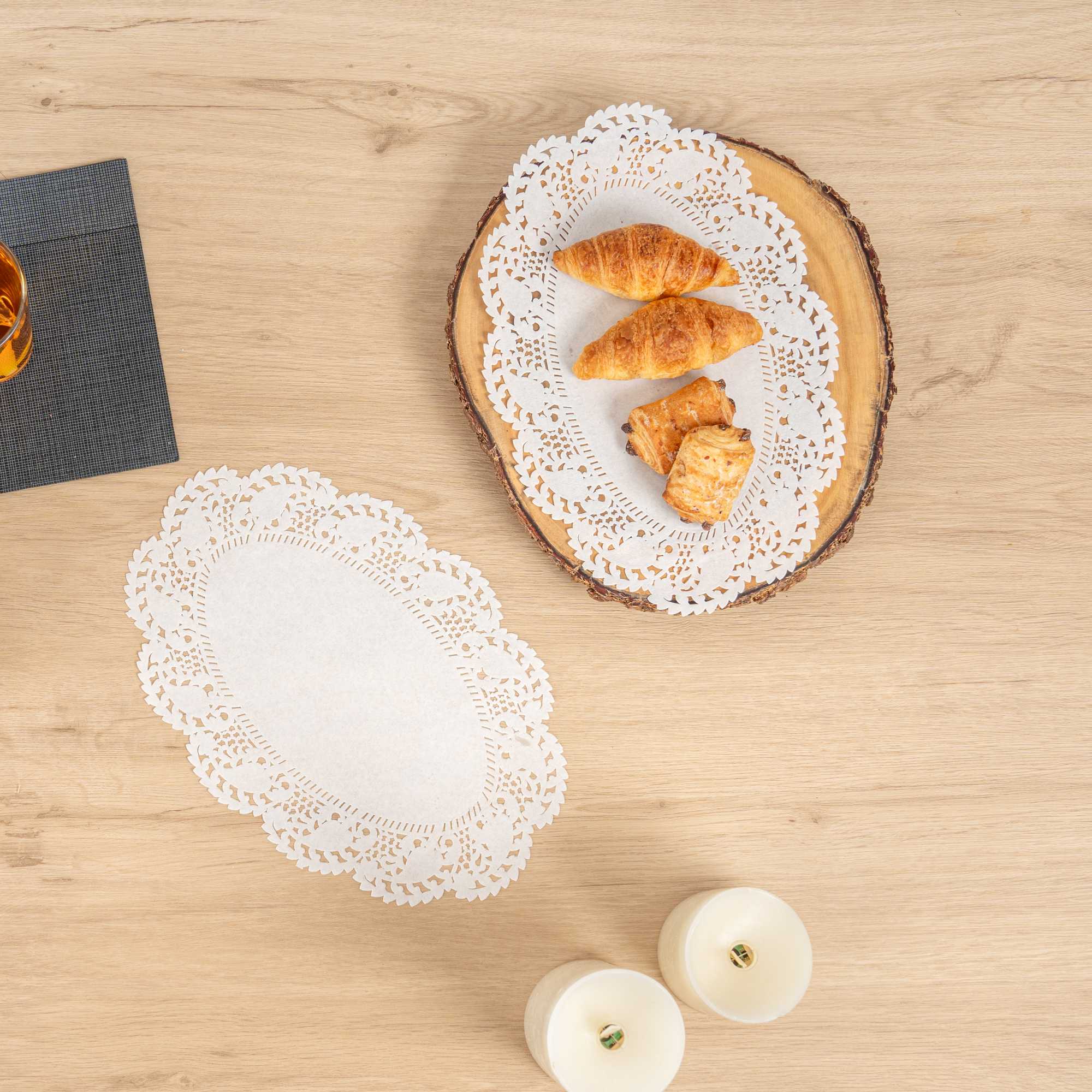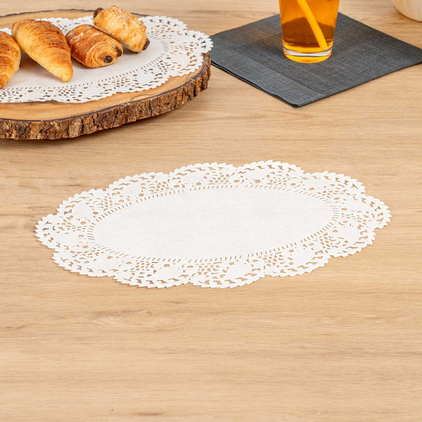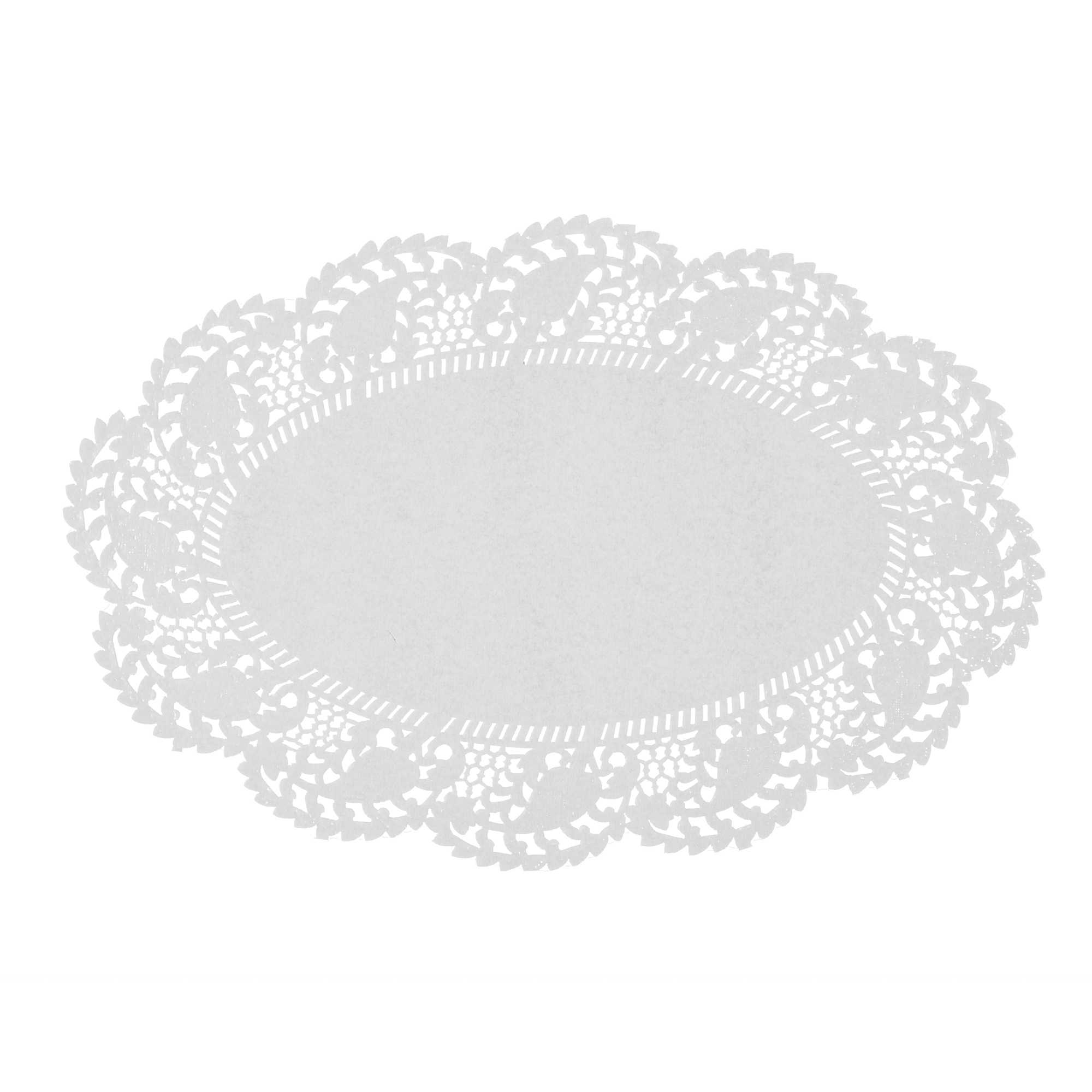 Enhance your dessert displays with our Pastry Tek Oval White Paper Doilies. Crafted from high-quality paper, these lace doilies provide durability and maintain their structural integrity while showcasing desserts at bakeries or catered luncheons. Featuring intricate lace-like details, these paper doilies not only increase the visual appeal of food presentations but also serve as functional barriers, protecting surfaces and absorbing moisture. The white colored finish of these table doilies allows them to complement a wide range of table settings and themes, making them an ideal choice for various events and occasions. Designed for convenience, these disposable doilies eradicate the hassle of post-event cleanup, offering a time-saving solution for busy cafes and food establishments. Perfect for use under cupcakes, petit fours, macarons, and other small treats, these small doilies are a must-have for any dessert display. Measuring 12.5 inches in length by 8.5 inches in width, these lace doilies provide ample space for your culinary creations. Sold in a 100 count box.