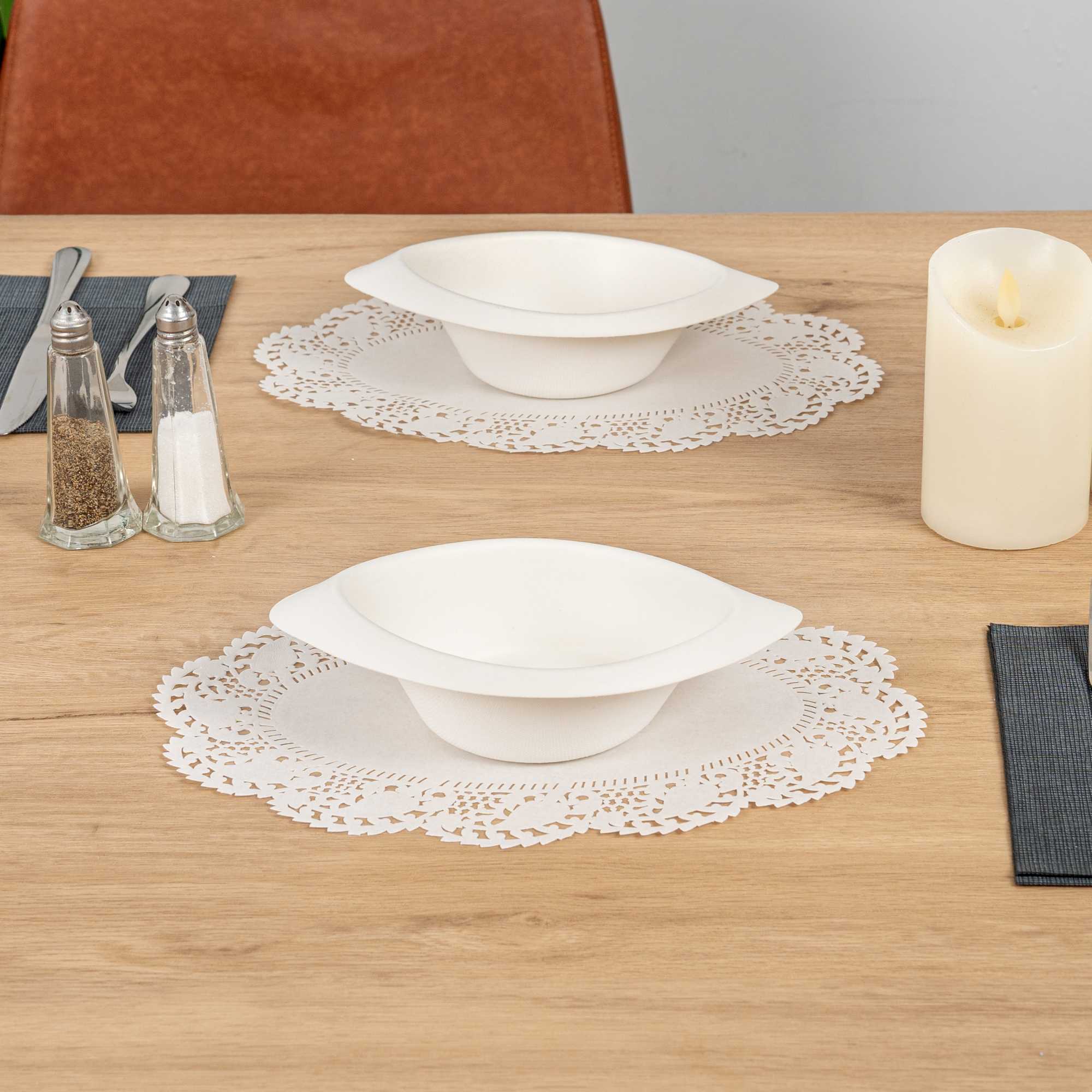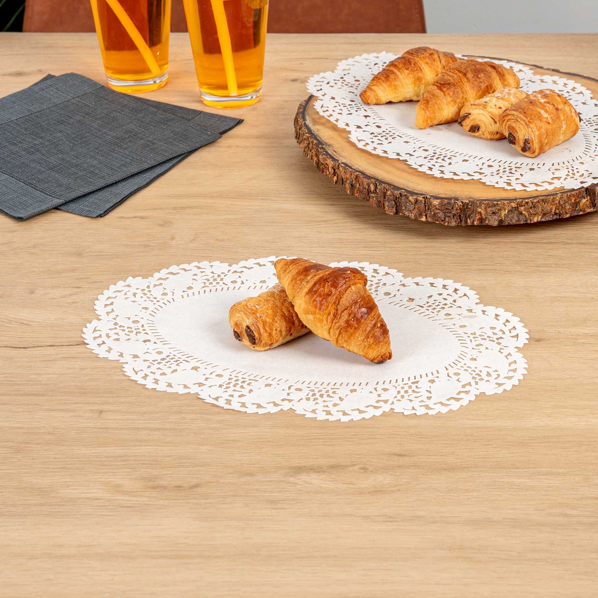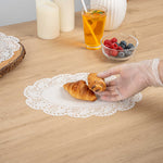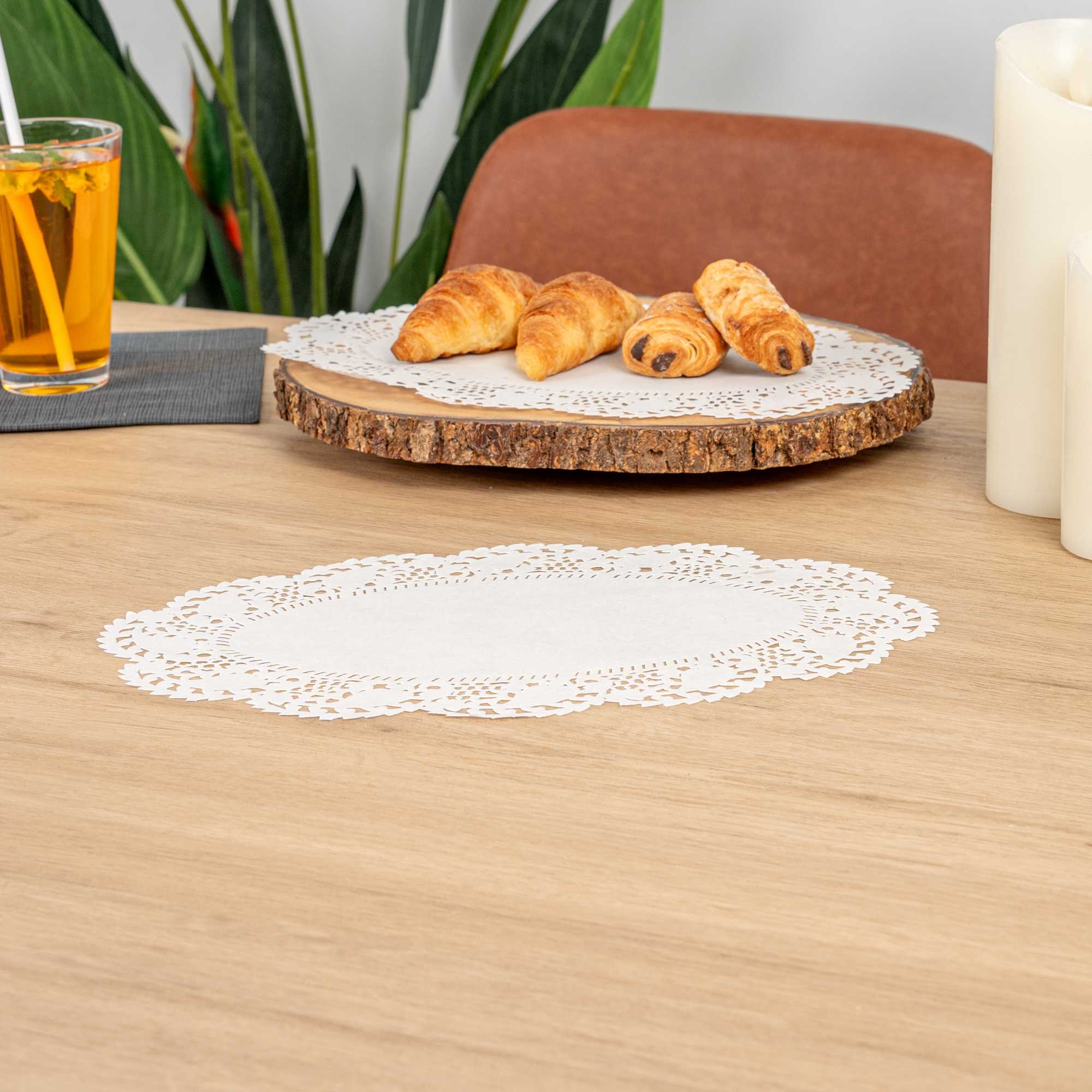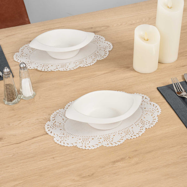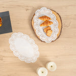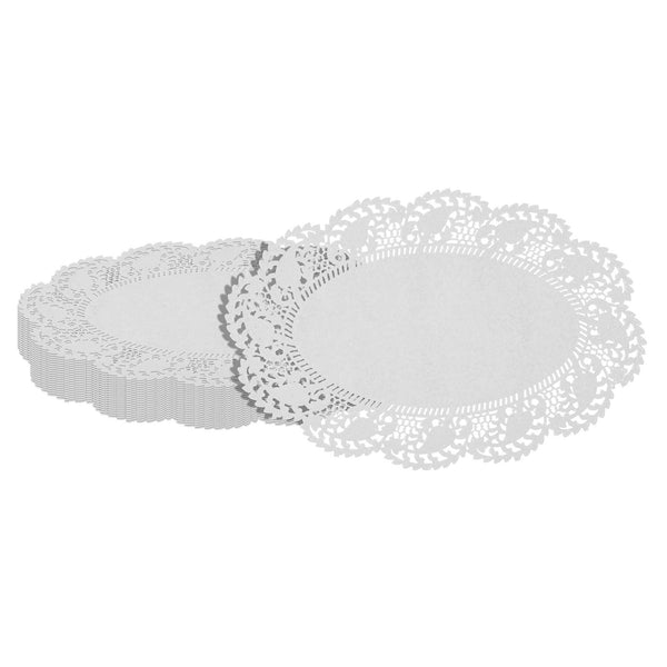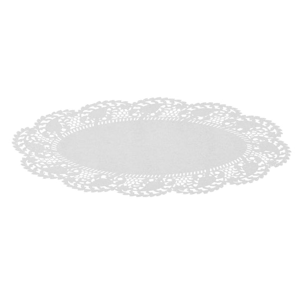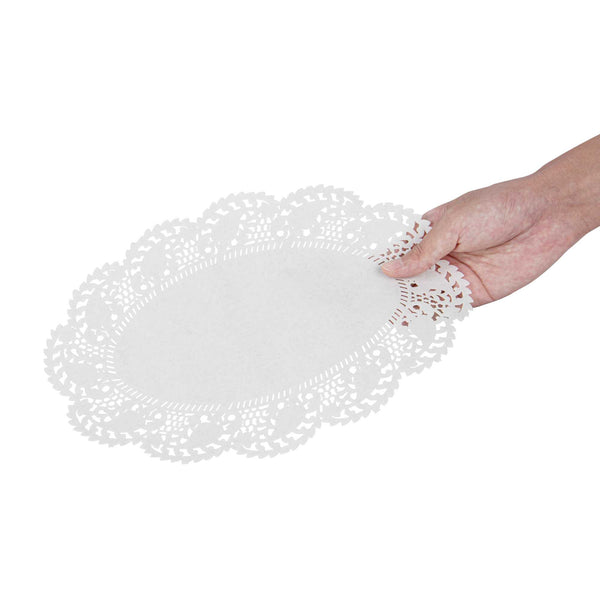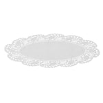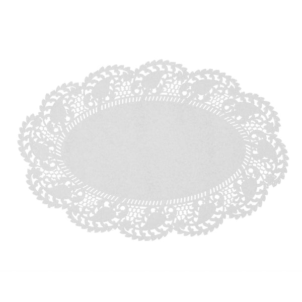 Enhance your dessert displays with our Pastry Tek Oval White Paper Doilies. Crafted from high-quality paper, these lace doilies provide durability and maintain their structural integrity while showcasing desserts at bakeries or catered luncheons. Featuring intricate lace-like details, these paper doilies not only increase the visual appeal of food presentations but also serve as functional barriers, protecting surfaces and absorbing moisture. The white colored finish of these table doilies allows them to complement a wide range of table settings and themes, making them an ideal choice for various events and occasions. Designed for convenience, these disposable doilies eradicate the hassle of post-event cleanup, offering a time-saving solution for busy cafes and food establishments. Perfect for use under cupcakes, petit fours, macarons, and other small treats, these small doilies are a must-have for any dessert display. Measuring 12.5 inches in length by 8.5 inches in width, these lace doilies provide ample space for your culinary creations. Sold in a 4,000 count box.