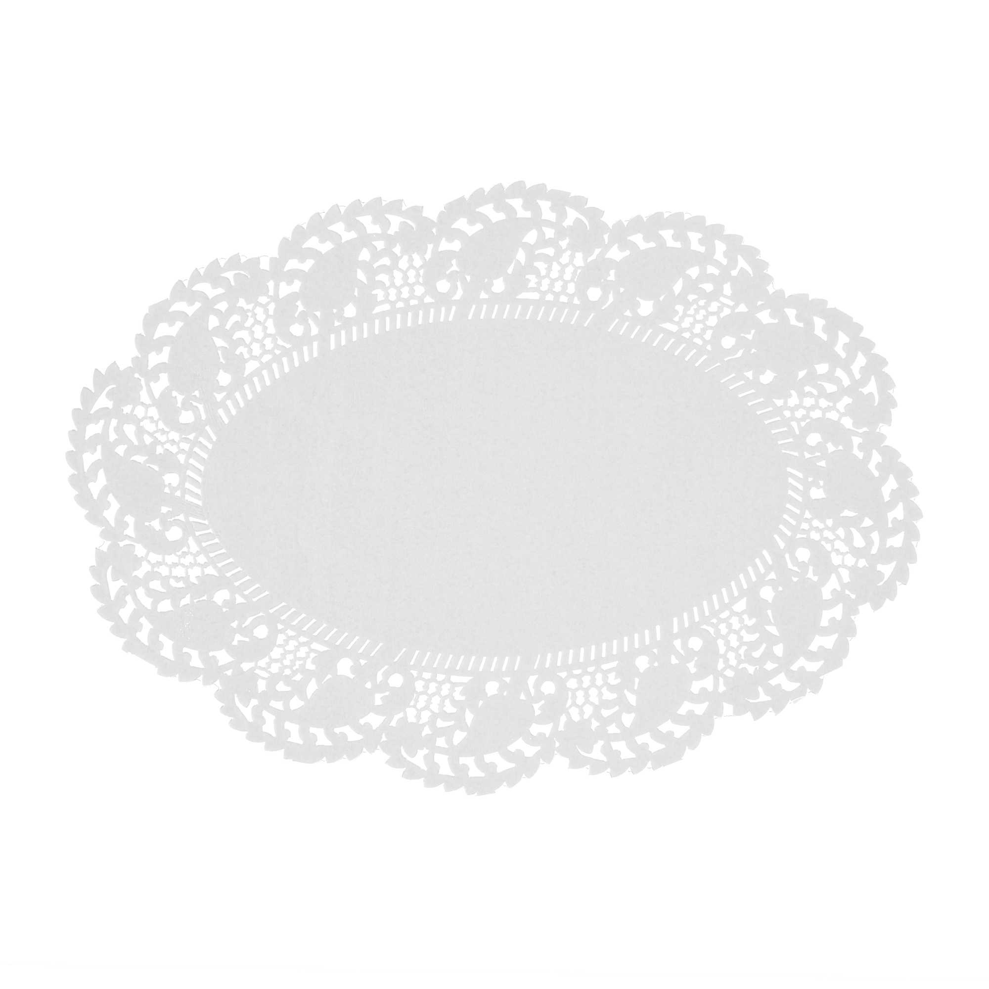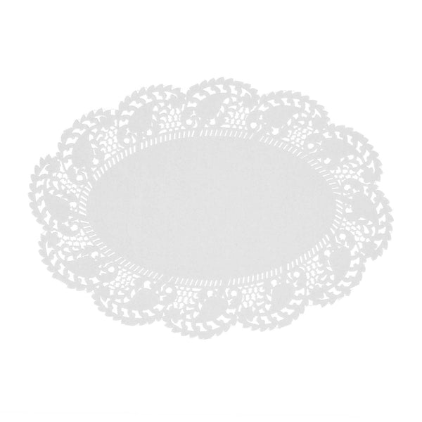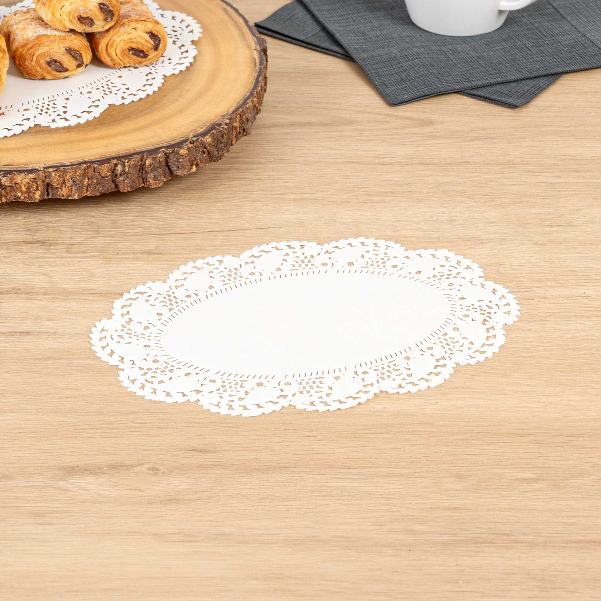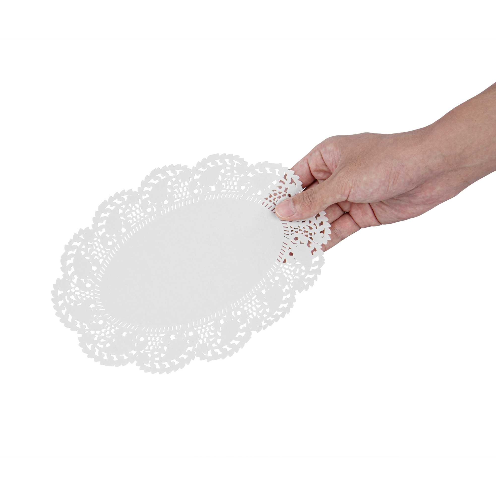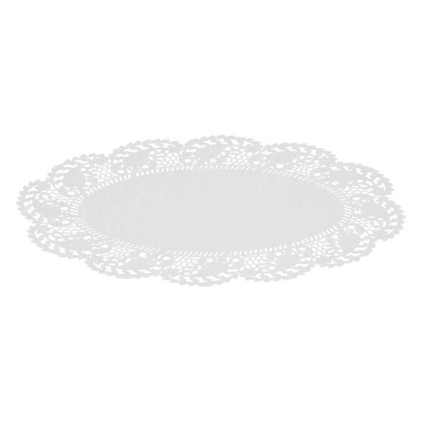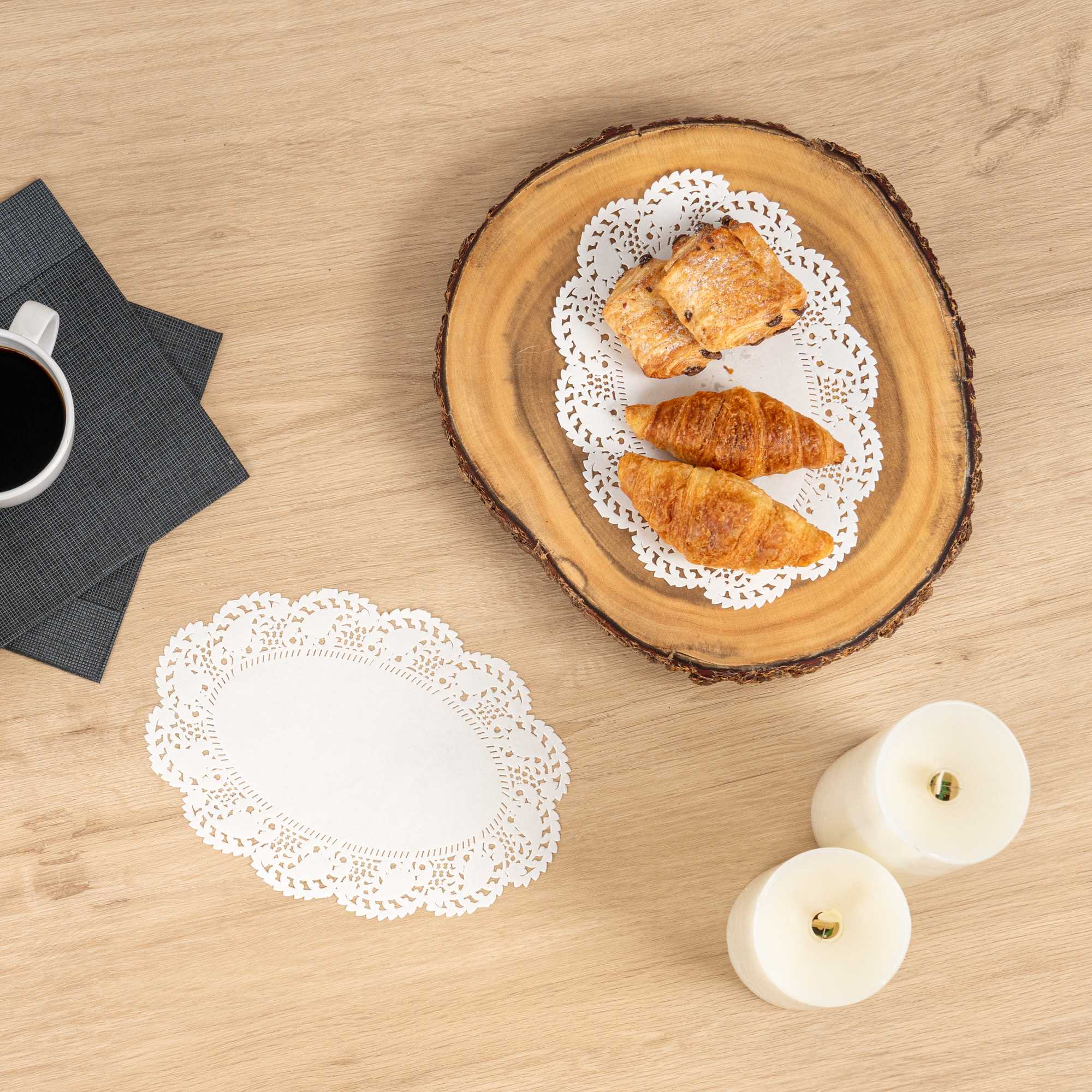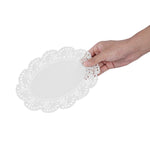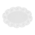 Add an elegant touch to your dessert displays with our Pastry Tek Oval White Paper Doilies. Crafted from high-quality paper, these lace doilies provide durability while displaying desserts at bakeries or catered luncheons without tearing or losing their structural integrity. The lace-like details of these table doilies increase the visual appeal of food presentations while serving as functional barriers, protecting surfaces, and absorbing moisture. The white colored finish of these paper doilies is versatile, allowing them to complement a wide range of table settings and themes, making them an ideal choice for various events and occasions. These disposable lace doilies eradicate the hassle of post-event cleanup, offering a convenient and time-saving solution for busy hosts and food establishments. Small doilies like these can be used under cupcakes, petit fours, macarons, and other small treats. Measuring 9 inches in length by 6.5 inches in width, these colored paper doilies fit perfectly under a variety of desserts. Sold in a 4,000 count box.