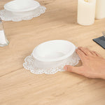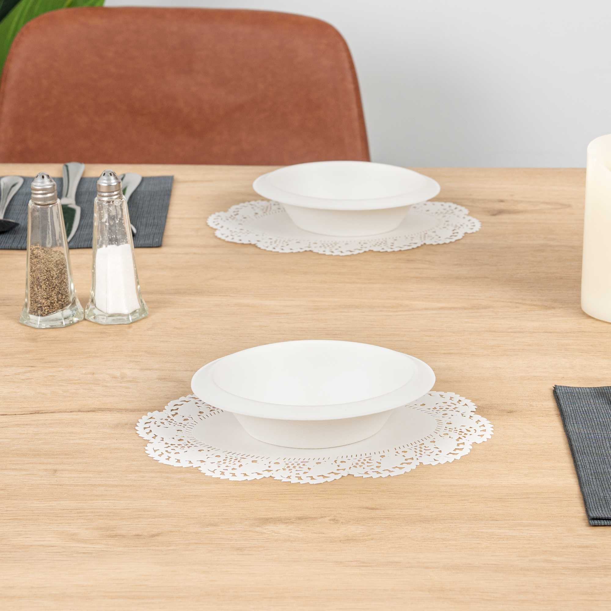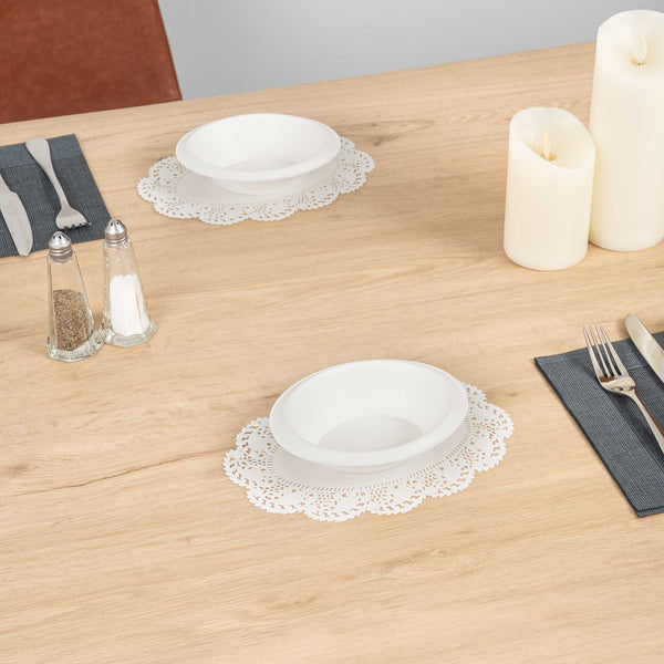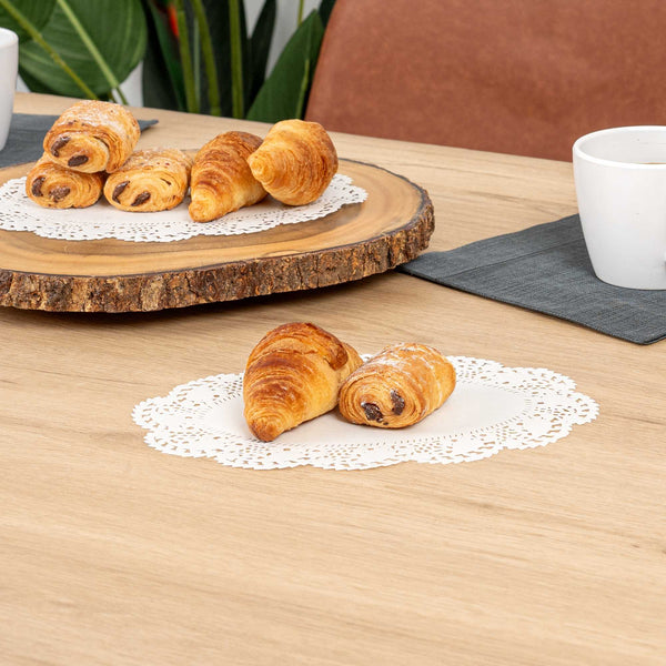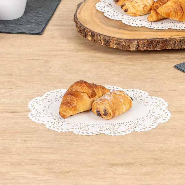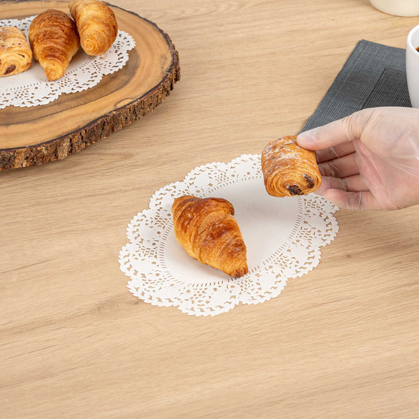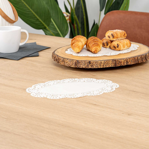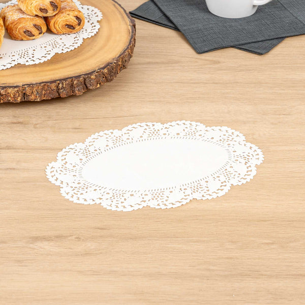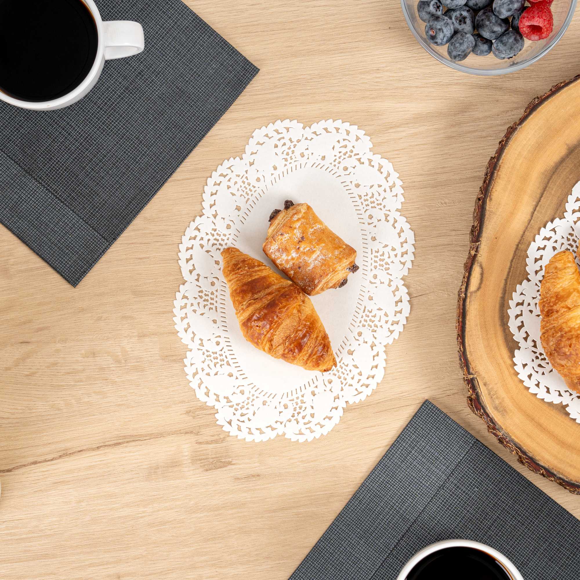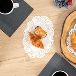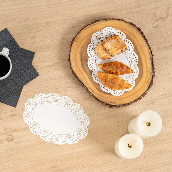 Add an elegant touch to your dessert displays with our Pastry Tek Oval White Paper Doilies. Crafted from high-quality paper, these lace doilies provide durability while displaying desserts at bakeries or catered luncheons without tearing or losing their structural integrity. The lace-like details of these table doilies increase the visual appeal of food presentations while serving as functional barriers, protecting surfaces, and absorbing moisture. The white colored finish of these paper doilies is versatile, allowing them to complement a wide range of table settings and themes, making them an ideal choice for various events and occasions. These disposable lace doilies eradicate the hassle of post-event cleanup, offering a convenient and time-saving solution for busy hosts and food establishments. Small doilies like these can be used under cupcakes, petit fours, macarons, and other small treats. Measuring 9 inches in length by 6.5 inches in width, these colored paper doilies fit perfectly under a variety of desserts. Sold in a 4,000 count box.