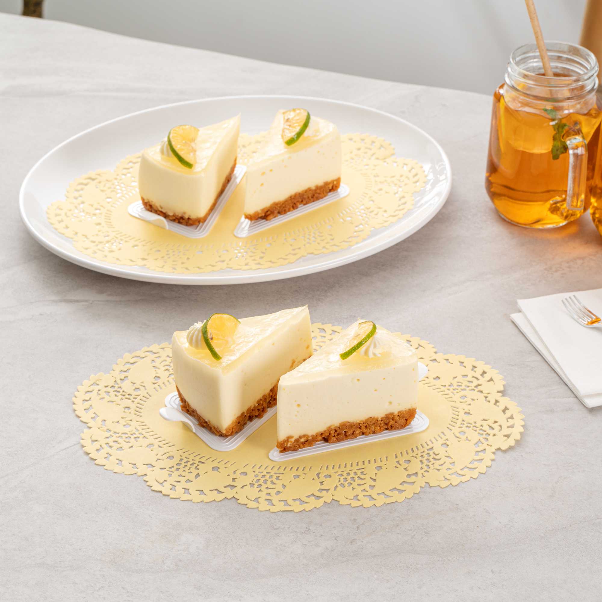 Elevate your dessert presentations with our Pastry Tek Oval Yellow Paper Doilies. Crafted from high-quality paper, these lace doilies offer durability, making them perfect for displaying desserts at bakeries or catered luncheons without tearing or losing structural integrity. With intricate lace-like details, these table doilies not only increase the visual appeal of your food presentations but also serve as functional barriers by protecting surfaces and absorbing moisture. The yellow colored finish of these doilies is versatile, allowing them to complement a wide range of table settings and themes, making them an ideal choice for various events and occasions. Disposable by design, these small doilies eradicate the hassle of post-event cleanup, offering a convenient and time-saving solution for busy cafes and food establishments. Perfect for use under cupcakes, petit fours, macarons, and other small treats, these paper doilies enhance the aesthetic of any dessert display. Measuring 12.5 inches in length by 8.5 inches in width, these lace doilies fit seamlessly into various setups. Sold in a 100 count box.