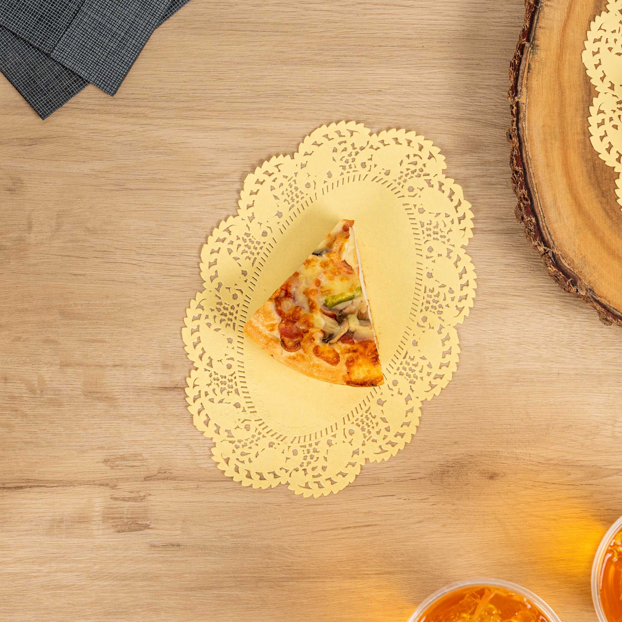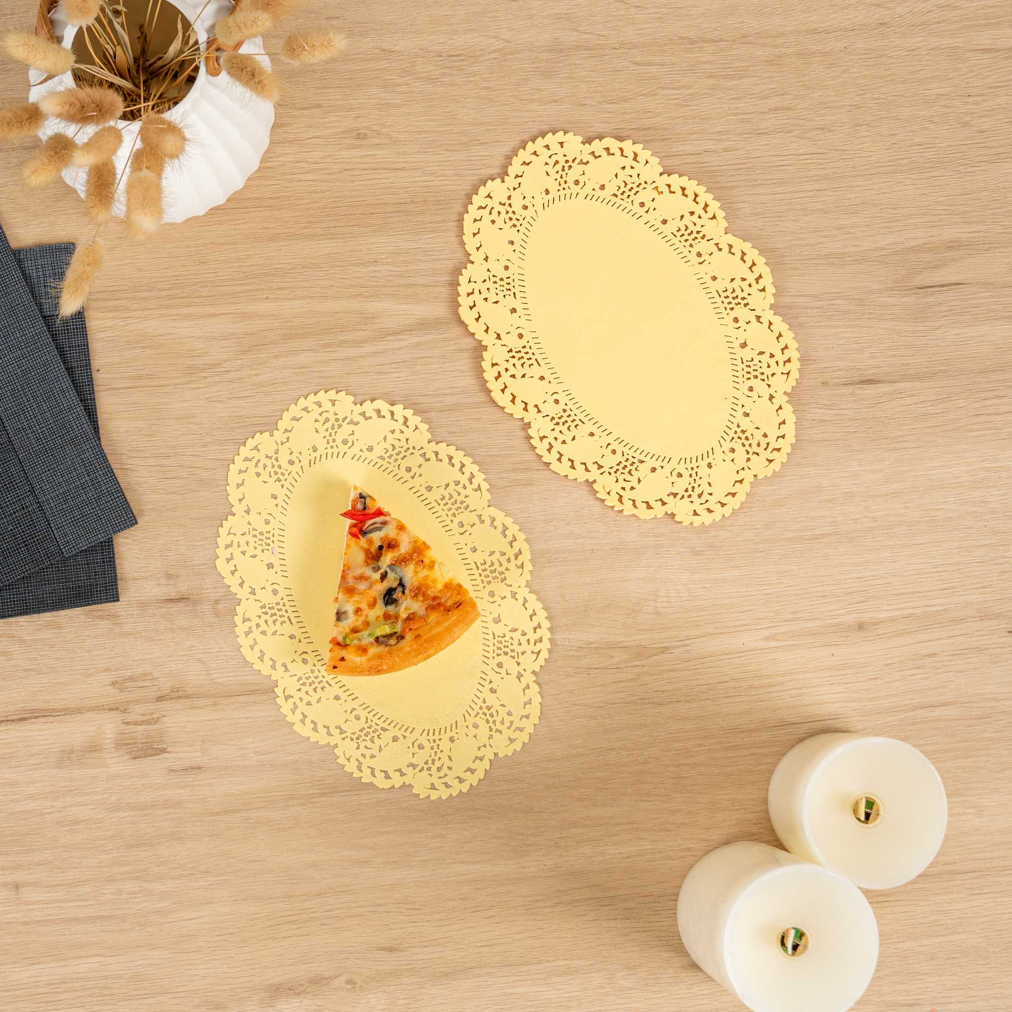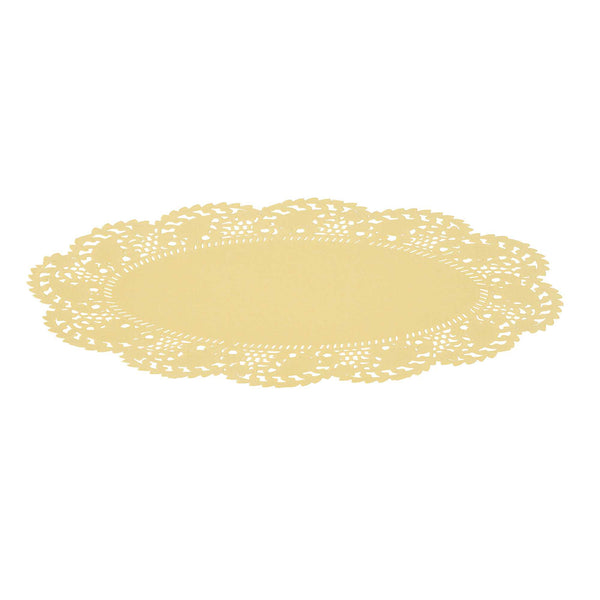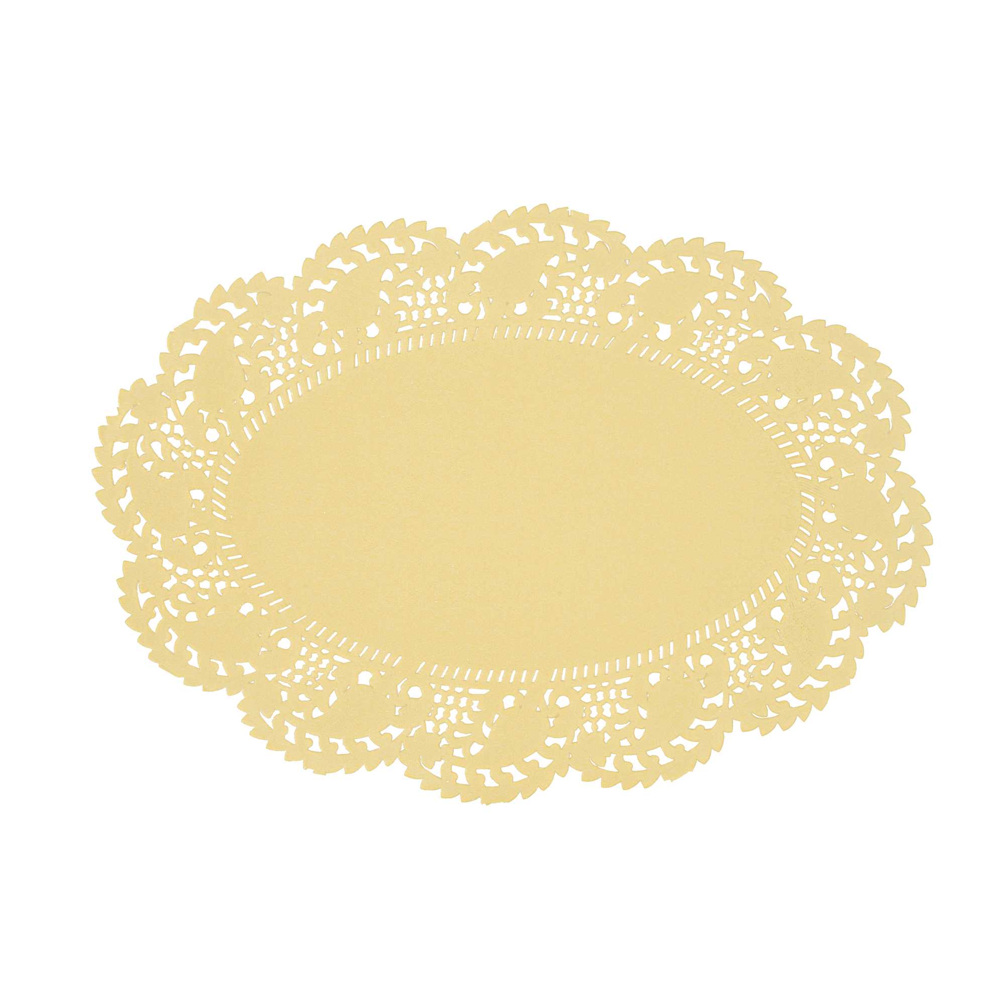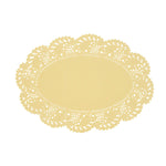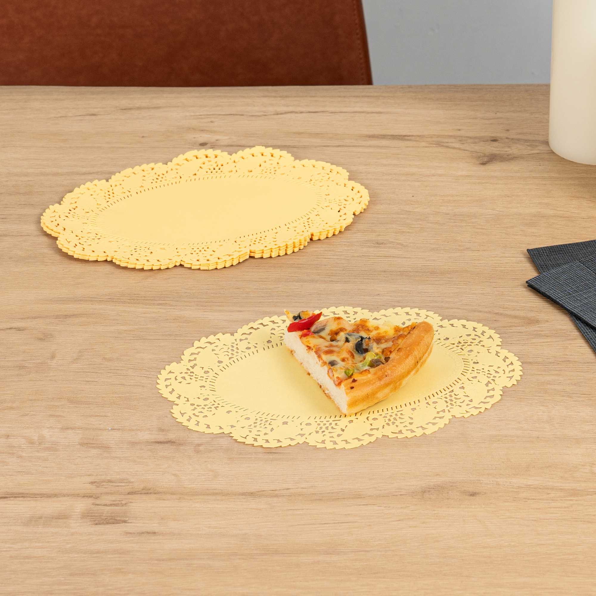 Elevate your dessert presentations with our Pastry Tek Oval Yellow Paper Doilies. Crafted from high-quality paper, these lace doilies provide durability while displaying desserts at bakeries or catered luncheons without tearing or losing their structural integrity. The intricate lace-like details of these paper doilies enhance the visual appeal of food presentations while serving as functional barriers, protecting surfaces, and absorbing moisture. Versatile and stylish, these yellow colored paper doilies complement a wide range of table settings and themes, making them an ideal choice for various events and occasions. Conveniently disposable, these table doilies eradicate the hassle of post-event cleanup, offering a time-saving solution for busy events and food establishments. Perfectly sized, these small doilies measure 9 inches in length by 6.5 inches in width, making them ideal for cupcakes, petit fours, macarons, and other small treats. Sold in a 4,000 count box.