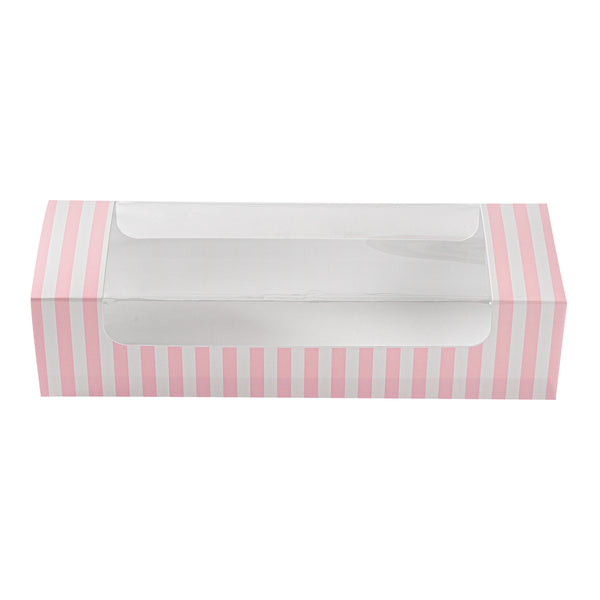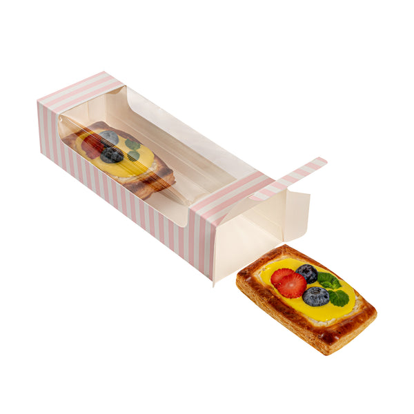 Present your delightful treats in a stylish manner with our Pastry Tek Pink and White Stripe Paper Pastry / Cake Boxes. Featuring a transparent window, these bakery boxes deliver superior visibility, enabling efficient display and effortless identification of desserts. Designed with grease-resistant properties, these pastry boxes ensure that oil leakage is a concern of the past. The recyclable nature of these pink and White striped paper cake boxes provides an easy solution to minimize waste in your establishment. With a charming striped design, these cake boxes elevate the presentation of your baked goods. Conveniently shipped flat, these treat boxes save storage space and simplify assembly. Each paper treat box measures 9.75 inches in length by 3.25 inches in width by 2.25 inches in height. Sold in a 100 count box.