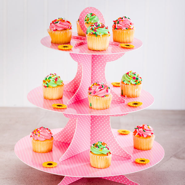 Effortlessly draw attention to your desserts with this Pastry Tek Pink Cardboard Cupcake Stand. Covered in a playful pink and white polka-dotted print, this disposable cupcake stand ensures your treats look their best from every angle. The 3-tier design provides plenty of room for displaying a selection of baked goods, while the pink finish adds a beautiful touch to any occasion. Made from premium cardboard, this multi-tier cupcake stand has a sturdy construction that easily supports heavy cupcakes, muffins, and other desserts. Ideal for use as a baby shower cupcake tower or to accentuate the dessert display at a buffet, this cupcake stand is conveniently disposable for a quick and easy post-event cleanup. This cupcake stand has a 6.5-inch tier, a 9.5-inch tier, and a 13.5-inch tier. Designed for easy and space-saving storage, this cupcake tower is shipped flat and unassembled. To assemble, simply slide together the stylish tower and round circular tiers. This disposable cupcake stand measures 14 inches in total height when assembled. Sold in a 1 count box.