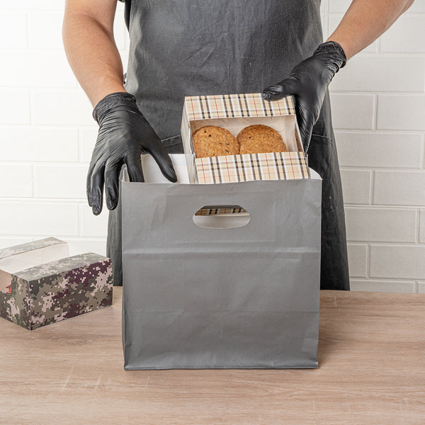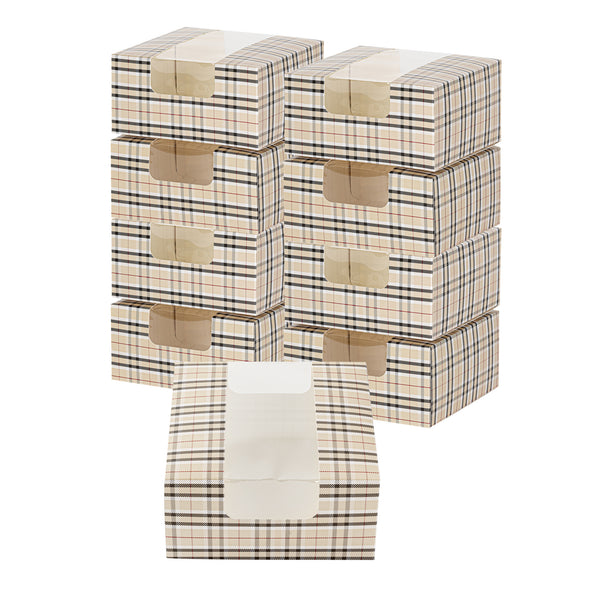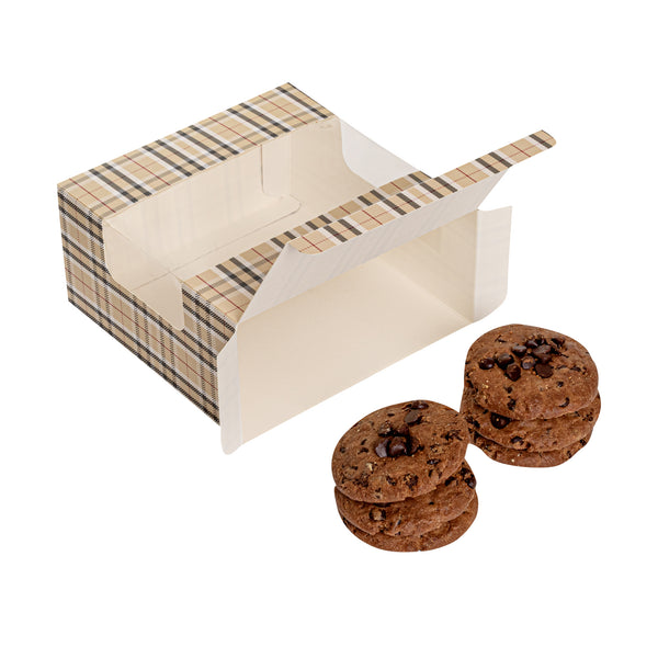 Exhibit your scrumptious treats in style using our Pastry Tek Plaid Paper Pastry / Cake Boxes. Incorporated with a transparent window, these pastry boxes ensure your pastries are easily seen and appreciated. Made with grease-resistant paper, these treat boxes limit the risk of oil seepage. The recyclable feature of these confection boxes assists in managing waste in your place of business. These cake boxes sport a distinguished plaid pattern for an elevated appearance that complements the delicious pastries inside. These disposable pastry boxes are shipped flat and are ready to assemble, providing convenience in storage and set-up. Each plaid pastry box measures 6.25 inches in length by 6.25 inches in width by 3.25 inches in height. Sold in a 100 count box.