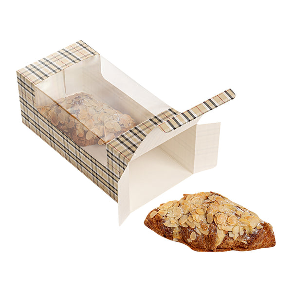 Present your appetizing desserts in our Pastry Tek Plaid Paper Pastry / Cake Boxes. Designed with a visible window, these cake boxes enable an excellent view for quick identification and elegant display of your baked goods. Equipped with grease-resistant aspects, these pastry boxes prevent oils from infiltrating the surface. These plaid paper cake boxes are recyclable, providing a straightforward path to reducing waste in your bakery. Donning a plaid finish, these bakery boxes add a touch of elegance while emphasizing the scrumptious treats inside. Delivered flat, these confection boxes conserve storage space in your bakery and make assembly quick and easy. Each paper cake box measures 9.75 inches in length by 4.25 inches in width by 3.75 inches in height. Sold in a 100 count box.