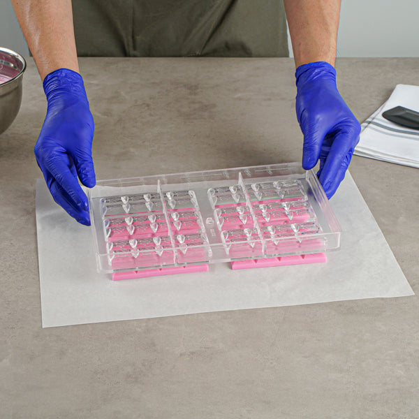Create delectable treats with our Pastry Tek Polycarbonate Break-Apart Candy / Chocolate Mold. Crafted from polycarbonate, this clear mold does not crack under pressure, ensuring longevity and consistent performance. With a 6 compartment design, this candy mold allows for precise and uniform creations, making it the perfect choice for professional-grade chocolate and candy molds. The clear finish of this chocolate bar mold lets you easily monitor the process, ensuring perfect results every time. This candy bar mold is freezer-safe, accommodating your chilling requirements with ease. To make cleanup a breeze, this polycarbonate chocolate mold is dishwasher-safe. This clear candy mold measures 10.75 inches in length by 6.75 inches in width, an ideal tool for professionals and dessert enthusiasts. Each cavity of this chocolate mold tray measures 4.3 inches in length by 1.6 inches in width by 0.3 inches in depth. Sold in a 1 count box.
