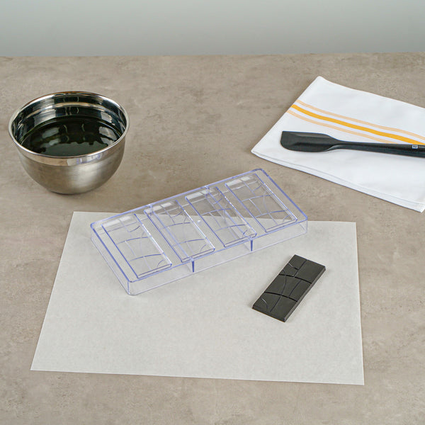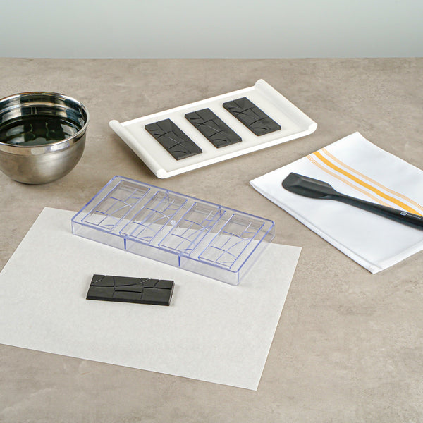 Elevate your confectionery creations with our Pastry Tek Polycarbonate Chocolate Bar Mold. This durable candy mold features 4 compartments, allowing you to efficiently produce multiple chocolate bars at once. The rectangular shape of this polycarbonate chocolate mold gives a classic and professional look to your candies, making them perfect for creating gourmet chocolate bars. With a clear finish, this chocolate mold allows for easy product visibility, ensuring your creations meet your quality standards before removal. Crafted from durable polycarbonate, this chocolate bar mold won't crack easily and is ideal for long-lasting use. This candy bar mold is freezer-safe and perfect for creating frozen treats. Dishwasher-safe, this clear mold simplifies your cleanup. This clear chocolate mold measures 10.75 inches in length by 5.25 inches in width with each cavity measuring 4.6 inches in length by 1.9 inches in width by 0.3 inches in depth Sold in a 1 count box.