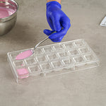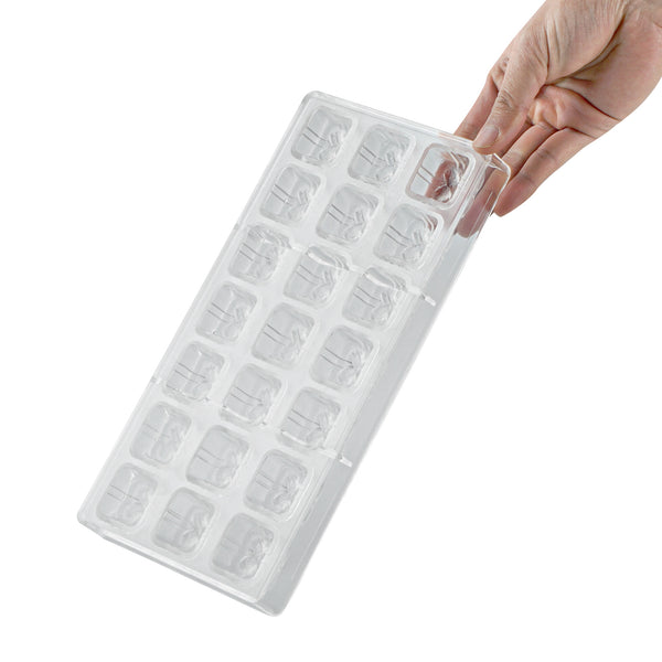 Create intricate and appealing confectioneries with our Pastry Tek Polycarbonate Gift Box Candy / Chocolate Mold. Crafted from durable polycarbonate, this clear mold is designed to withstand long-term use without cracking, making it a must-have for any commercial kitchen. With 21 compartments, this chocolate mold allows you to create a variety of chocolates and candies. The clear finish of this rectangle candy mold lets you easily monitor the molding process, ensuring that each candy or chocolate piece turns out perfectly. Ideal for busy bakeries, caterers, and restaurants, this polycarbonate chocolate mold is freezer-safe, allowing you to quickly cool and set your candies. This candy bar mold is dishwasher-safe, simplifying cleanup after a bustling day of candy creation. Measuring 10.75 inches in length by 5.25 inches in width, this clear candy mold ensures you have plenty of space to shape your sweet creations. Each cavity of this mold tray measures 1.1 inches in diameter by 0.6 inches in depth. Sold in a 1 count box.