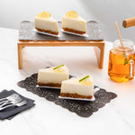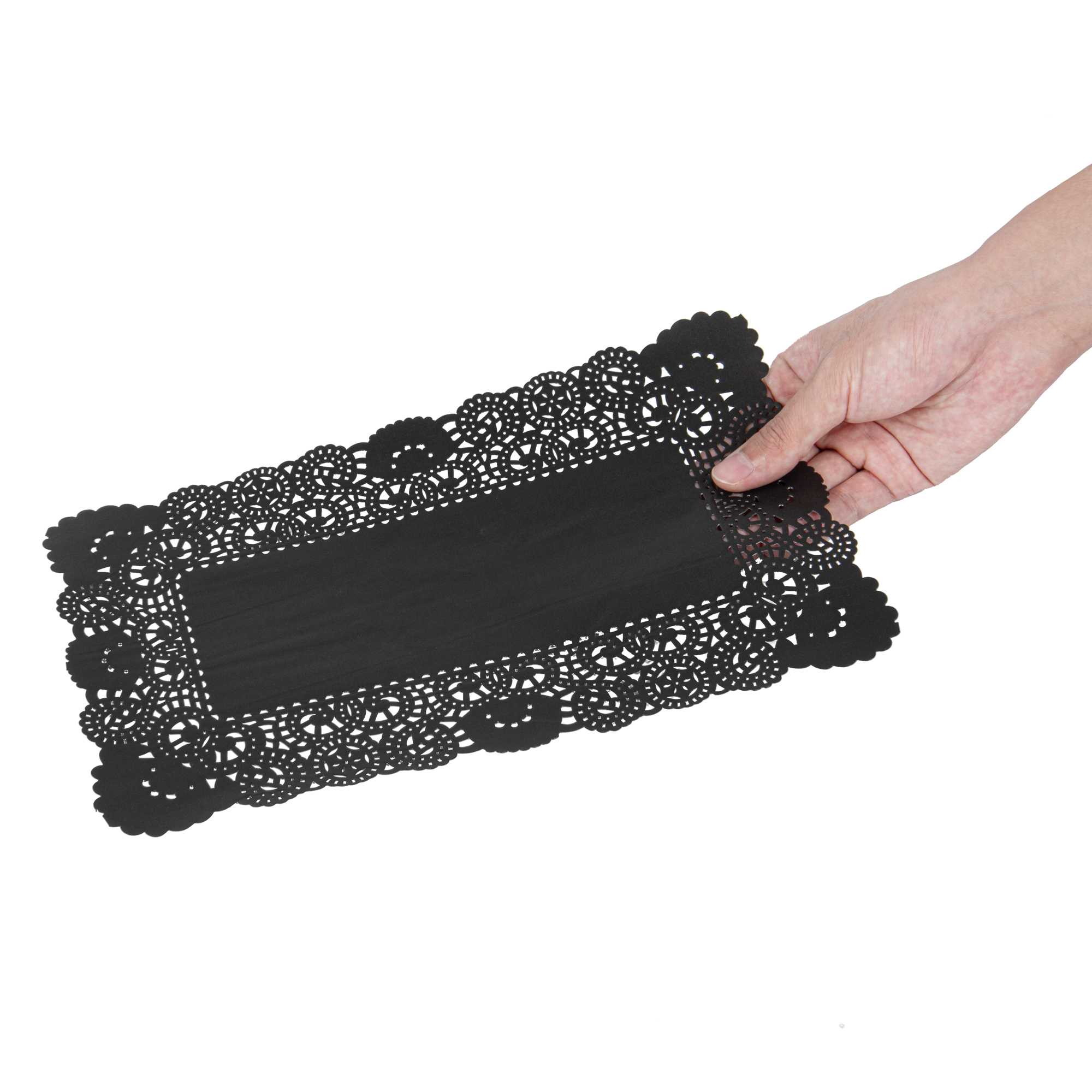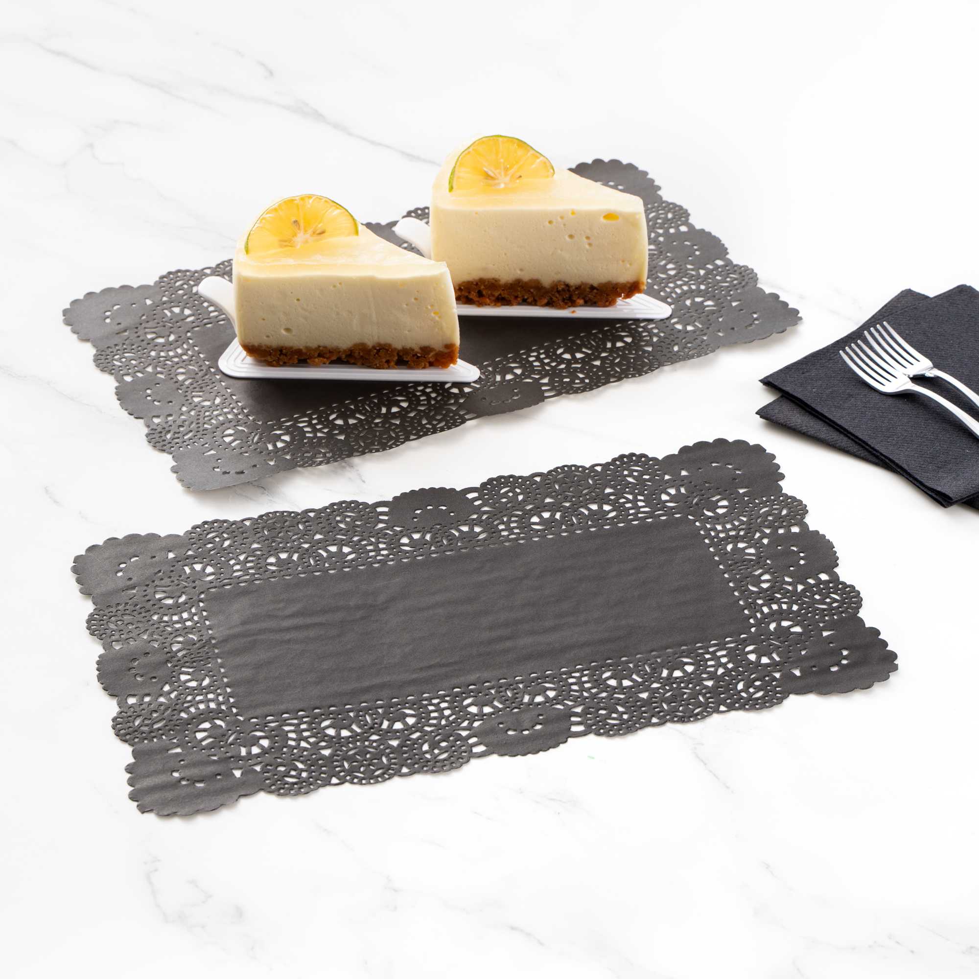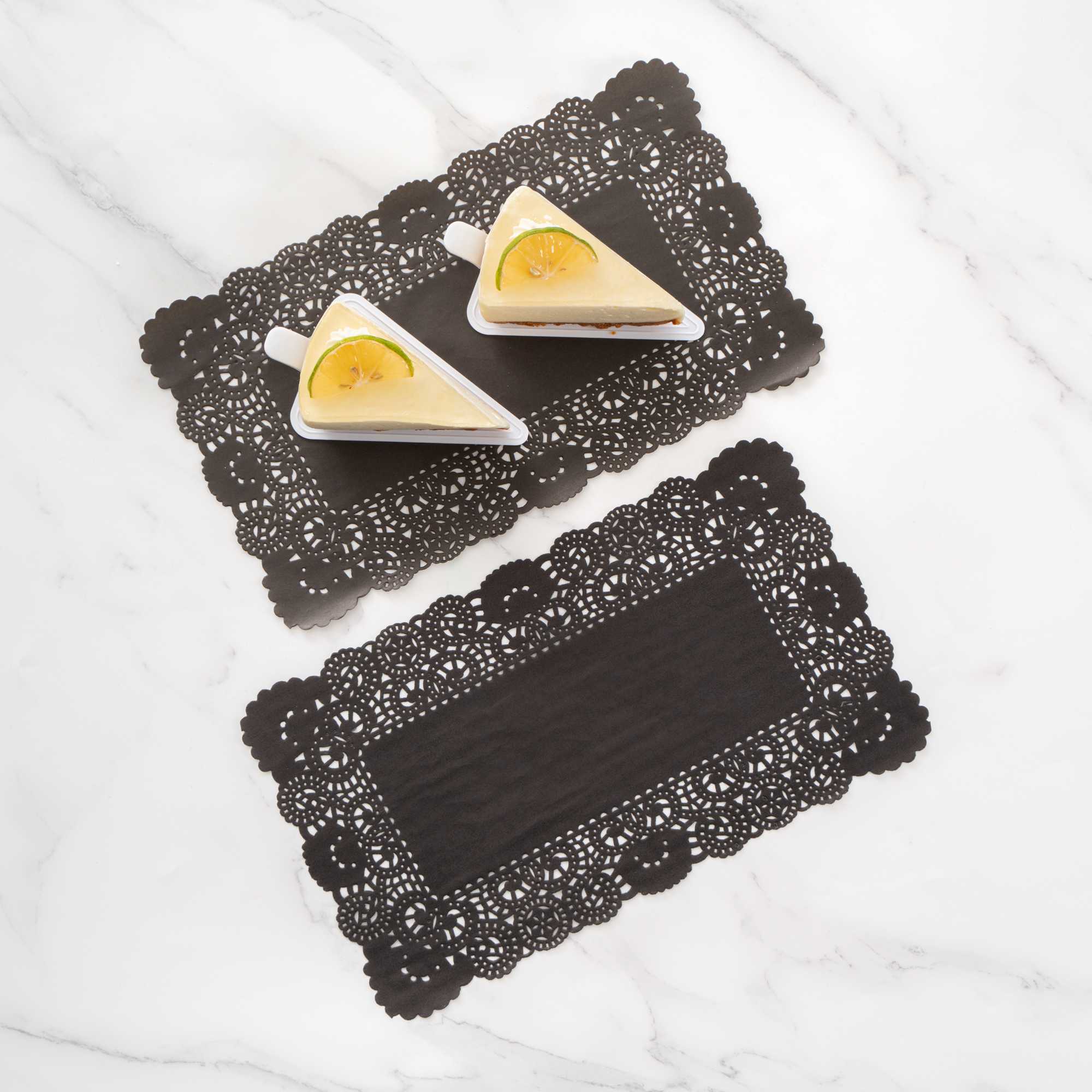 Elevate your dessert displays with our Pastry Tek Rectangle Black Paper Doilies, perfect for adding an elegant touch to any presentation. Crafted from high-quality paper, these durable lace doilies allow you to showcase desserts at bakeries or catered luncheons without tearing or losing their structural integrity. Featuring intricate lace-like details, these table doilies increase the visual appeal of food presentations while serving as functional barriers, protecting surfaces and absorbing moisture. The black colored finish of these paper doilies complements a wide range of table settings and themes, making them an ideal choice for various events and occasions. Designed for convenience, these disposable doilies eradicate the hassle of post-event cleanup, offering a time-saving solution for busy hosts and food establishments. These small doilies are perfect for placing under cupcakes, petit fours, macarons, and other small treats. Measuring 12 inches in length by 7 inches in width, these lace doilies fit seamlessly into any display setup. Sold in a 4,000 count box.