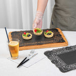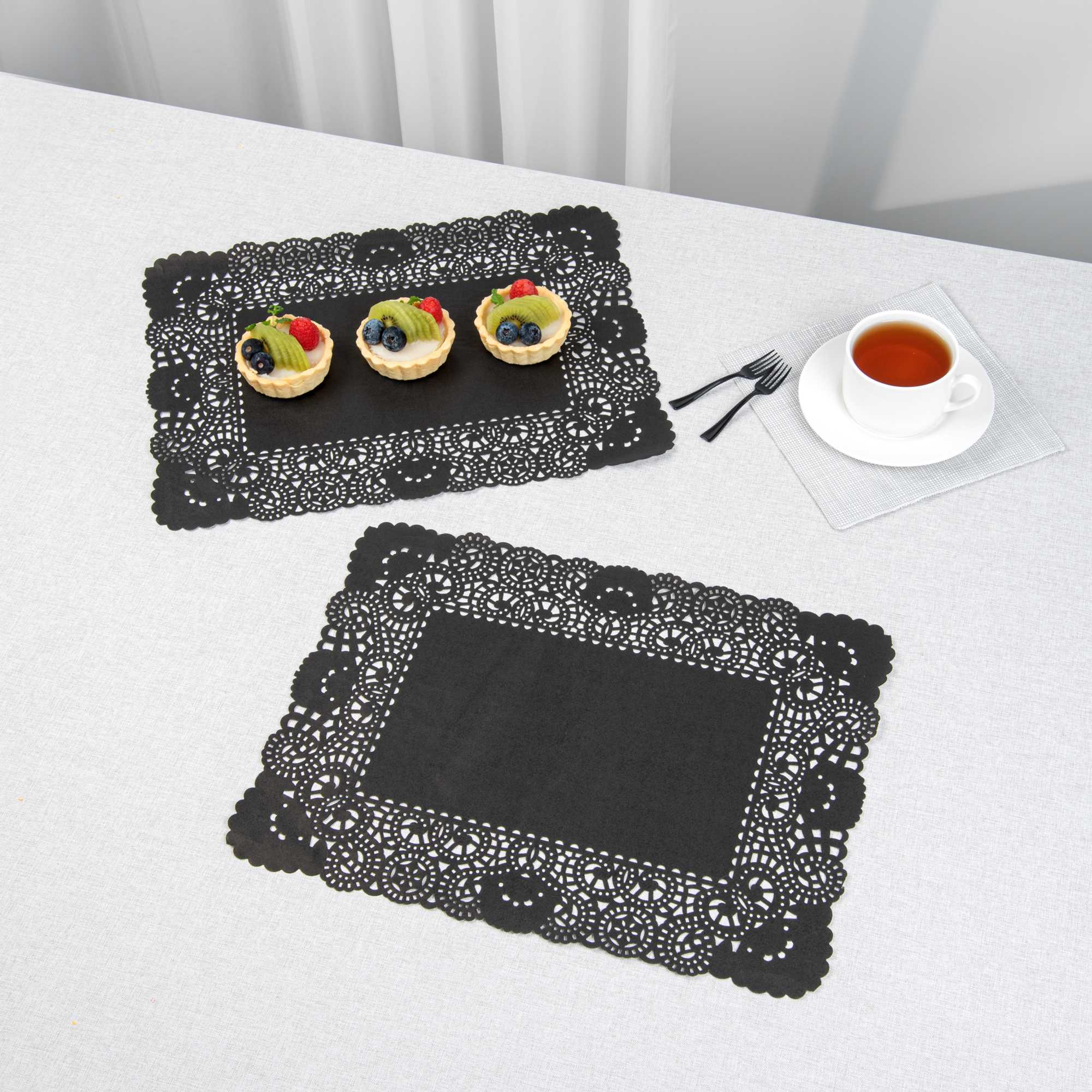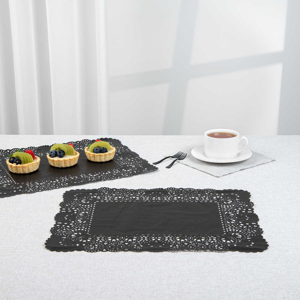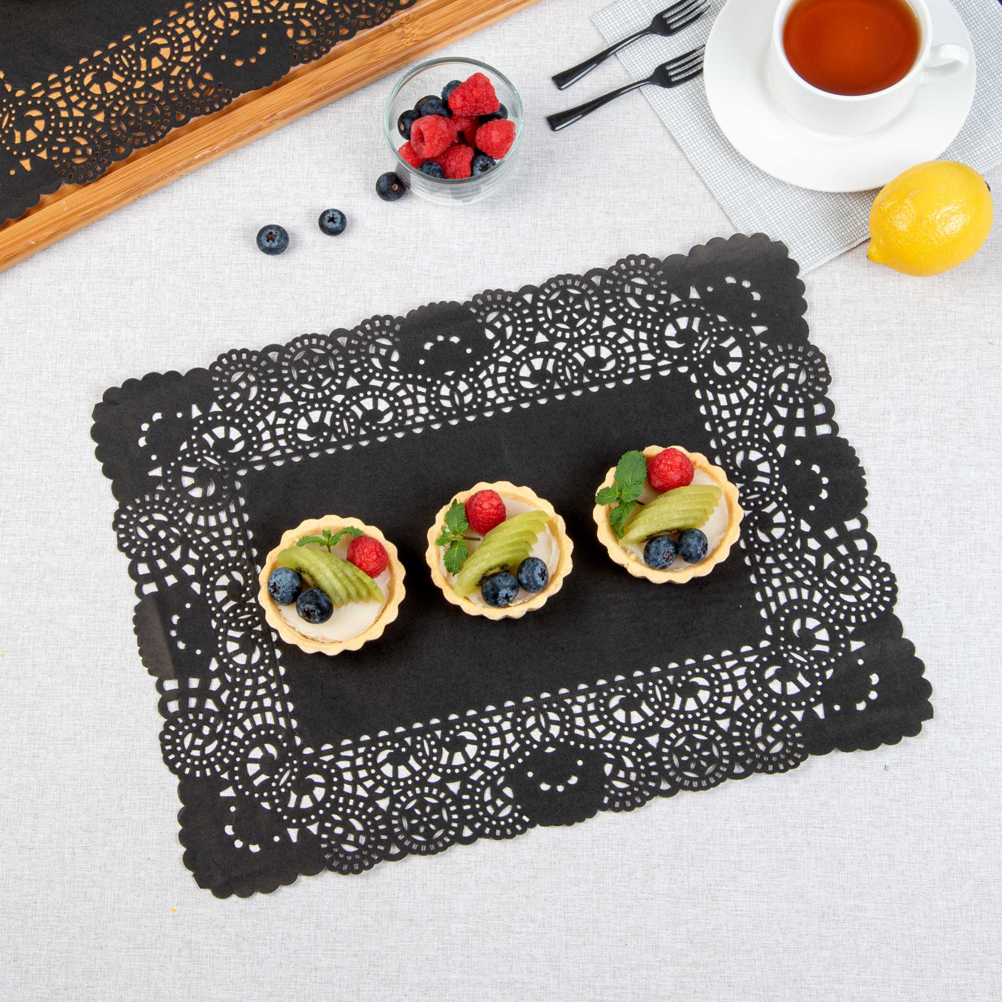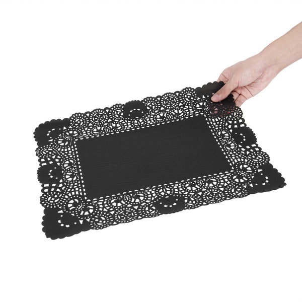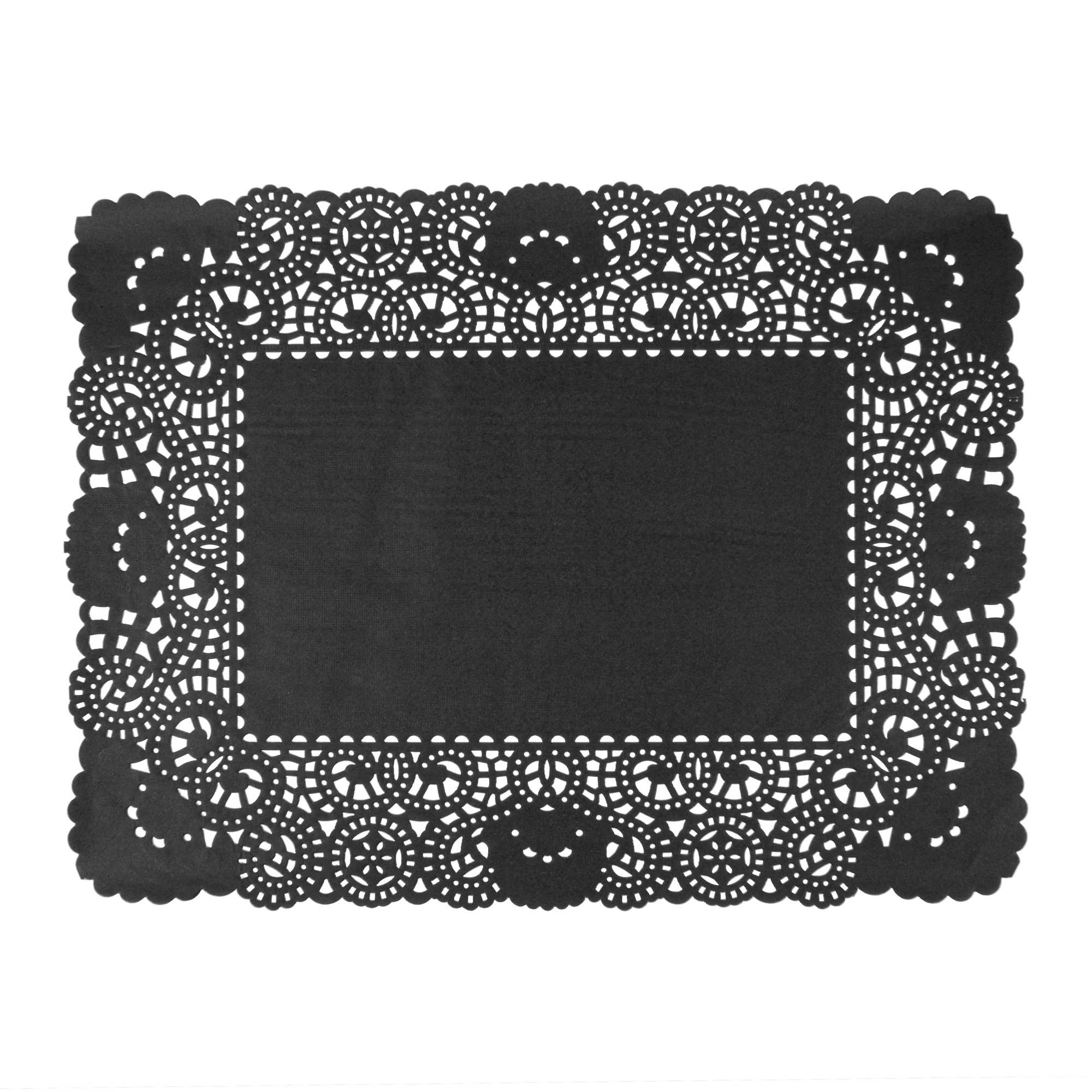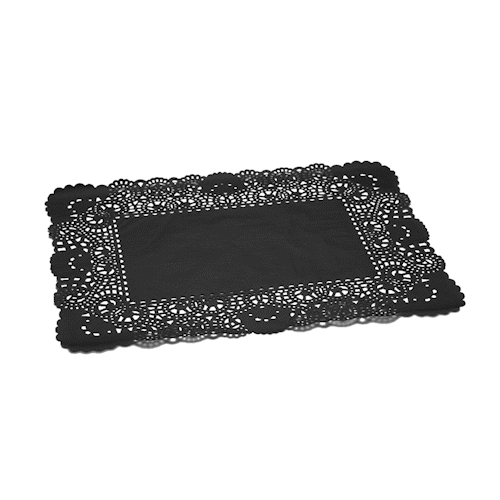 Elevate your dessert displays with our Pastry Tek Rectangle Black Paper Doilies. These paper doilies are crafted from high-quality materials, providing the durability needed to showcase desserts at bakeries or catered luncheons without tearing. Featuring lace-like details, these table doilies not only enhance the visual appeal of food presentations but also serve as functional barriers, protecting surfaces and absorbing moisture. The black colored paper doilies complement a wide range of table settings and themes, making them ideal for various events and occasions. Designed to be disposable, these small doilies eradicate the hassle of post-event cleanup, offering a convenient and time-saving solution for busy hosts and food establishments. Measuring 15.75 inches in length by 12 inches in width, these lace doilies are perfect for placing under cupcakes, dessert platter, finger foods, and small treats. Sold in a 100 count box.