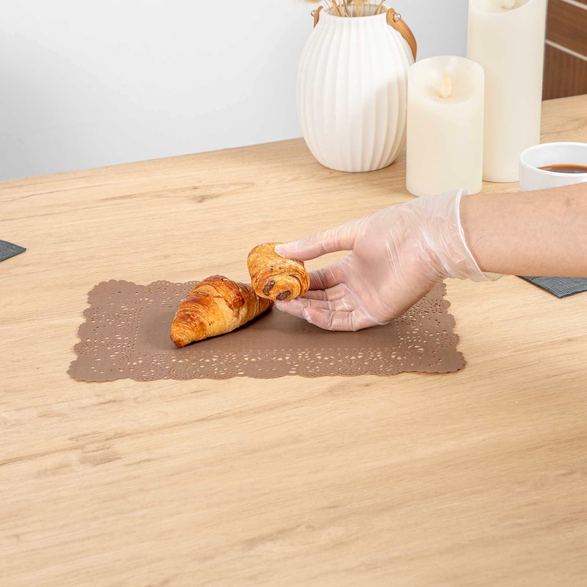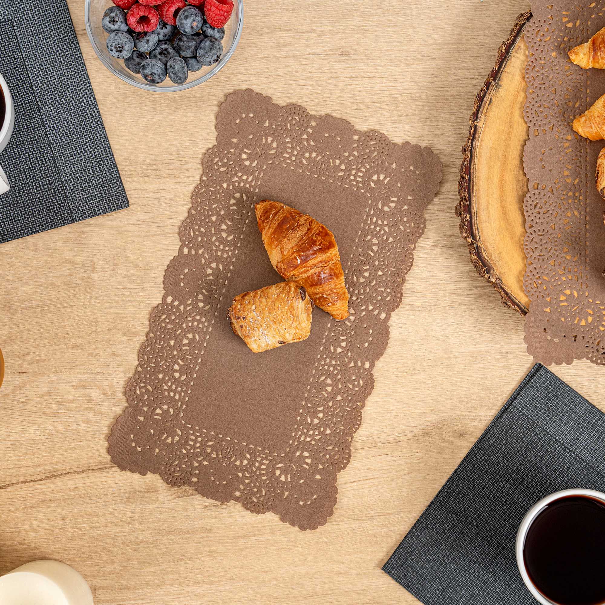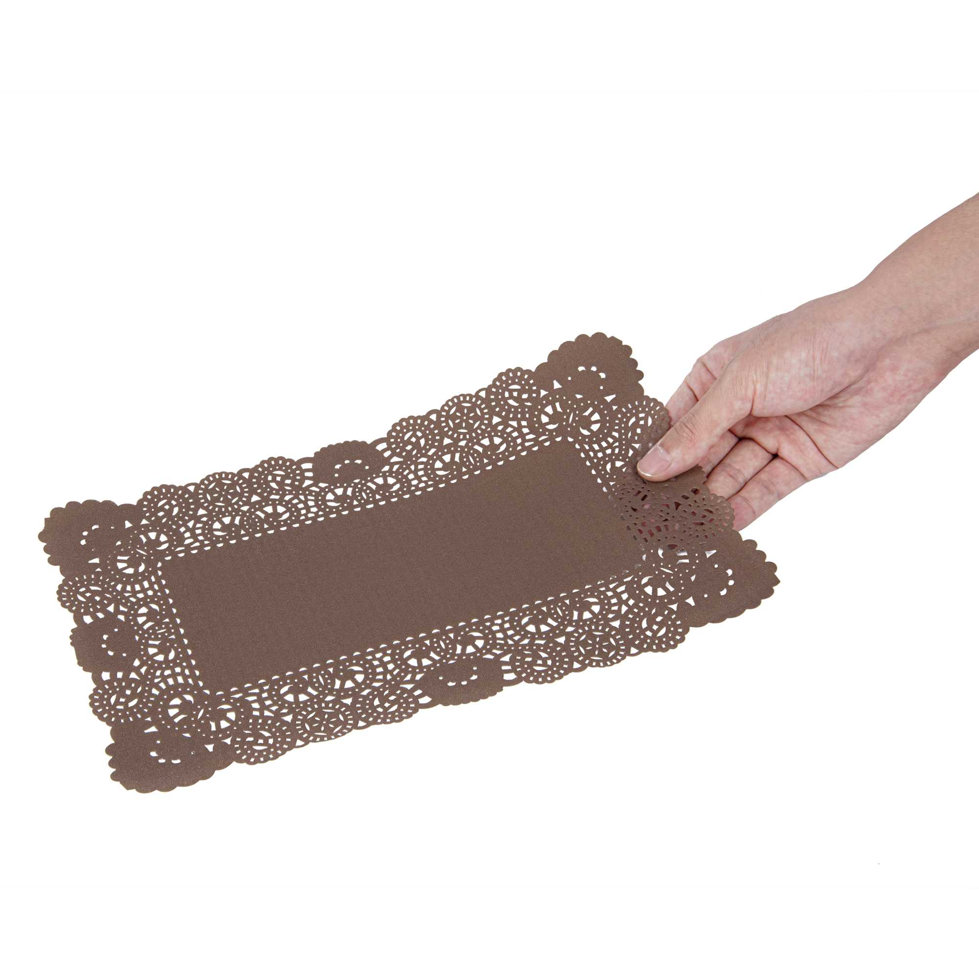 Enhance your dessert displays with our Pastry Tek Rectangle Brown Paper Doilies, the perfect blend of elegance and functionality. Crafted from high-quality paper, these durable lace doilies ensure your desserts remain intact at bakeries or catered luncheons without tearing. Featuring intricate lace-like details, these table doilies not only elevate the visual appeal of your food presentations but also act as functional barriers, protecting surfaces and absorbing moisture. With their brown colored paper finish, these doilies seamlessly complement a wide range of table settings and themes, making them ideal for various events and occasions. Designed for convenience, these disposable small doilies eradicate the hassle of post-event cleanup, offering a time-saving solution for busy hosts and food establishments. Measuring 12 inches in length by 7 inches in width, these paper doilies fit perfectly under cupcakes, petit fours, macarons, and other small treats. Sold in a 100 count box.