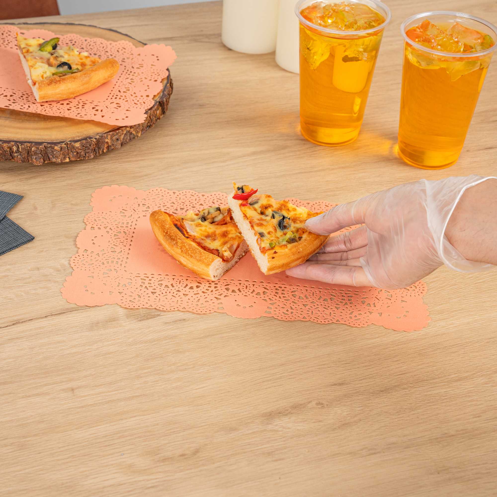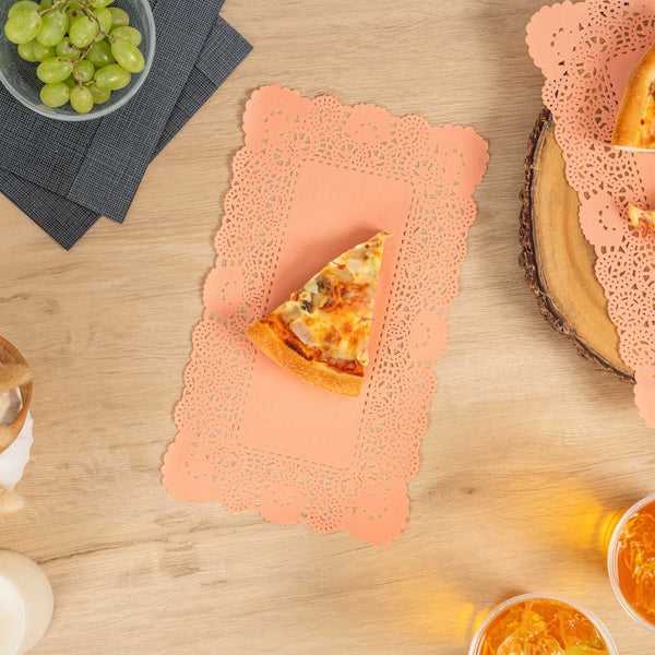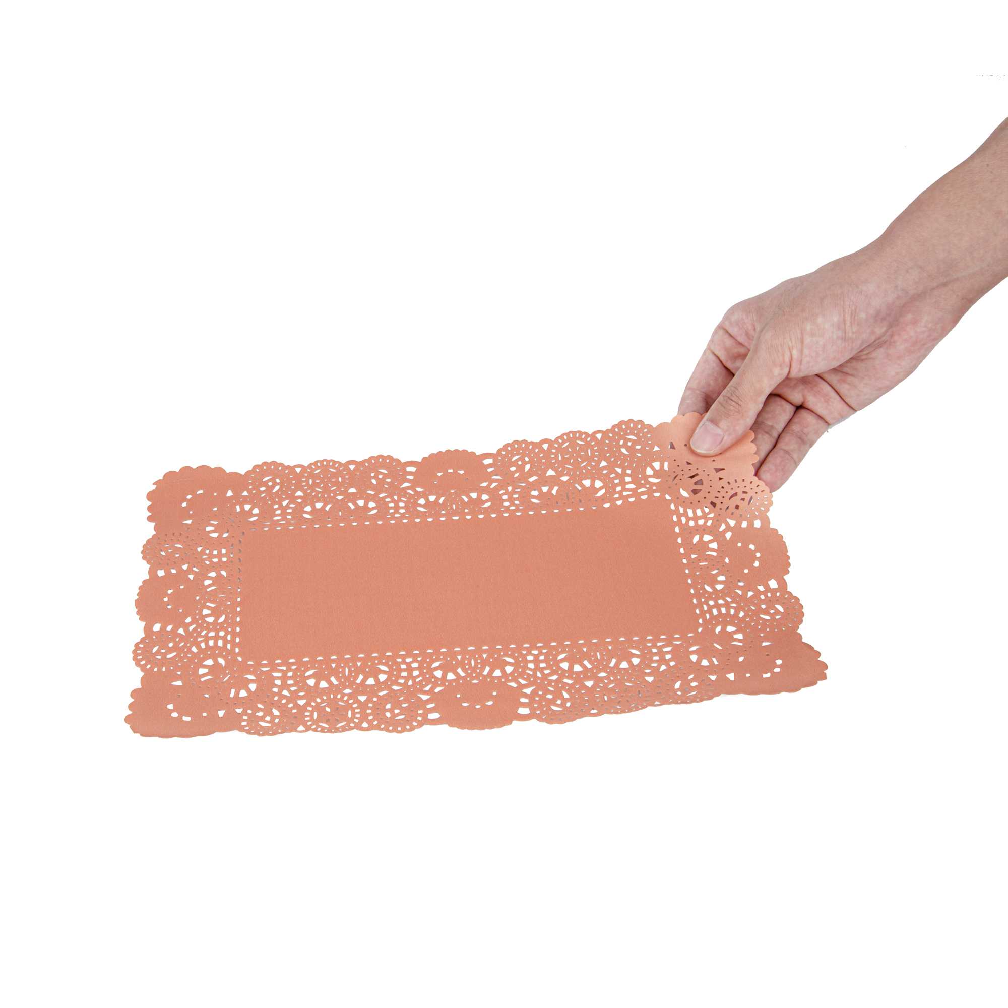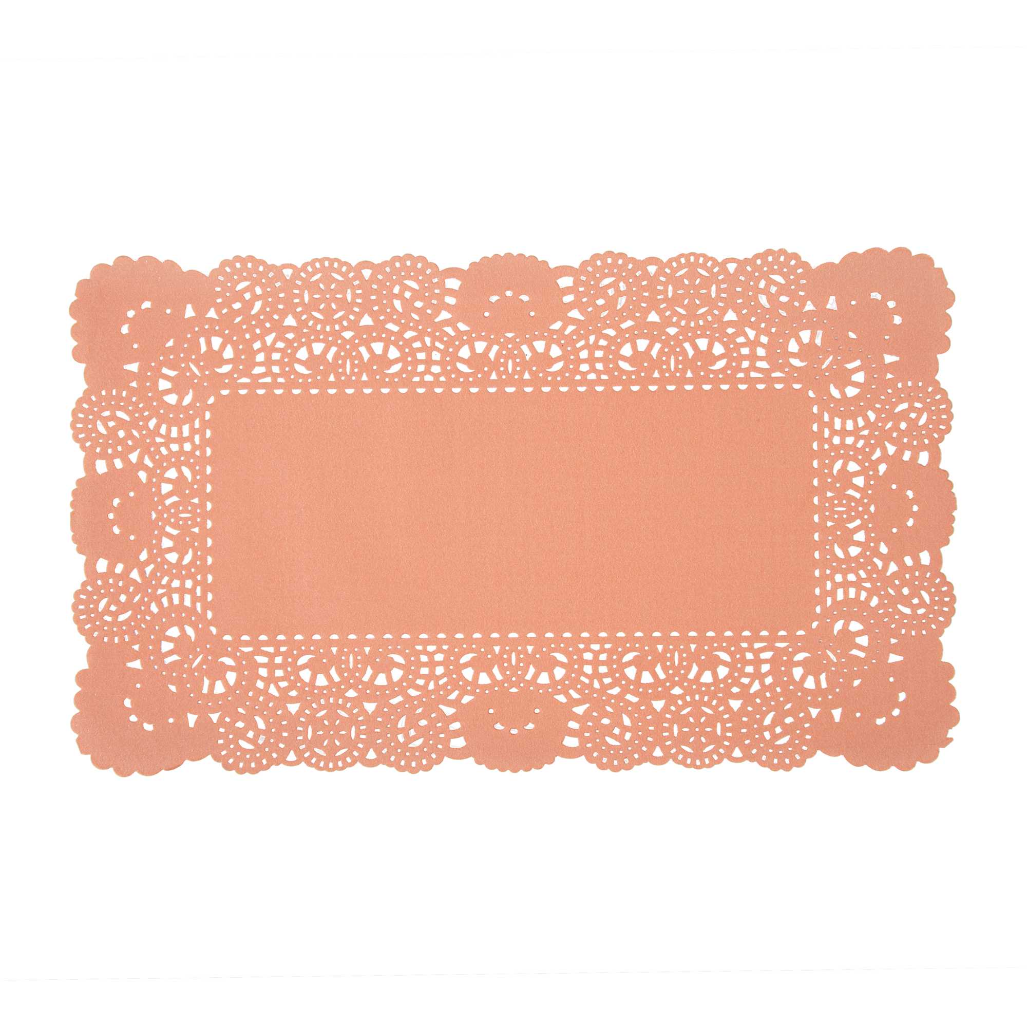 Elevate your dessert displays with our Pastry Tek Rectangle Coral Paper Doilies. Crafted from high-quality paper, these lace doilies provide durability while showcasing desserts at bakeries or catered luncheons without tearing or losing their structural integrity. Additionally, these paper doilies feature intricate lace-like details that enhance the visual appeal of your food presentations while serving as functional barriers, protecting surfaces and absorbing moisture. The coral colored finish of these table doilies allows them to complement a wide range of table settings and themes, making them an ideal choice for various events and occasions. Conveniently, these small doilies are disposable to eradicate the hassle of post-event cleanup, offering a time-saving solution for busy hosts and food establishments. Perfect for use under cupcakes, petit fours, macarons, and other small treats, these colored paper doilies measure 12 inches in length by 7 inches in width. Sold in a 4,000 count box.