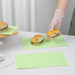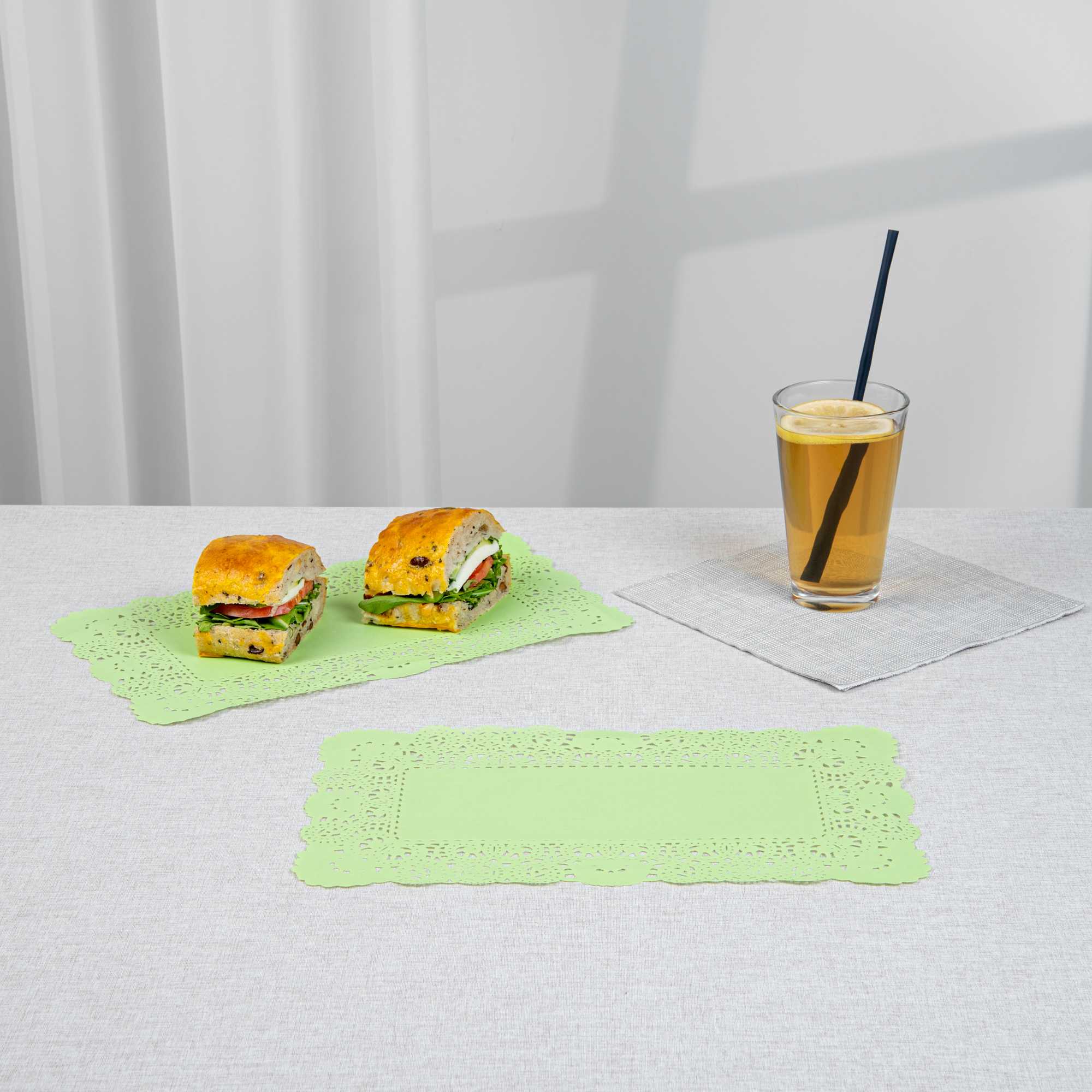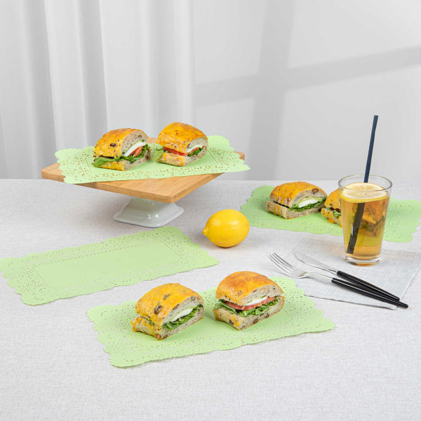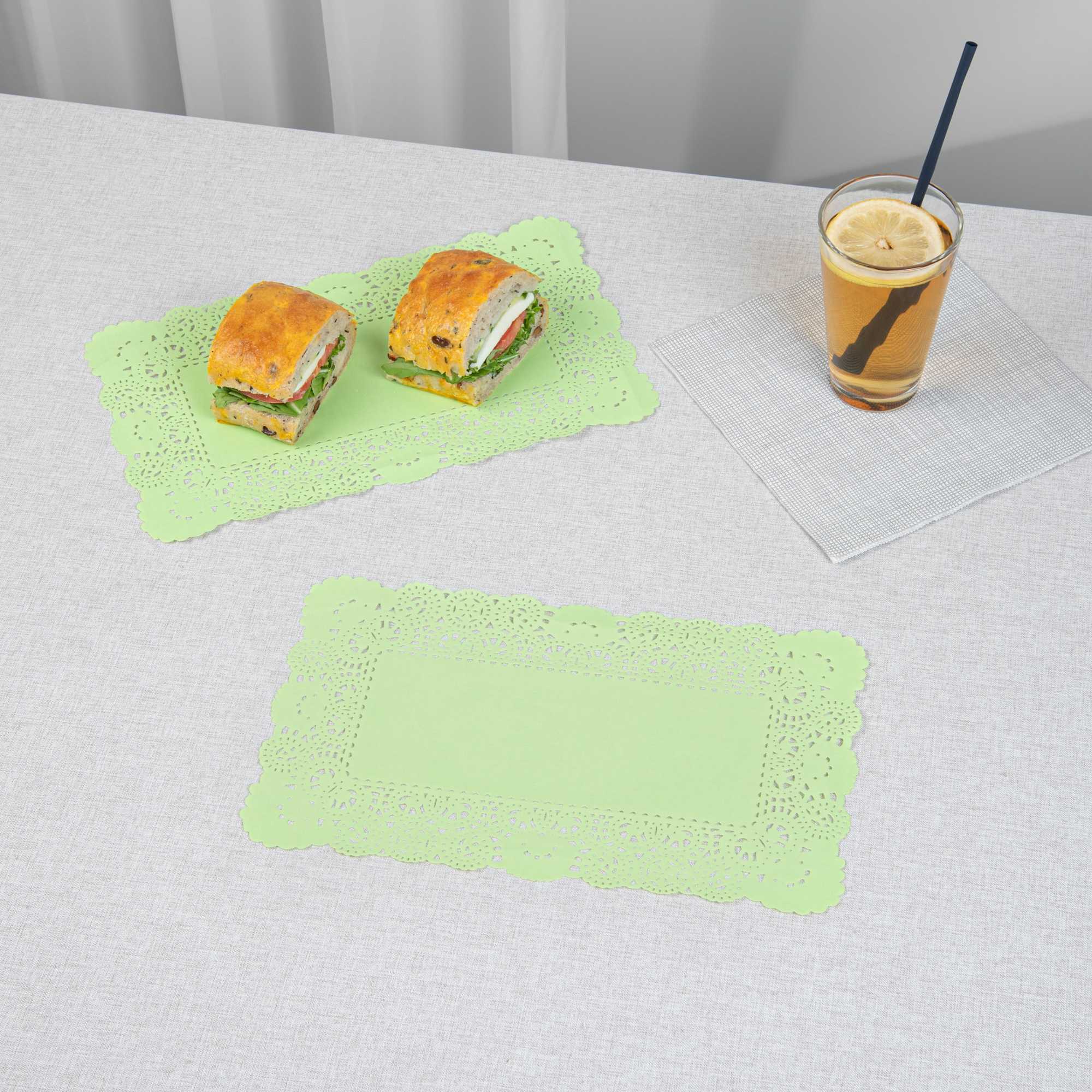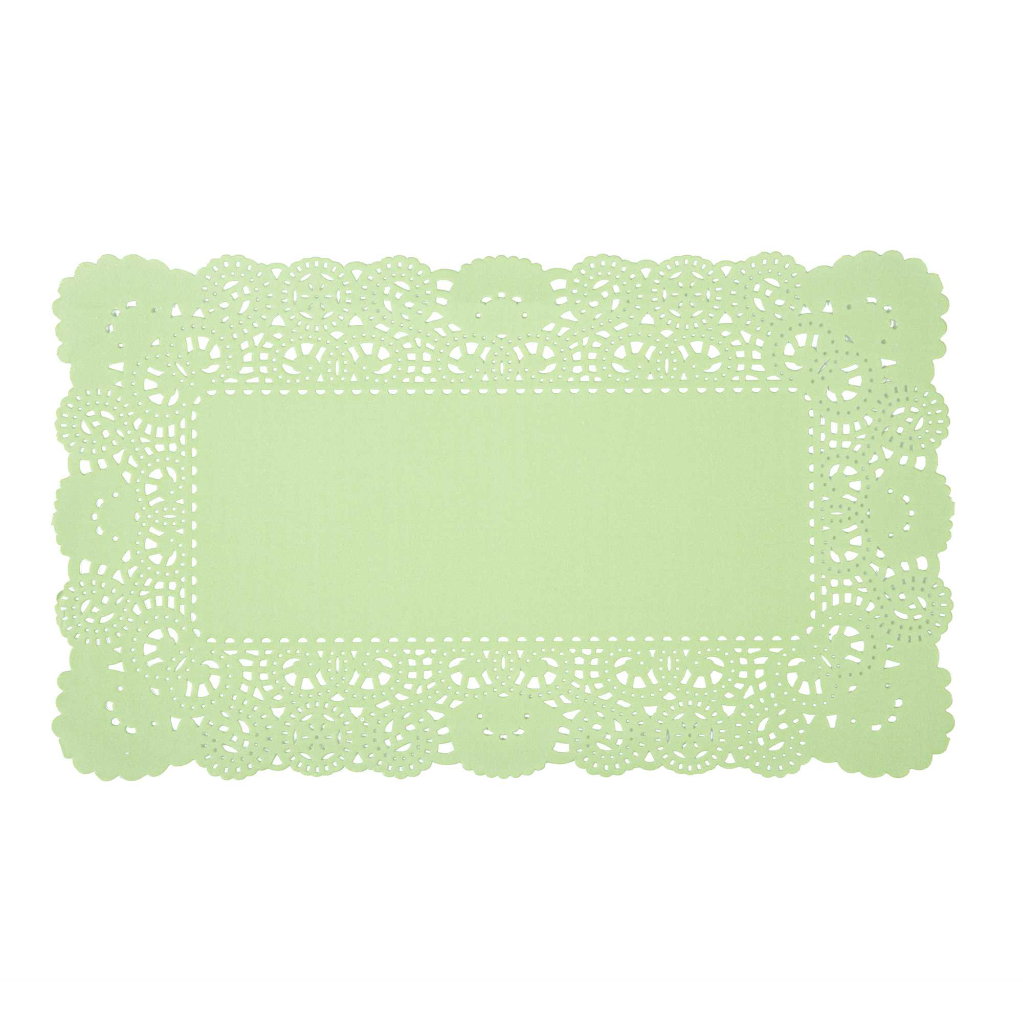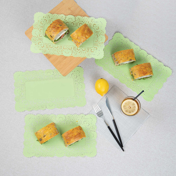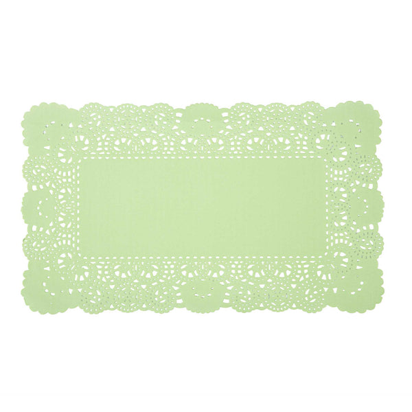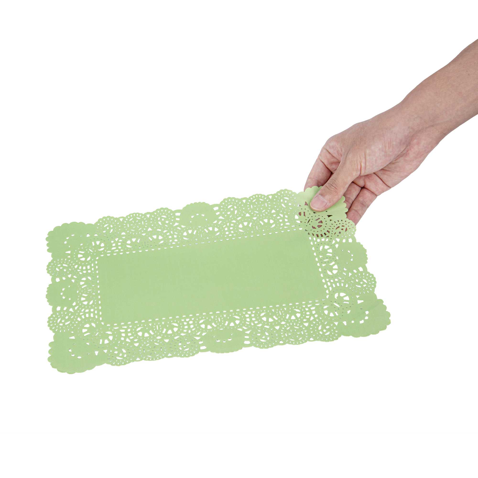 Elevate your dessert displays with our Pastry Tek Rectangle Green Paper Doilies for a touch of elegance and sophistication. Crafted from high-quality paper, these lace doilies provide exceptional durability, ensuring that desserts at catered luncheons remain intact without tearing or losing their shape. Featuring intricate lace-like details, these table doilies enhance the visual appeal of your food presentations while also serving as functional barriers, protecting surfaces, and absorbing moisture. The versatile colored paper doilies effortlessly complement a wide range of table settings and themes, making them perfect for various events and occasions. Designed to be disposable, these small doilies eradicate the hassle of post-event cleanup, providing a convenient and time-saving solution for busy hosts and food establishments. Use these charming paper doilies under cupcakes, petit fours, macarons, and other small treats to add a decorative flair. Measuring 12 inches in length by 7 inches in width, these lace doilies are the ideal size for a number of desserts. Sold in a 100 count box.