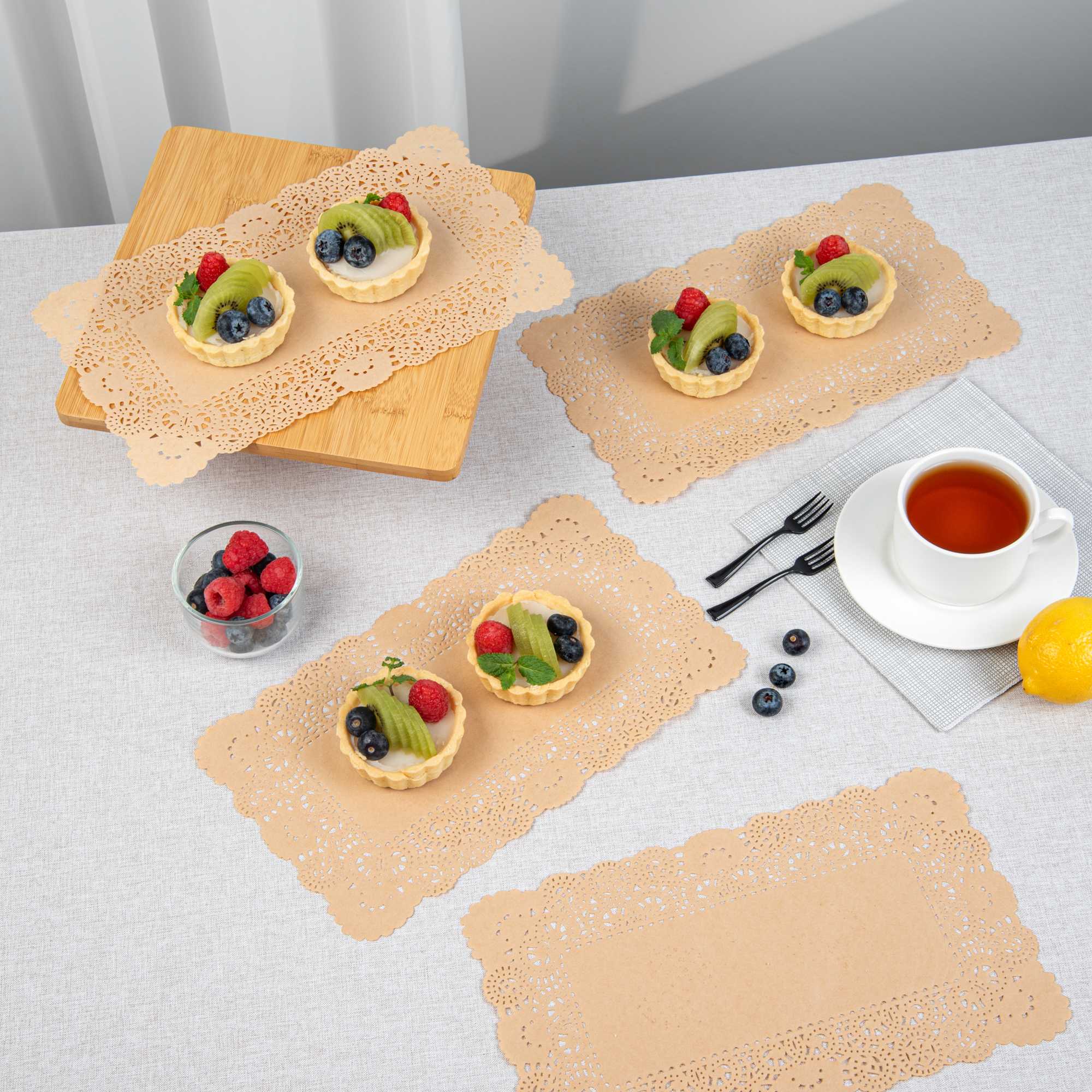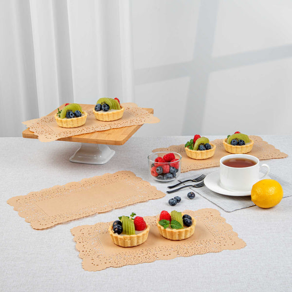 Enhance your dessert displays with our Pastry Tek Rectangle Kraft Paper Doilies. Crafted from high-quality paper, these lace doilies provide durability while displaying desserts at bakeries or catered luncheons without tearing or losing their structural integrity. The lace-like details of these table doilies increase the visual appeal of food presentations while serving as functional barriers, protecting surfaces, and absorbing moisture. Featuring a kraft finish, these paper doilies complement a wide range of table settings and themes, making them an ideal choice for various events and occasions. These disposable small doilies eradicate the hassle of post-event cleanup, offering a convenient and time-saving solution for busy hosts and food establishments. Use these small paper doilies under cupcakes, petit fours, macarons, and other small treats to add an elegant touch. Measuring 12 inches in length by 7 inches in width, these lace doilies fit perfectly on serving trays and dessert tables. Sold in a 4,000 count box.