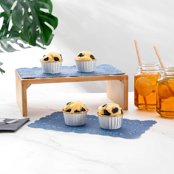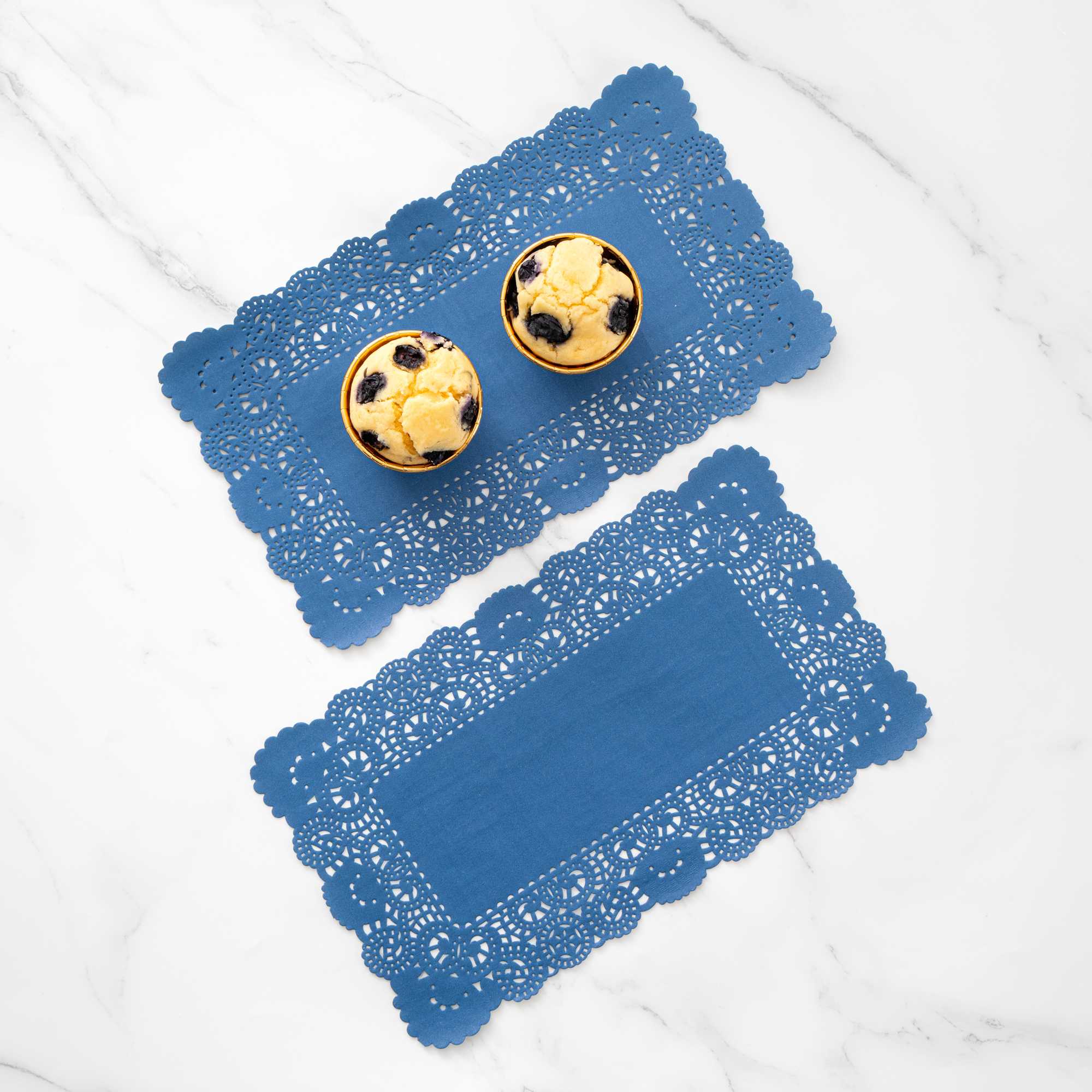 Enhance your dessert presentations with our Pastry Tek Rectangle Navy Blue Paper Doilies, designed to add an elegant touch to any display. Crafted from high-quality paper, these lace doilies provide durability while showcasing desserts at bakeries or catered luncheons without tearing or losing their structural integrity. Featuring delicate lace-like details, these table doilies increase the visual appeal of food presentations while serving as functional barriers that protect surfaces and absorb moisture. The navy blue colored finish of these paper doilies complements a wide range of table settings and themes, making them an ideal choice for various events and occasions. These disposable doilies eradicate the hassle of post-event cleanup, offering a convenient and time-saving solution for busy hosts and food establishments. Perfect for use under cupcakes, petit fours, macarons, and other small treats, these small doilies enhance the presentation of your delectable creations. Measuring 12 inches in length by 7 inches in width, these lace doilies fit perfectly on most dessert trays and platters. Sold in a 4,000 count box.
