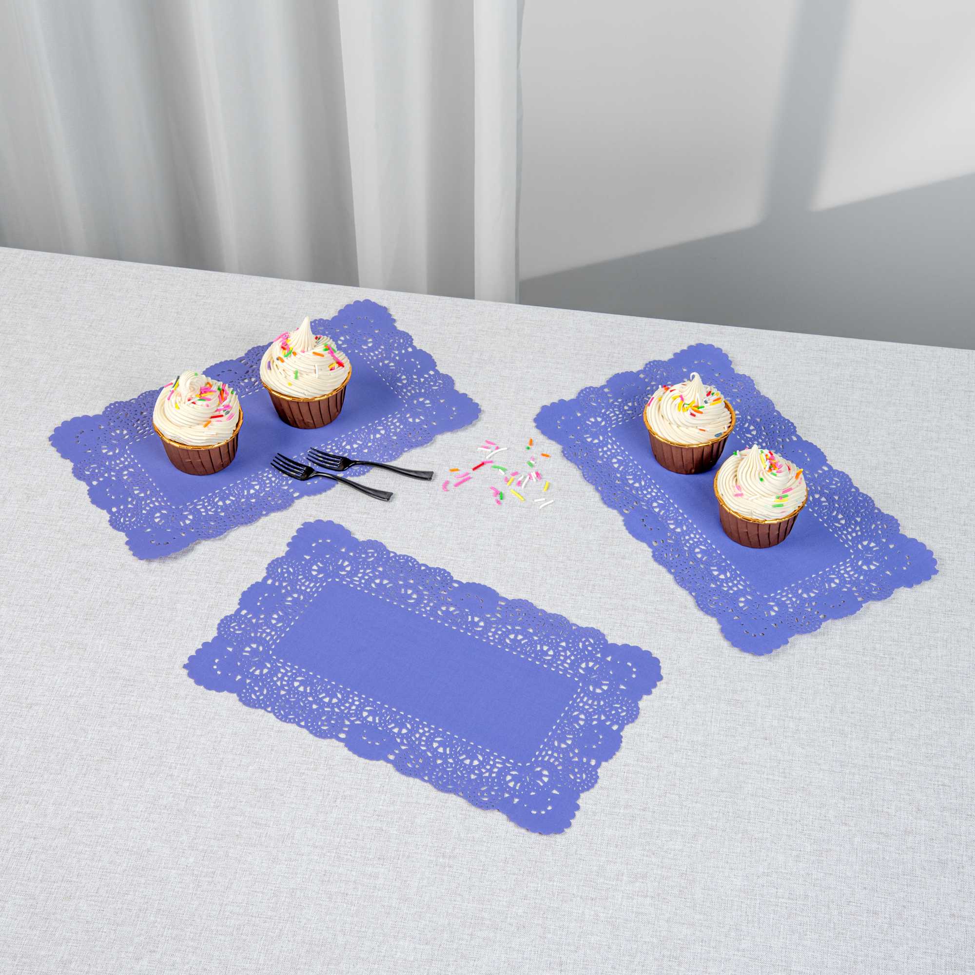 Elevate your dessert displays with our Pastry Tek Rectangle Purple Paper Doilies, designed to add an elegant touch to any setting. Crafted from high-quality paper, these durable lace doilies ensure your desserts and other desserts remain beautifully presented without tearing. Featuring intricate lace-like details, these table doilies enhance the visual appeal of food presentations while serving as functional barriers that protect surfaces and absorb moisture. The purple finish of these colored paper doilies adds versatility, allowing them to complement a wide range of table settings and themes, making them ideal for various events and occasions. These disposable paper doilies eradicate the hassle of post-event cleanup, offering a convenient and time-saving solution for busy hosts and food establishments. Perfect for use under cupcakes, petit fours, macarons, and other small treats, these small doilies measure 12 inches in length by 7 inches in width. Sold in a 100 count box.
