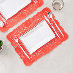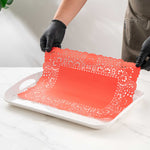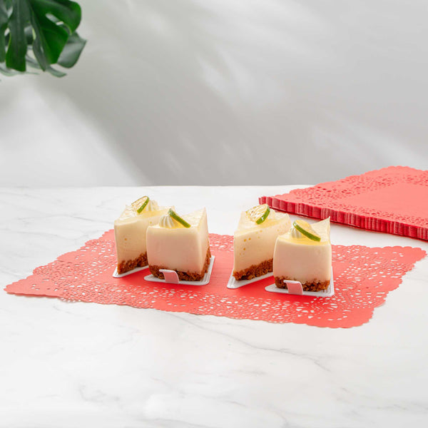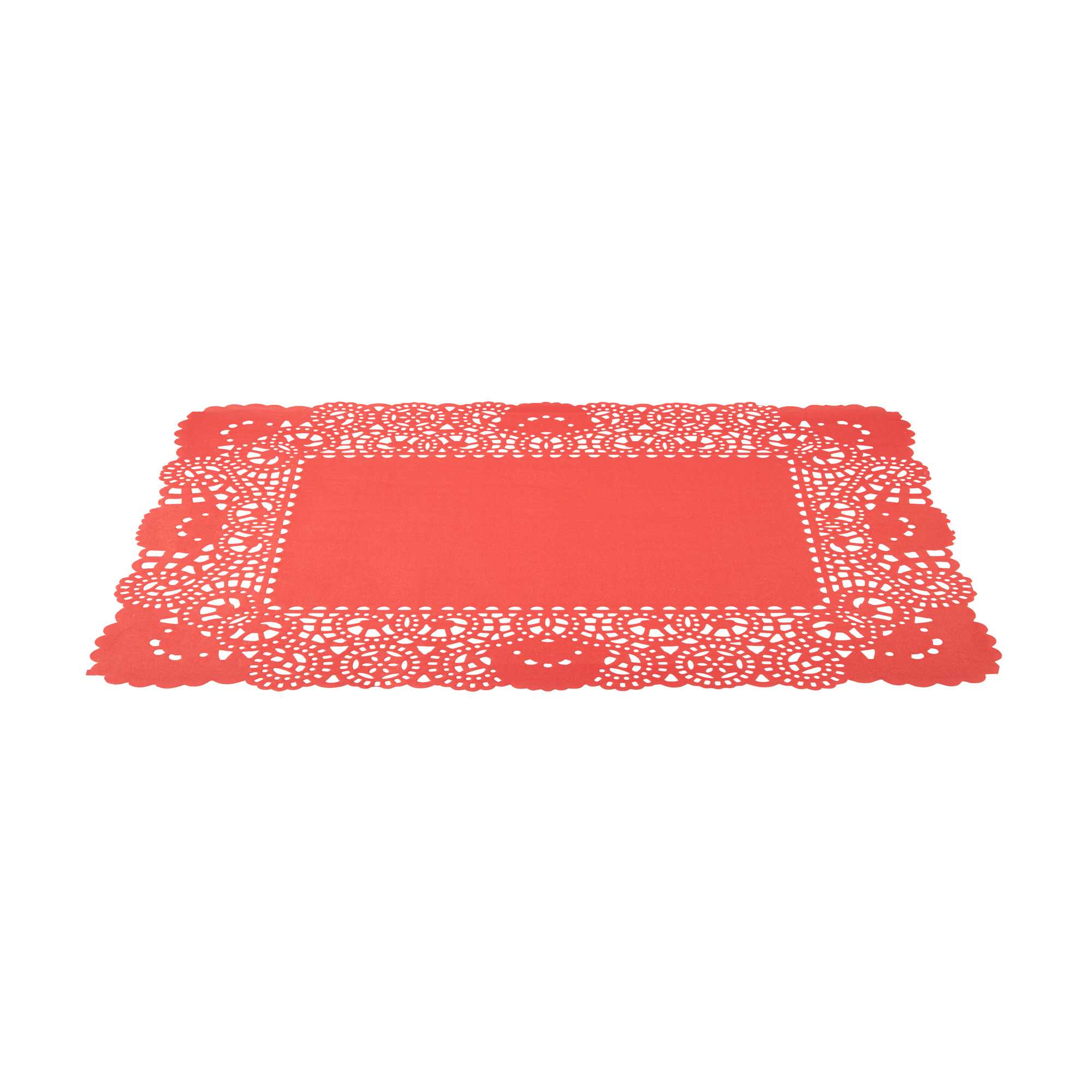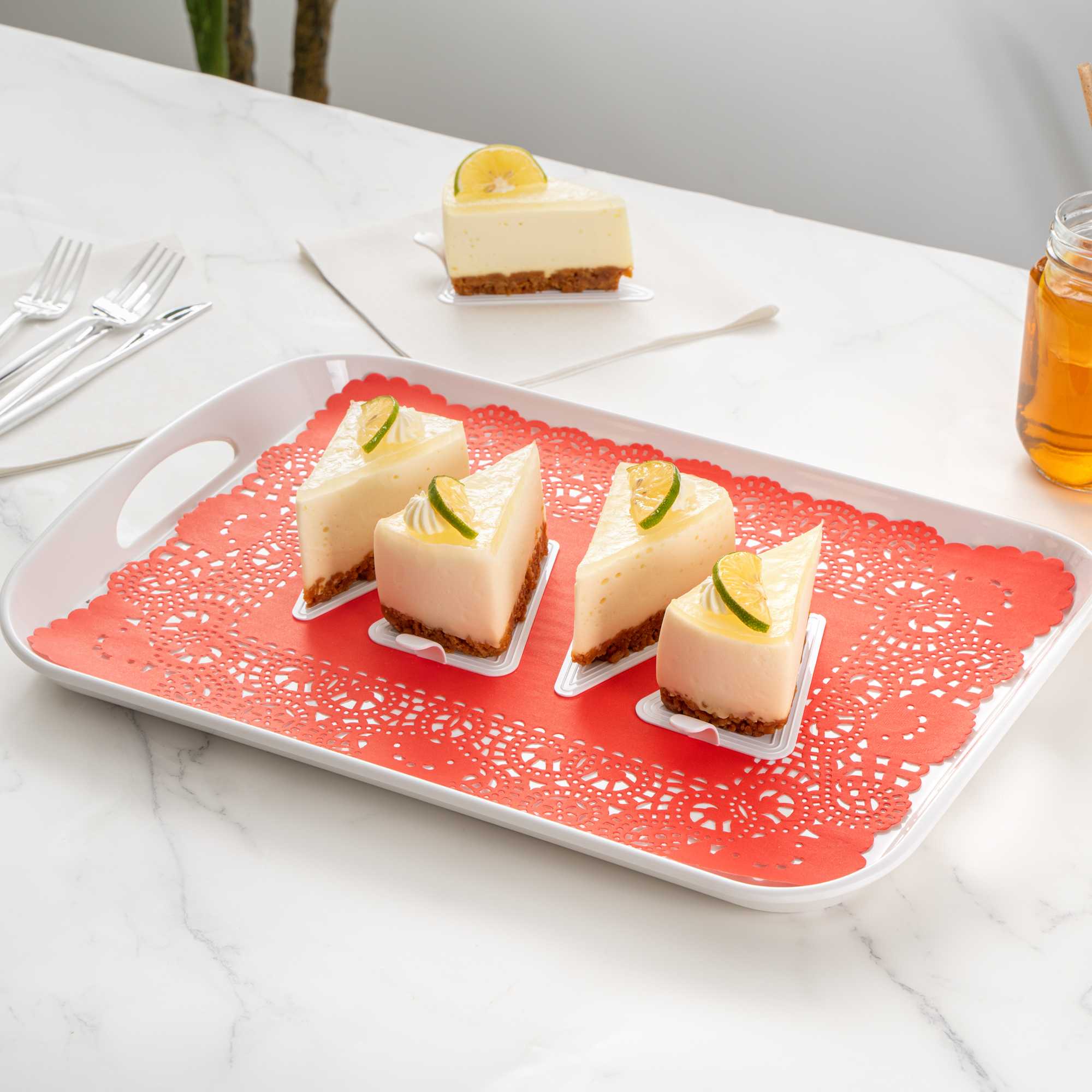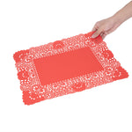 Elevate your dessert displays with our Pastry Tek Rectangle Red Paper Doilies, perfect for showcasing your culinary creations. Crafted from high-quality paper, these lace doilies provide durability, allowing you to present desserts at bakeries or catered luncheons without tearing or losing their structural integrity. The intricate lace-like details of these table doilies enhance the visual appeal of food presentations while also serving as functional barriers, protecting surfaces and absorbing moisture. Versatile in their red colored finish, these colored paper doilies complement a wide range of table settings and themes, making them an ideal choice for various events and occasions. These small doilies are disposable, eliminating the hassle of post-event cleanup and offering a convenient, time-saving solution for busy hosts and food establishments. Measuring 15.75 inches in length by 12 inches in width, these lace doilies are perfectly sized for under cupcakes, dessert platter, finger foods, and small treats. Sold in a 100 count box.
