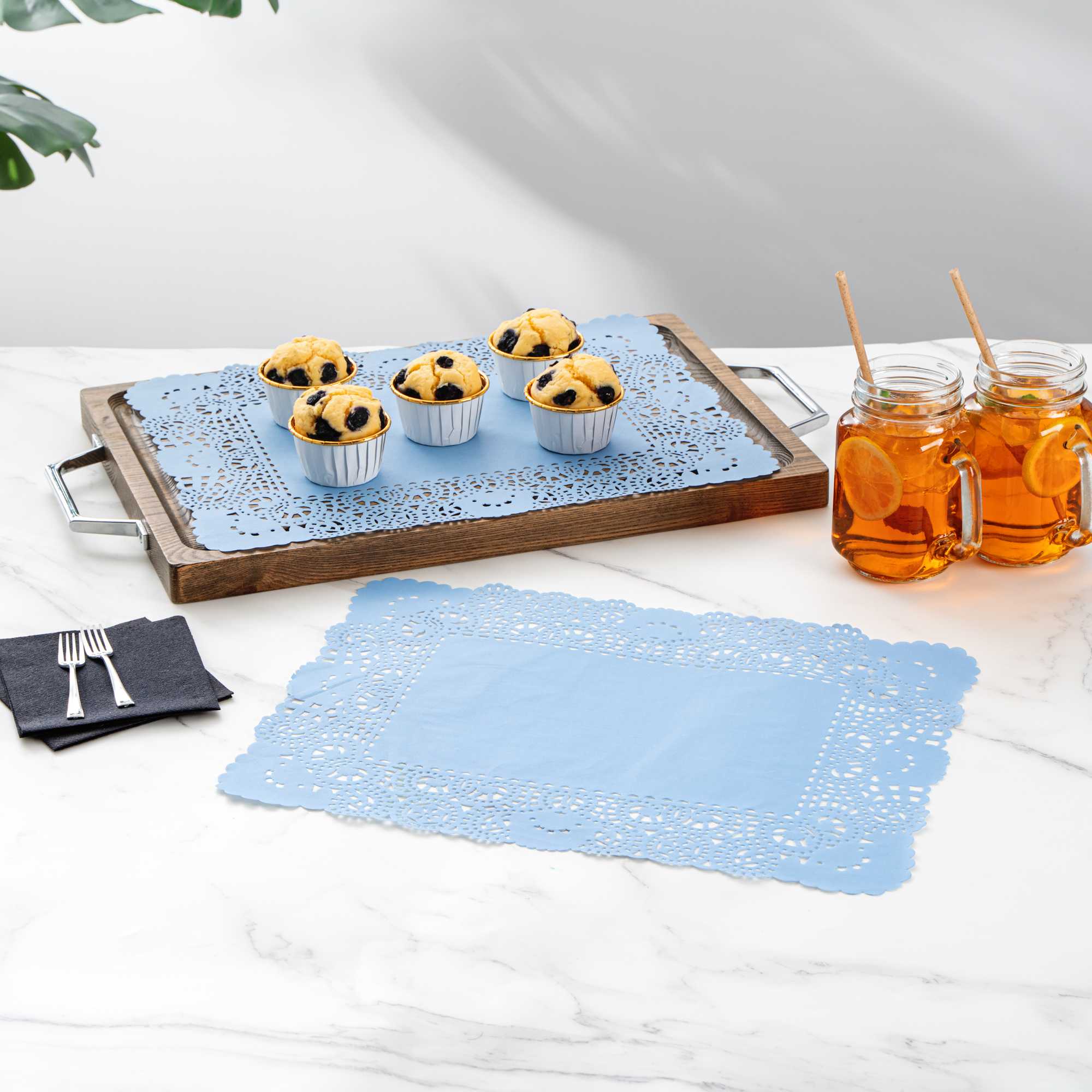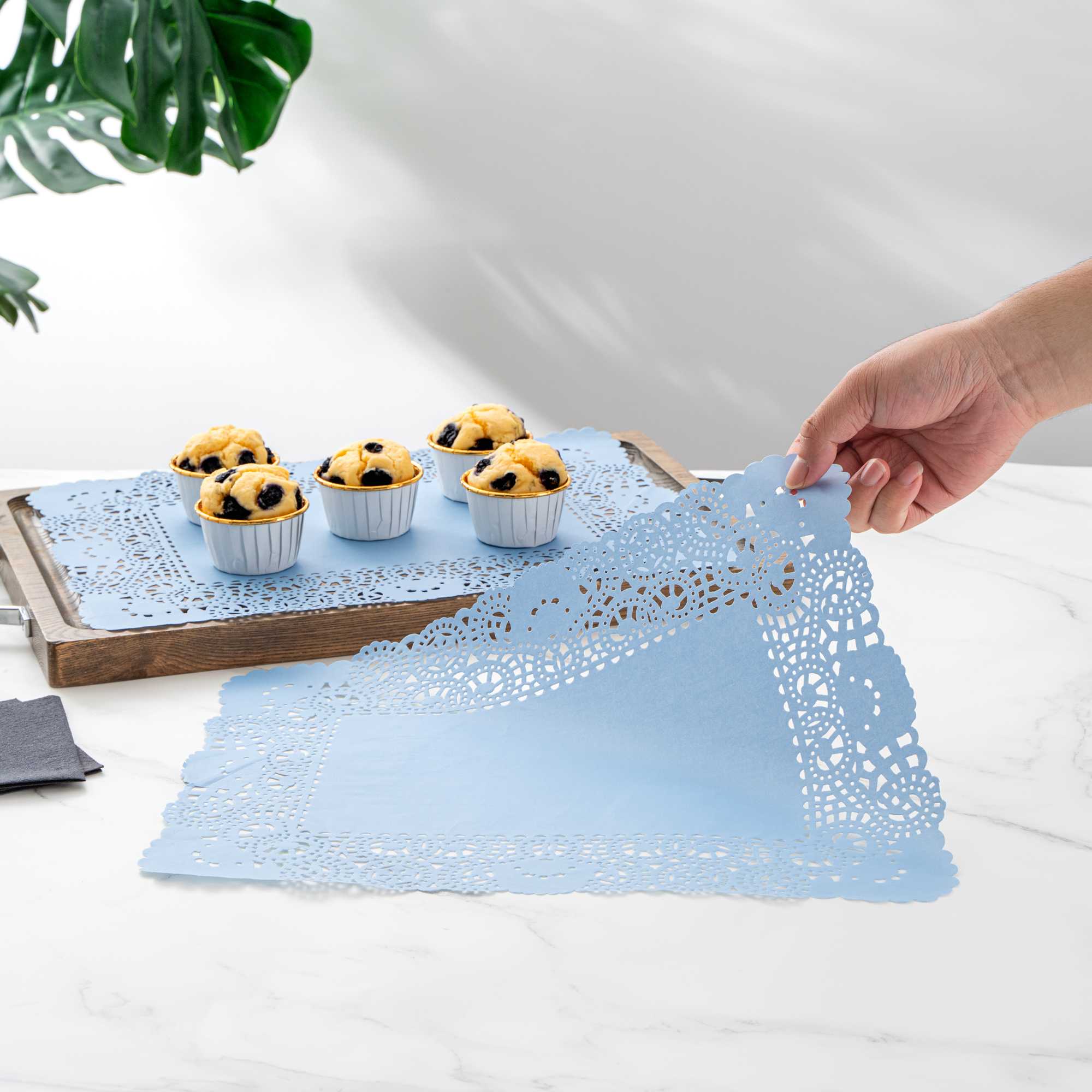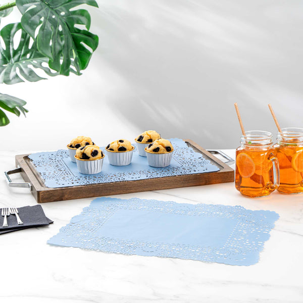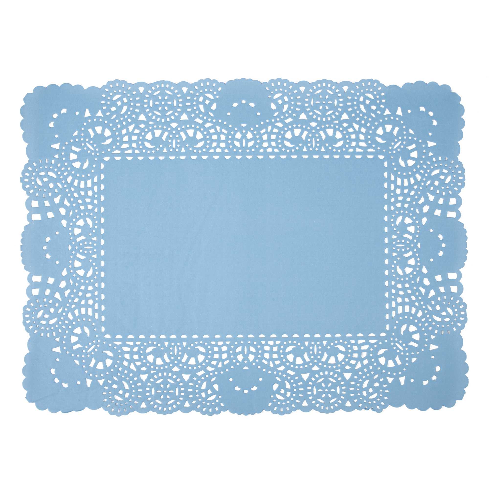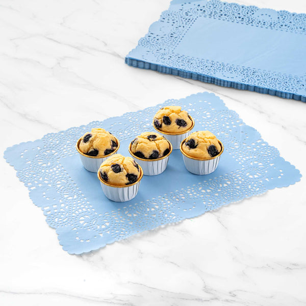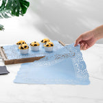 Elevate your dessert displays with our Pastry Tek Rectangle Sky Blue Paper Doilies. Crafted from high-quality paper, these lace doilies ensure durability while showcasing desserts at bakeries or catered luncheons without tearing or losing their structural integrity. Featuring intricate lace-like details, these table doilies not only enhance the visual appeal of food presentations but also serve as functional barriers, protecting surfaces and absorbing moisture. The versatile sky blue finish of these colored paper doilies complements a wide range of table settings and themes, making them perfect for various events and occasions. Designed to be disposable, these small doilies eradicate the hassle of post-event cleanup, providing a convenient and time-saving solution for busy hosts and food establishments. Measuring 15.75 inches in length by 12 inches in width, these paper doilies are ideal for use under cupcakes, dessert platter, finger foods, and small treats. Sold in a 100 count box.