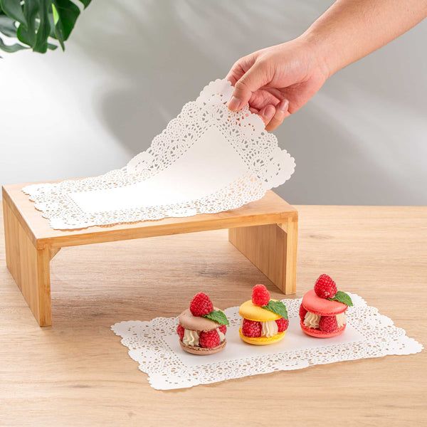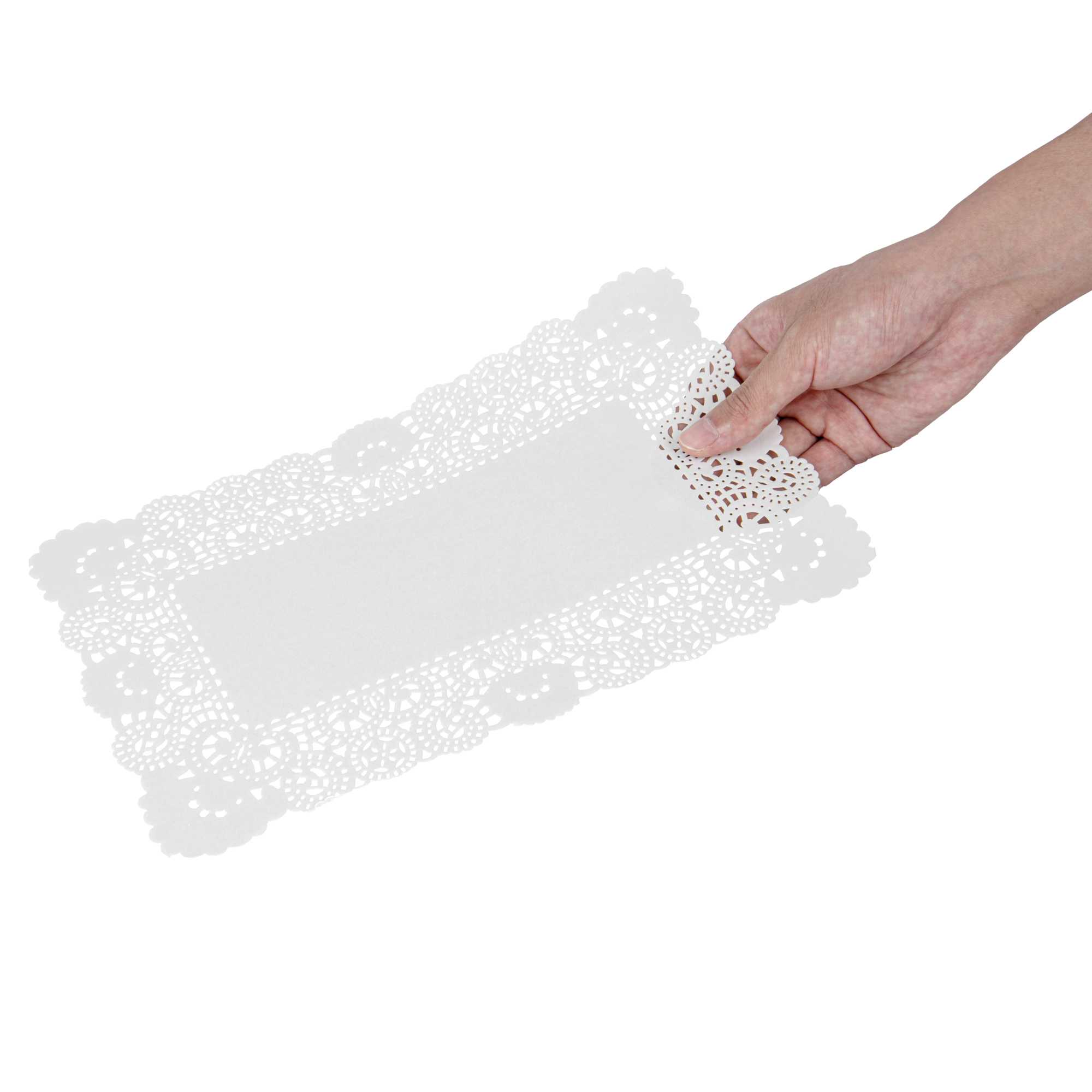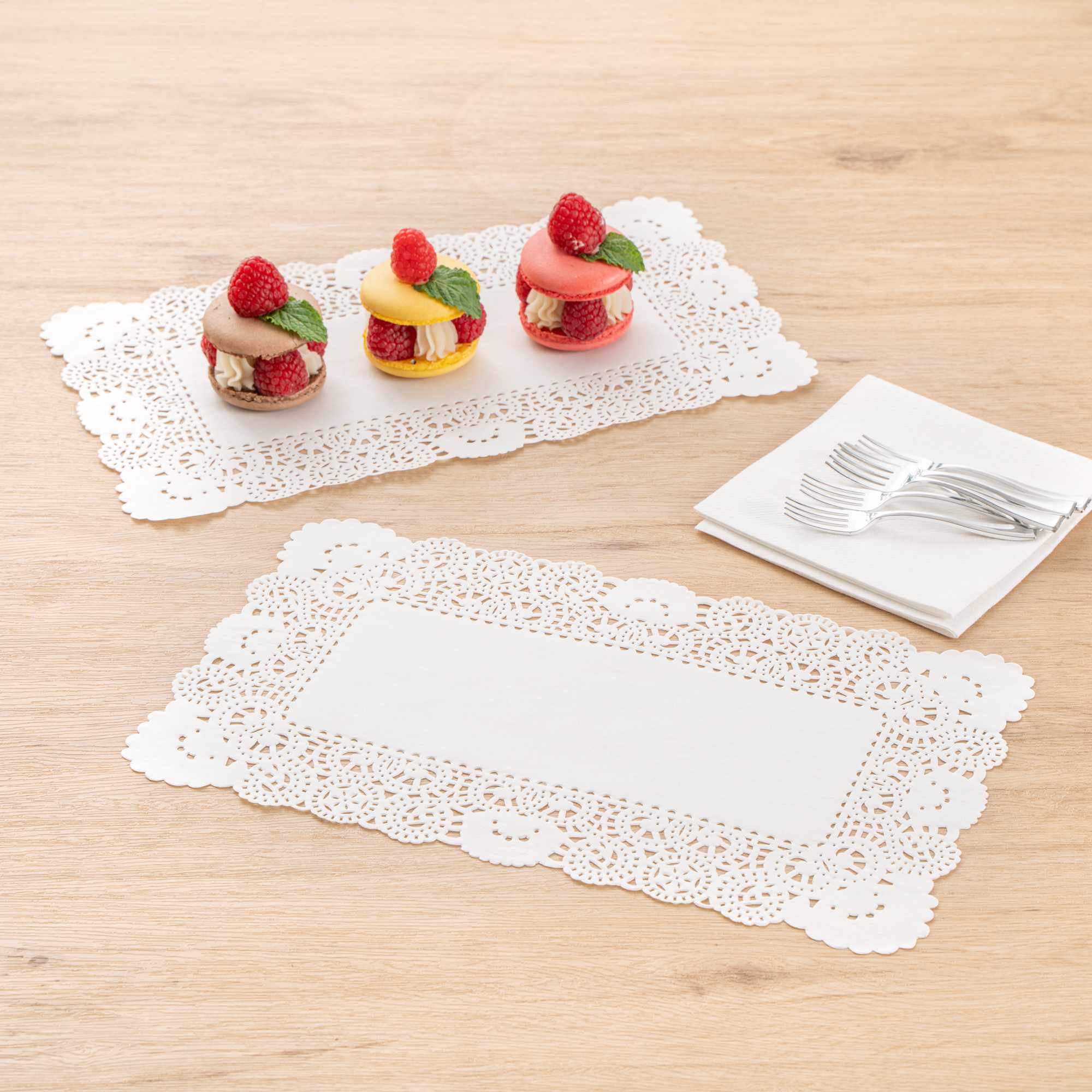 Enhance the elegance of your dessert displays with our Pastry Tek Rectangle White Paper Doilies. Crafted from high-quality paper, these durable lace doilies ensure that desserts at bakeries or catered luncheons remain intact without tearing or losing their structural integrity. Designed with intricate lace-like details, these table doilies not only increase the visual appeal of food presentations but also serve as functional barriers, protecting surfaces and absorbing moisture. The white colored paper doilies complement a wide range of table settings and themes, making them an ideal choice for various events and occasions. These disposable doilies eradicate the hassle of post-event cleanup, offering a convenient and time-saving solution for busy hosts and food establishments. Perfect for use under cupcakes, petit fours, macarons, and other small treats, these small paper doilies measure 12 inches in length by 7 inches in width. Sold in a 100 count box.