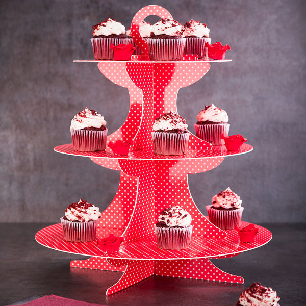 RED CARDBOARD CUPCAKE STAND - 3 TIER, WHITE POLKA DOTS
