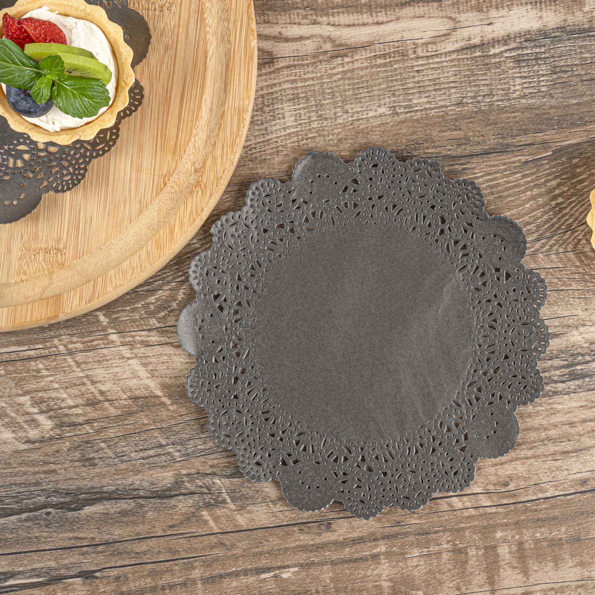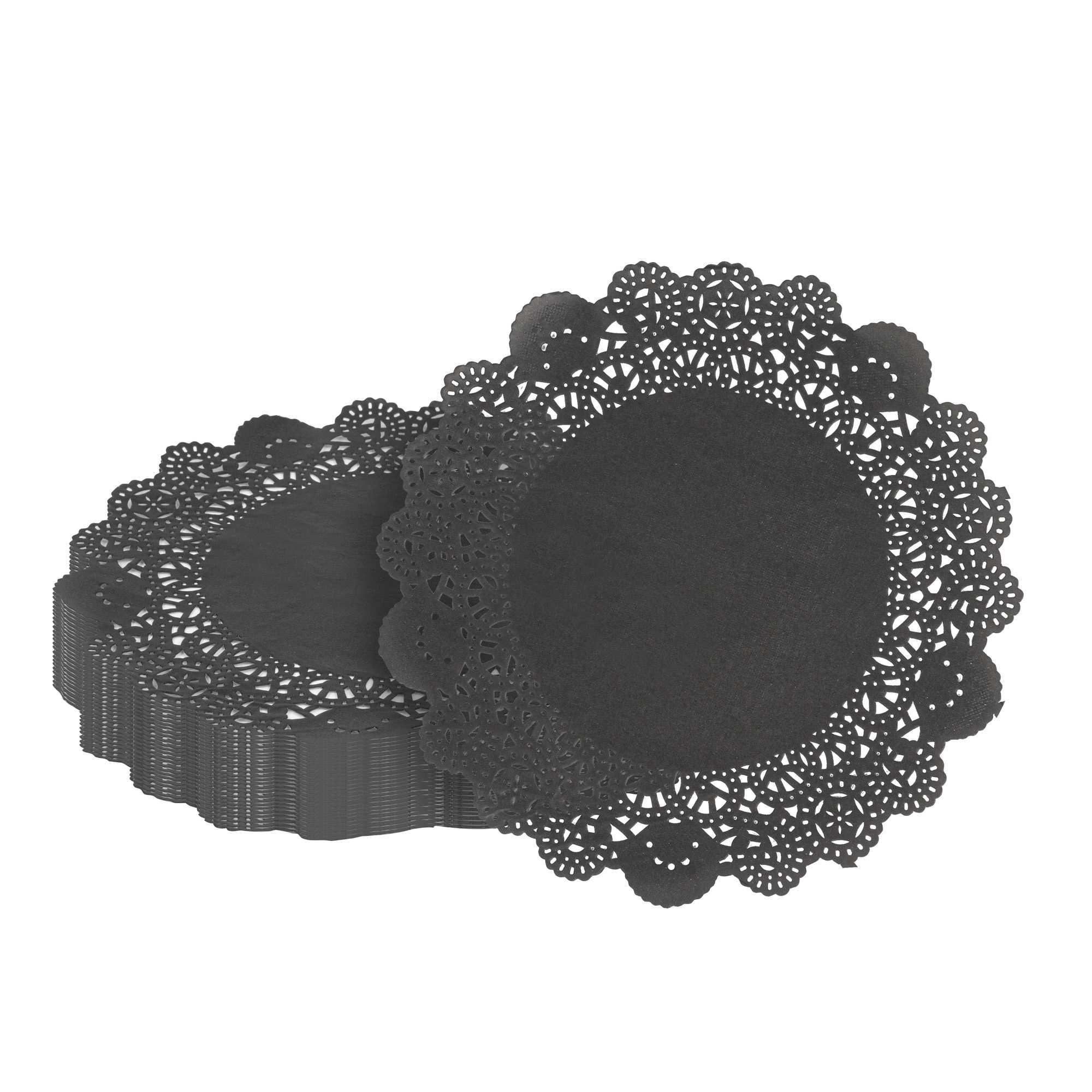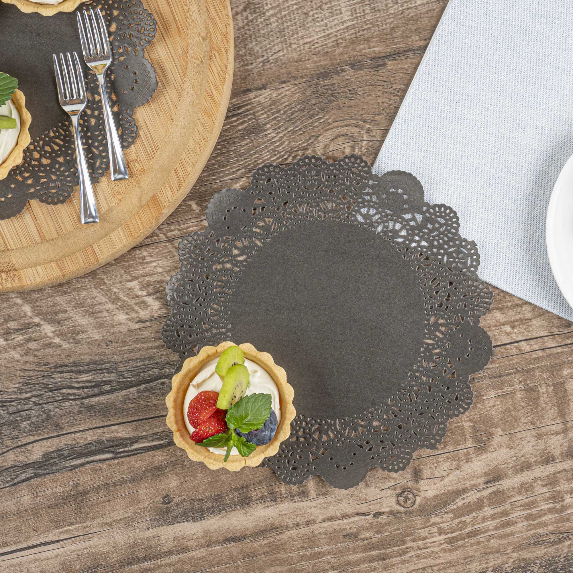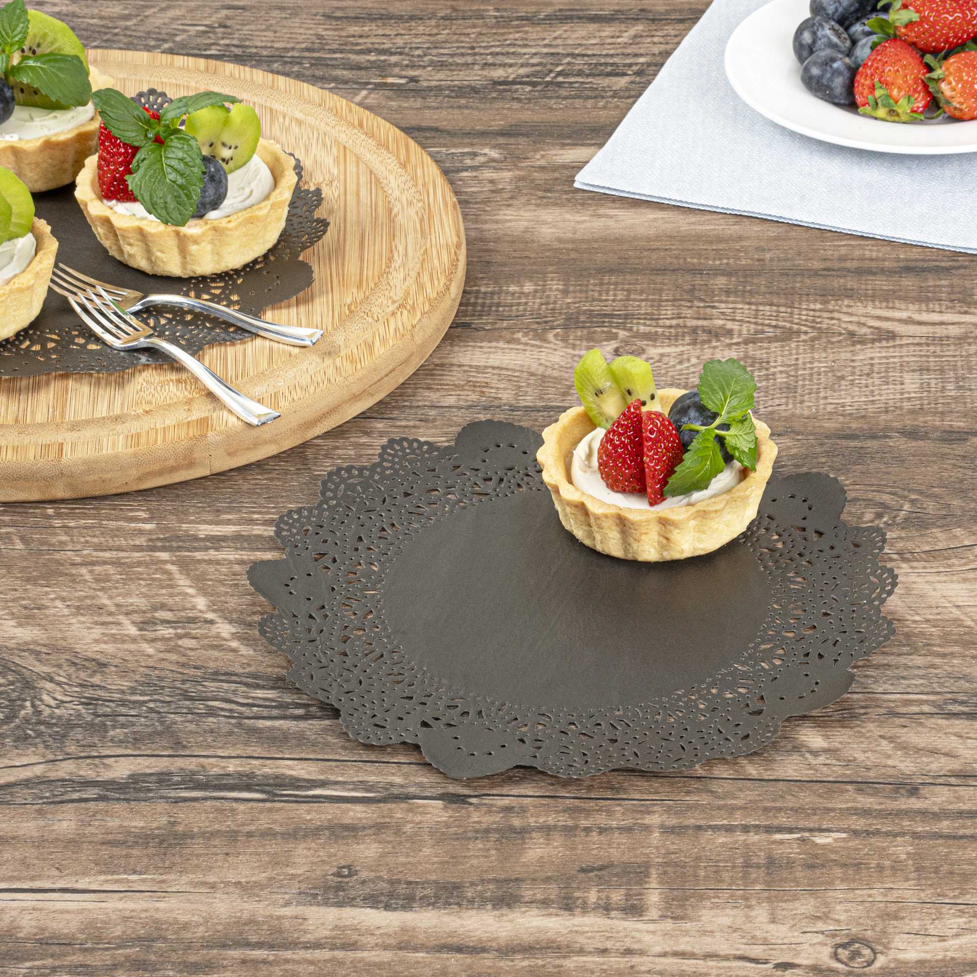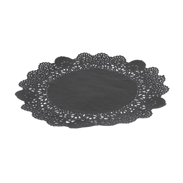 Elevate your dessert displays with our Pastry Tek Round Black Paper Doilies, designed to add an elegant touch to any table setting. Crafted from high-quality paper, these durable paper doilies ensure your desserts stay intact at bakeries or catered luncheons without tearing or losing their structural integrity. Featuring intricate lace-like details, these table doilies increase the visual appeal of food presentations while serving as functional barriers that protect surfaces and absorb moisture. The black colored paper doilies effortlessly complement a wide range of table settings and themes, making them an ideal choice for various events and occasions. Disposable by design, these lace doilies eradicate the hassle of post-event cleanup, offering a convenient and time-saving solution for busy hosts and food establishments. Perfect for use under cupcakes, petit fours, macarons, and other small treats, these small doilies measure 8 inches in diameter. Sold in a 100 count box.