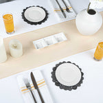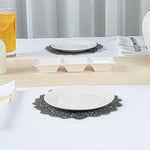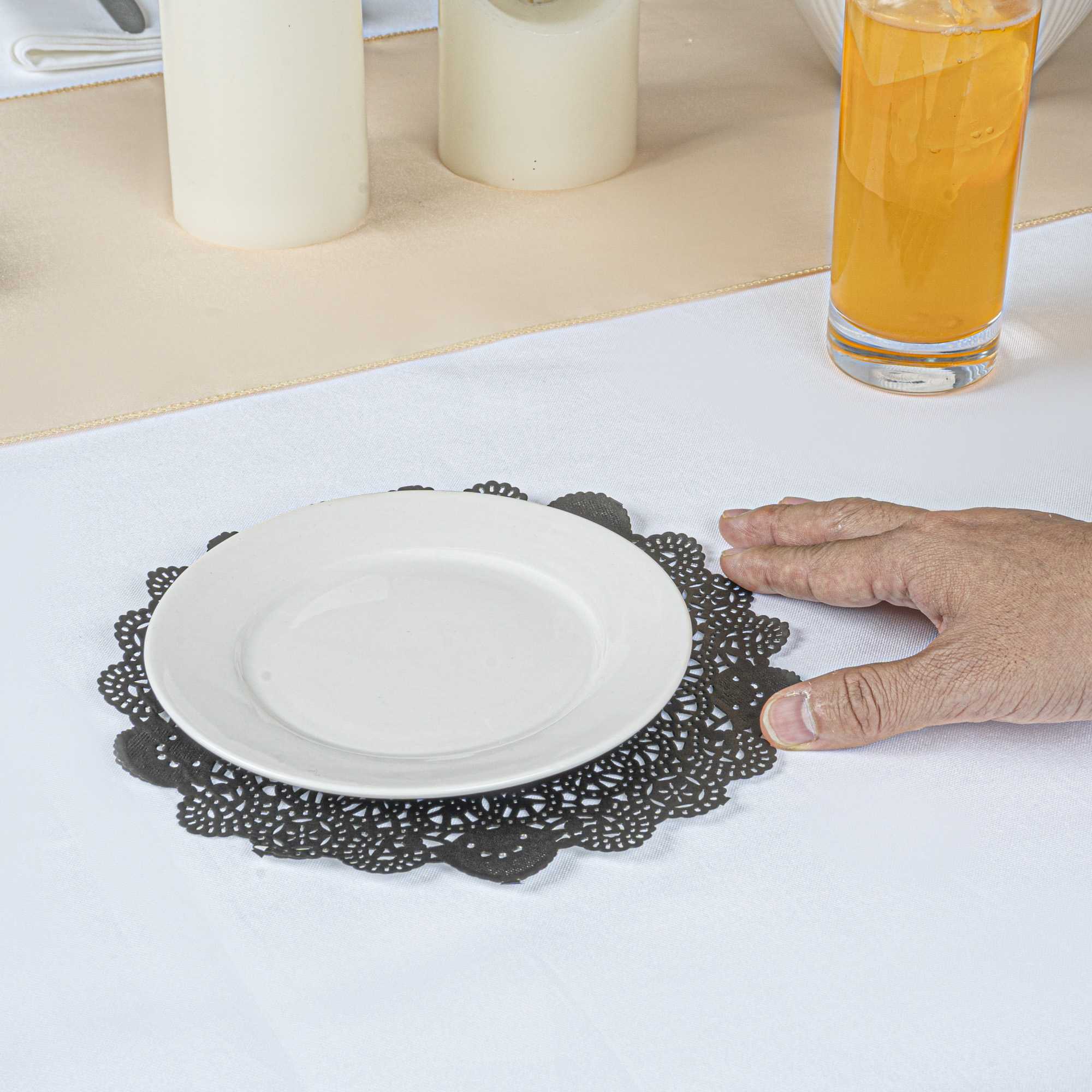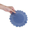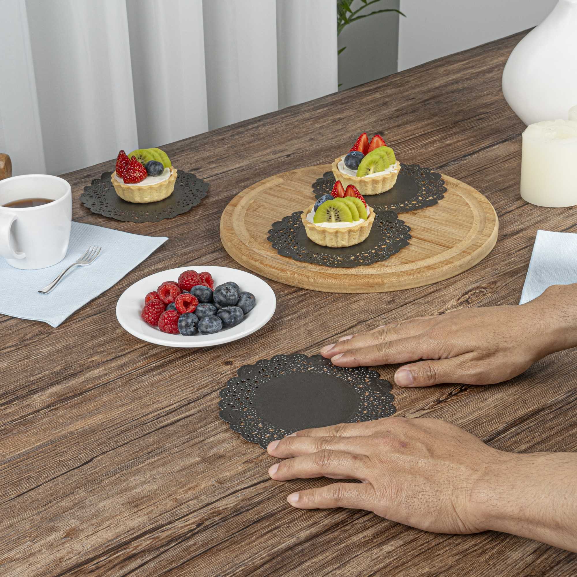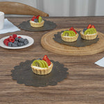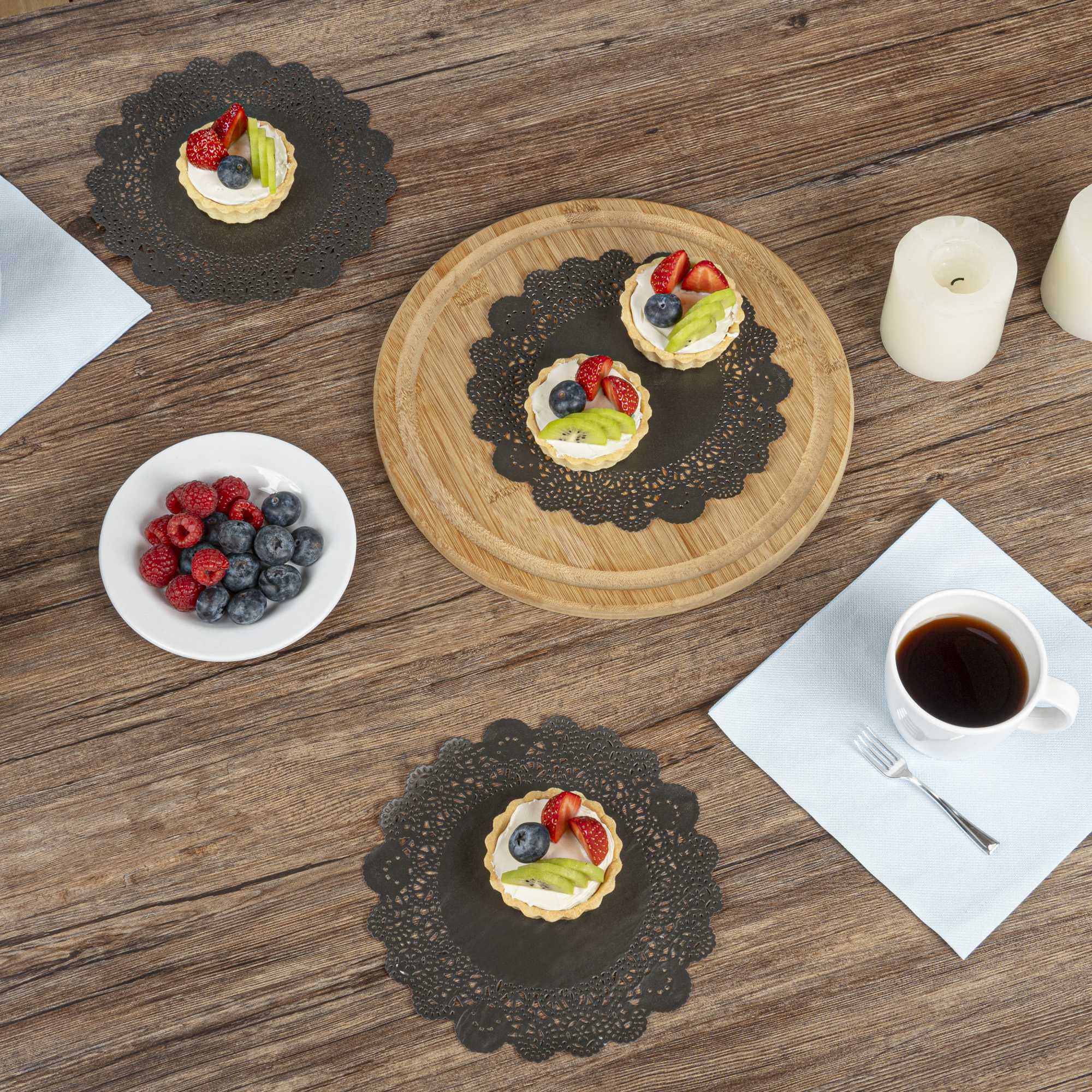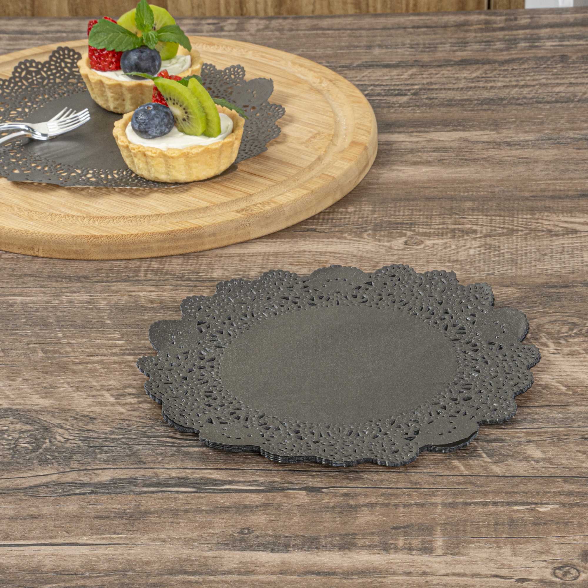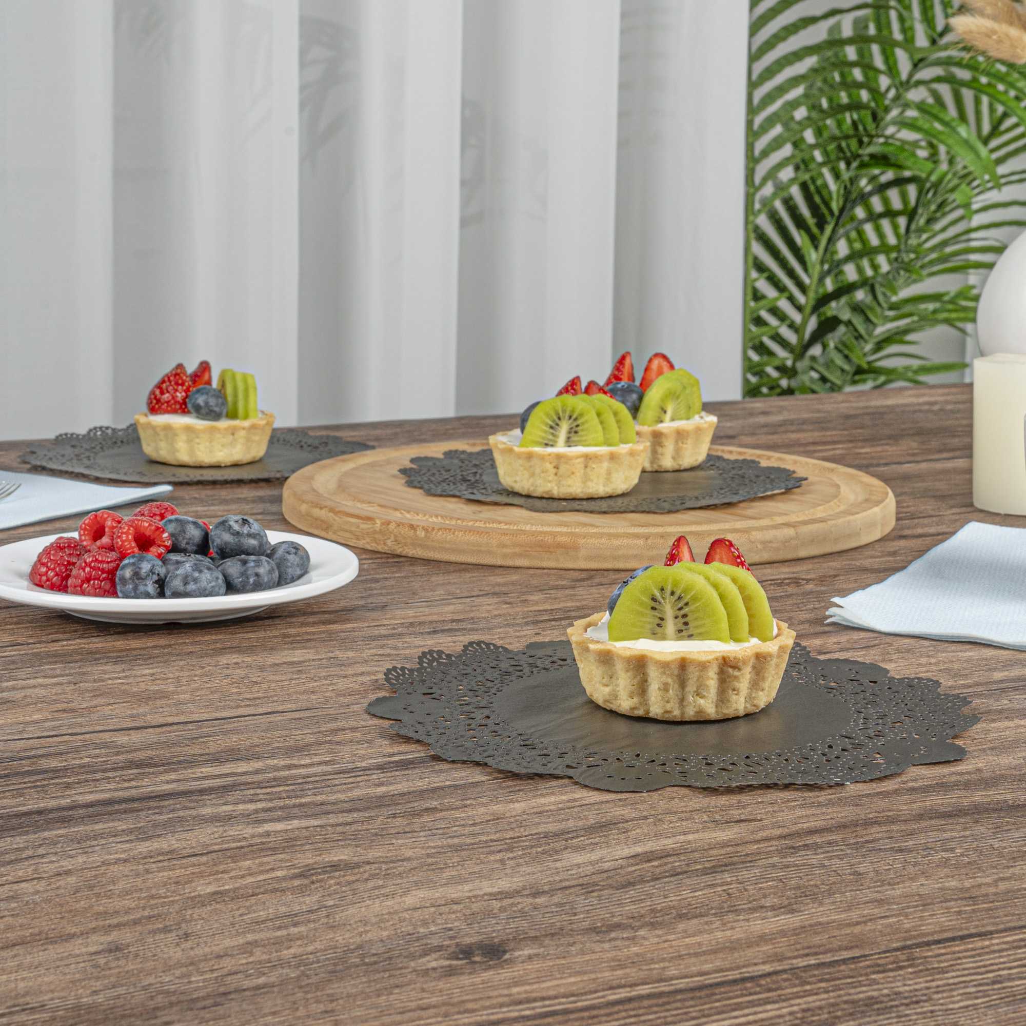 Elevate your dessert displays with our Pastry Tek Round Black Paper Doilies, designed to add an elegant touch to any table setting. Crafted from high-quality paper, these durable paper doilies ensure your desserts stay intact at bakeries or catered luncheons without tearing or losing their structural integrity. Featuring intricate lace-like details, these table doilies increase the visual appeal of food presentations while serving as functional barriers that protect surfaces and absorb moisture. The black colored paper doilies effortlessly complement a wide range of table settings and themes, making them an ideal choice for various events and occasions. Disposable by design, these lace doilies eradicate the hassle of post-event cleanup, offering a convenient and time-saving solution for busy hosts and food establishments. Perfect for use under cupcakes, petit fours, macarons, and other small treats, these small doilies measure 8 inches in diameter. Sold in a 100 count box.