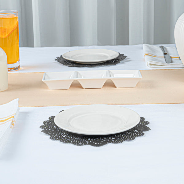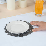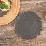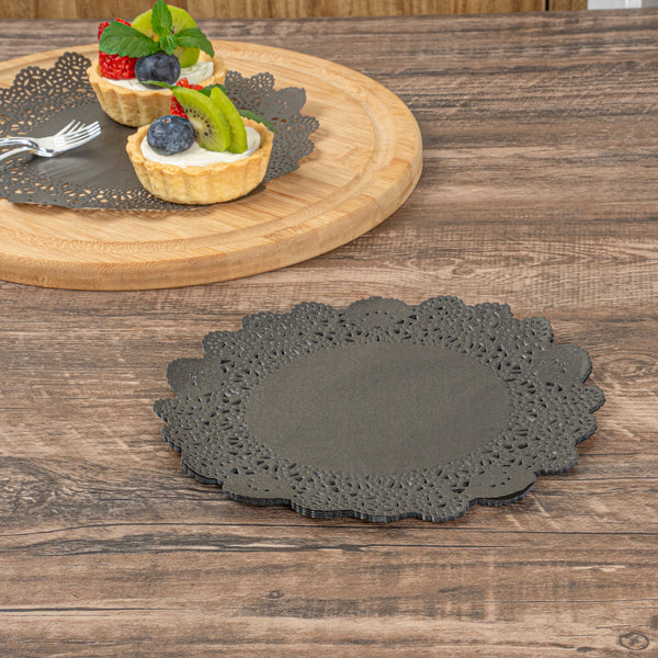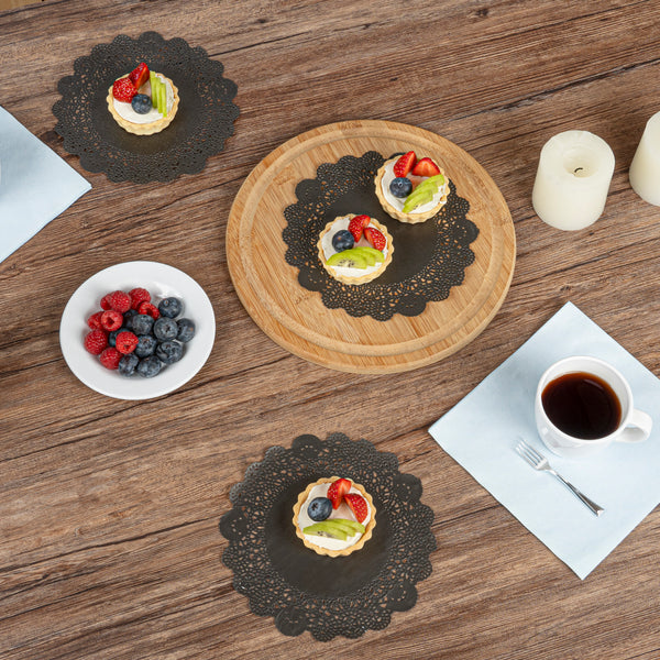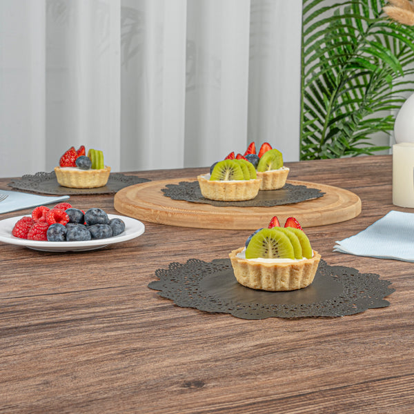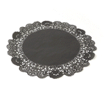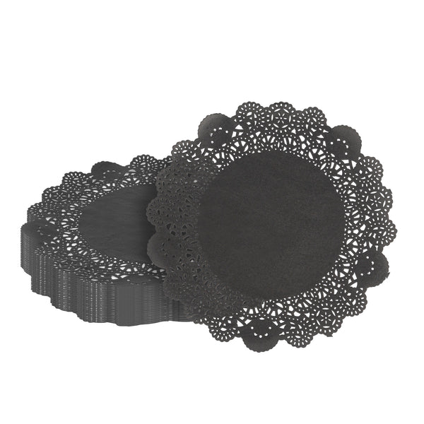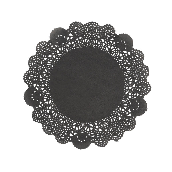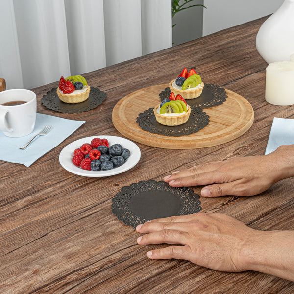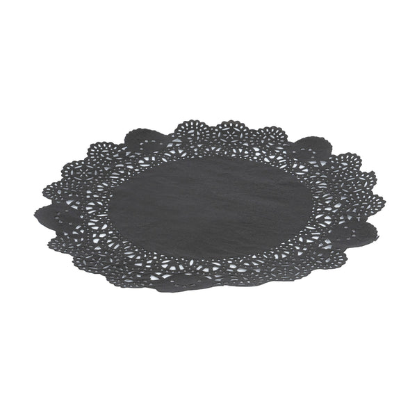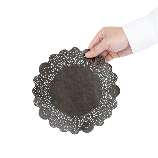Elevate your dessert displays with our Pastry Tek Round Black Paper Doilies, designed to add an elegant touch to any table setting. Crafted from high-quality paper, these durable paper doilies ensure your desserts stay intact at bakeries or catered luncheons without tearing or losing their structural integrity. Featuring intricate lace-like details, these table doilies increase the visual appeal of food presentations while serving as functional barriers that protect surfaces and absorb moisture. The black colored paper doilies effortlessly complement a wide range of table settings and themes, making them an ideal choice for various events and occasions. Disposable by design, these lace doilies eradicate the hassle of post-event cleanup, offering a convenient and time-saving solution for busy hosts and food establishments. Perfect for use under cupcakes, petit fours, macarons, and other small treats, these small doilies measure 8 inches in diameter. Sold in a 4,000 count box.
