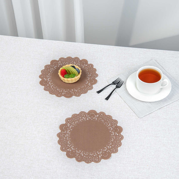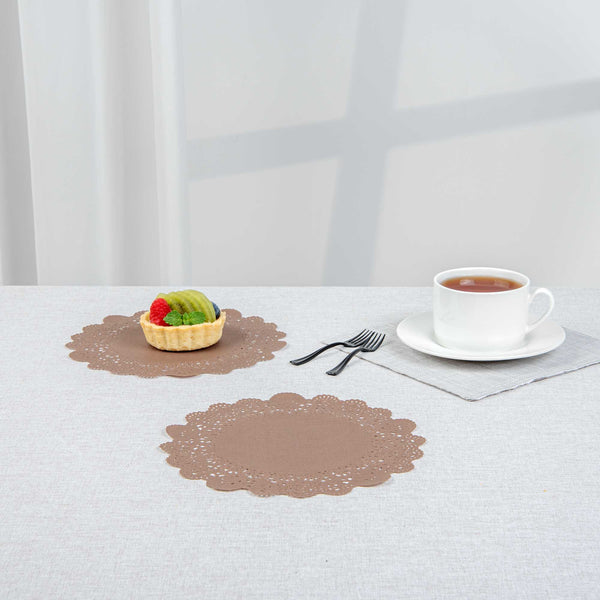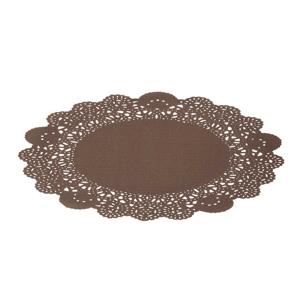 Enhance your dessert presentations with our Pastry Tek Round Brown Paper Doilies. Crafted from high-quality paper, these lace doilies provide durability while ensuring they don't tear or lose their structural integrity. With intricate lace-like details, these table doilies boost the visual appeal of food presentations and serve as functional barriers, protecting surfaces and absorbing moisture. The colored paper doilies feature a versatile brown finish, allowing them to complement a wide range of table settings and themes, making them an ideal choice for various events and occasions. Disposable by design, these small doilies eradicate the hassle of post-event cleanup, offering a convenient and time-saving solution for busy hosts and food establishments. These paper doilies add an elegant touch to your dessert displays, making them perfect for showcasing desserts at bakeries or catered luncheons. Measuring 8 inches in diameter, these lace doilies are perfect for use under cupcakes, petit fours, macarons, and other small treats. Sold in a 4,000 count box.