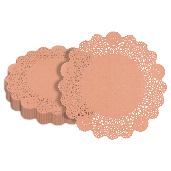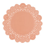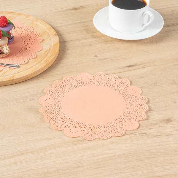 Elevate your dessert displays with our Pastry Tek Round Coral Paper Doilies, perfect for adding an elegant touch to any presentation. Crafted from high-quality paper, these lace doilies provide unparalleled durability, ensuring your desserts remain intact without tearing. Featuring intricate lace-like details, these table doilies not only enhance the visual appeal of your food presentations but also serve as functional barriers, protecting surfaces and absorbing moisture. The coral colored paper doilies complement a wide range of table settings and themes, making them an ideal choice for various events and occasions. These small doilies are disposable, offering a convenient and time-saving solution for busy hosts and food establishments, eliminating the hassle of post-event cleanup. Use these lace doilies under cupcakes, petit fours, macarons, and other small treats to impress your guests. Measuring 8 inches in diameter, these paper doilies fit perfectly into your display settings. Sold in a 100 count box.