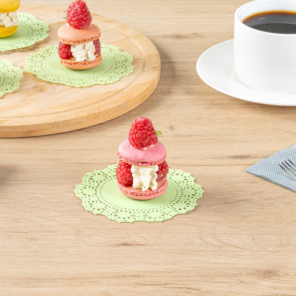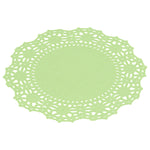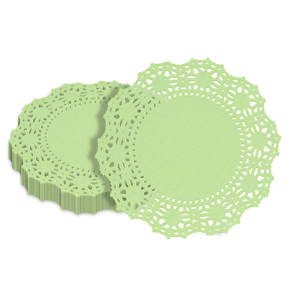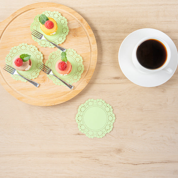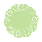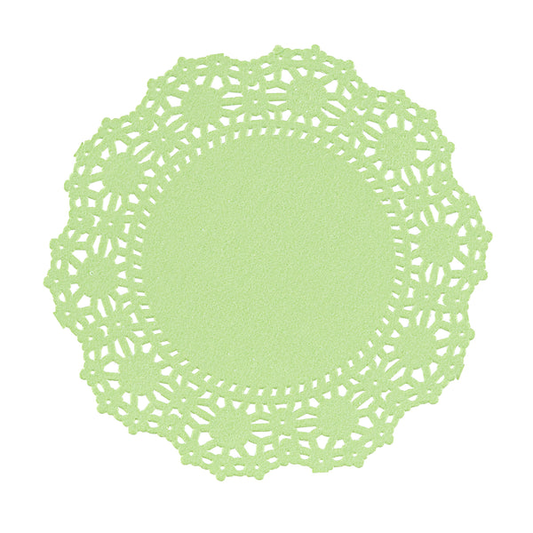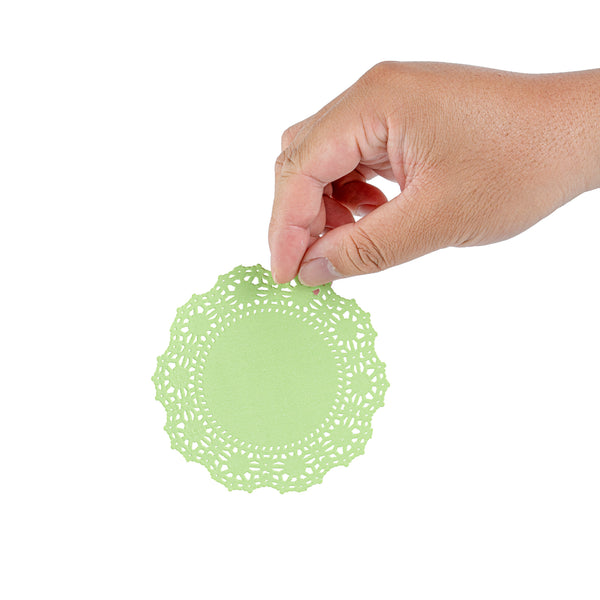 Elevate your dessert displays with our Pastry Tek Round Green Paper Doilies. These high-quality paper doilies add an elegant touch to your table settings, perfect for showcasing double chocolate brownies at bakeries or catered luncheons without tearing. Crafted from durable materials, these lace doilies maintain their structural integrity, ensuring your desserts look flawless. The intricate lace-like details of these table doilies increase the visual appeal of food presentations while serving as functional barriers, protecting surfaces and absorbing moisture. The versatile green colored paper doilies seamlessly complement a wide range of table settings and themes, making them ideal for various events and occasions. Disposable by design, these small doilies eradicate the hassle of post-event cleanup, offering a convenient and time-saving solution for busy hosts and food establishments. Measuring 4 inches in diameter, these lace doilies perfectly fit under cupcakes, petit fours, macarons, and other small treats. Sold in a 4,000 count box.
