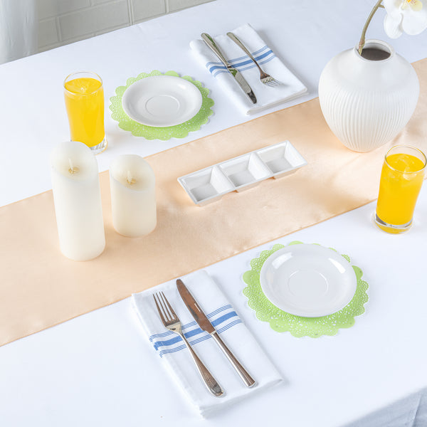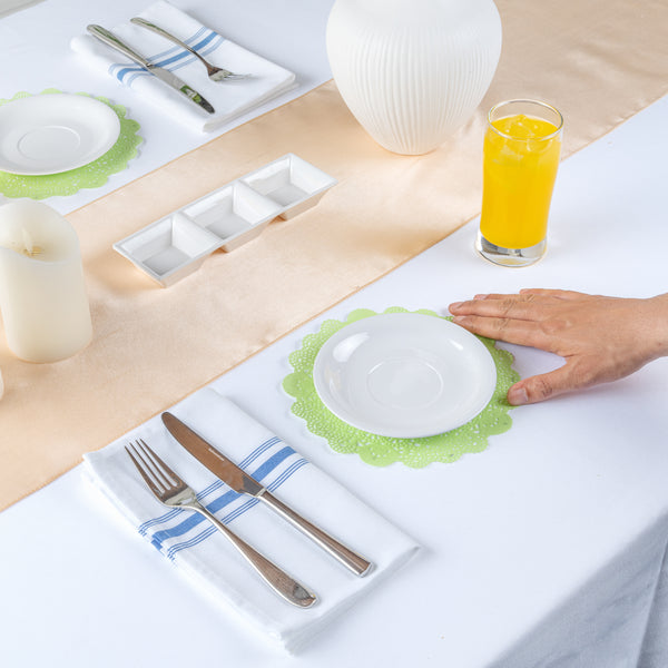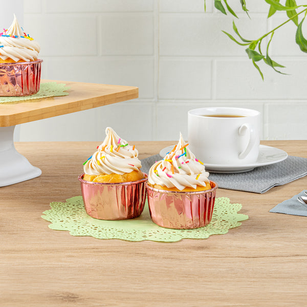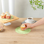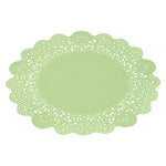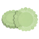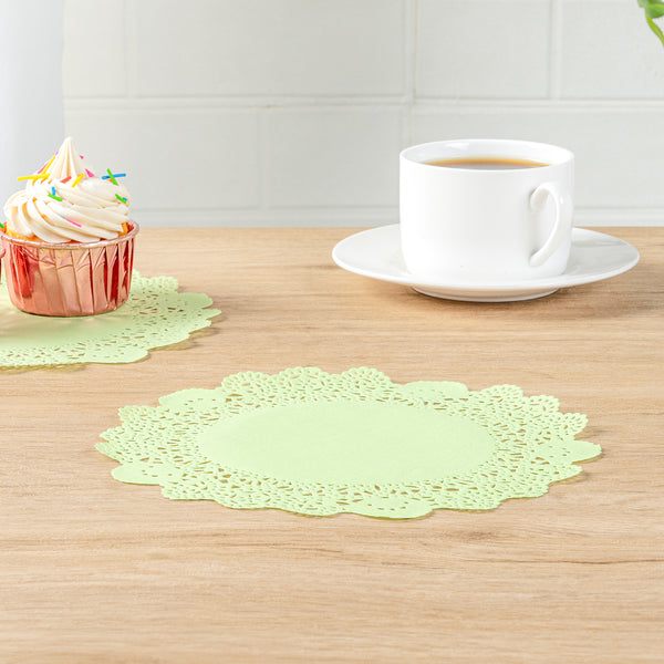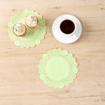 Enhance your dessert displays with our Pastry Tek Round Green Paper Doilies. Crafted from durable paper, these lace doilies showcase desserts at bakeries or catered luncheons without tearing. The intricate lace-like details increase the visual appeal of food presentations while serving as functional barriers, protecting surfaces and absorbing moisture. These colored paper doilies are versatile, complementing a wide range of table settings and themes, making them an ideal choice for various events and occasions. Disposable by design, these table doilies eradicate the hassle of post-event cleanup, offering a convenient and time-saving solution for busy hosts and food establishments. Small doilies like these can be used under cupcakes, petit fours, macarons, and other small treats. These high-quality paper doilies add an elegant touch to any table setting. Measuring 8 inches in length and width, these lace doilies fit perfectly under a variety of desserts. Sold in a 100 count box.
