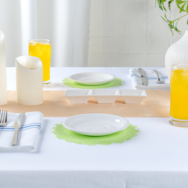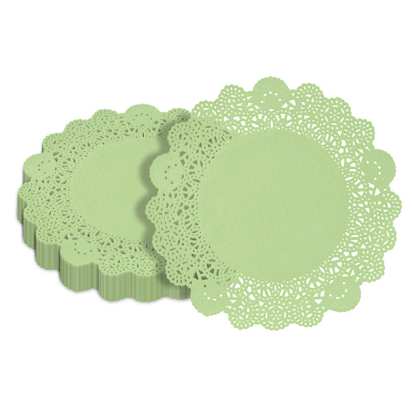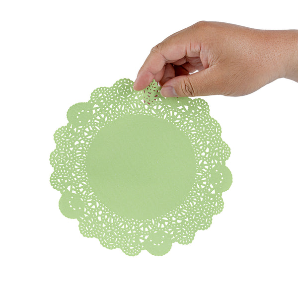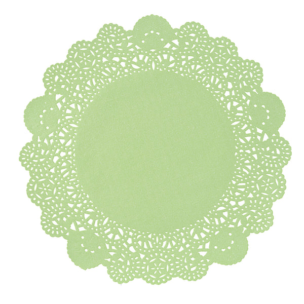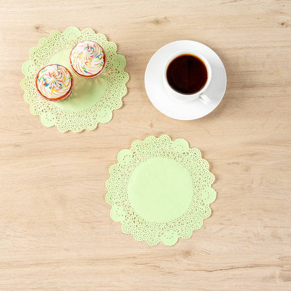 Enhance your dessert displays with our Pastry Tek Round Green Paper Doilies. Crafted from durable paper, these lace doilies showcase desserts at bakeries or catered luncheons without tearing. The intricate lace-like details increase the visual appeal of food presentations while serving as functional barriers, protecting surfaces and absorbing moisture. These colored paper doilies are versatile, complementing a wide range of table settings and themes, making them an ideal choice for various events and occasions. Disposable by design, these table doilies eradicate the hassle of post-event cleanup, offering a convenient and time-saving solution for busy hosts and food establishments. Small doilies like these can be used under cupcakes, petit fours, macarons, and other small treats. These high-quality paper doilies add an elegant touch to any table setting. Measuring 8 inches in length and width, these lace doilies fit perfectly under a variety of desserts. Sold in a 4,000 count box.