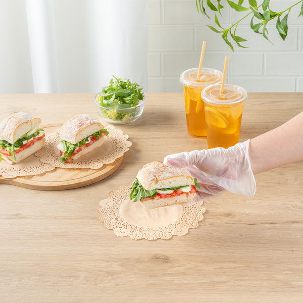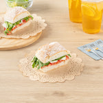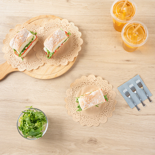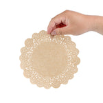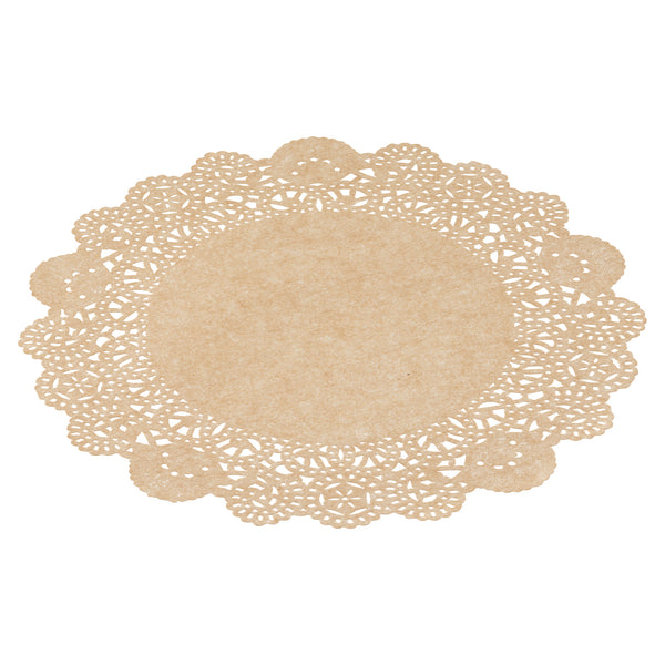Elevate your dessert displays with our Pastry Tek Round Kraft Paper Doilies, designed to add an elegant touch to any presentation. Crafted from high-quality paper, these lace doilies provide remarkable durability, ensuring your desserts remain intact at bakeries or catered luncheons. Featuring intricate lace-like details, these table doilies not only enhance the visual appeal of your food presentations but also serve as functional barriers, protecting surfaces and absorbing moisture. The kraft finish of these paper doilies complements a wide range of table settings and themes, making them an ideal choice for various events and occasions. Perfect for busy hosts and food establishments, these disposable small doilies eradicate the hassle of post-event cleanup, offering a convenient and time-saving solution. Whether under cupcakes, petit fours, macarons, or other small treats, these lace doilies deliver both style and practicality. Measuring 8 inches in diameter, these table doilies fit seamlessly into your food presentation needs. Sold in a 4,000 count box.
