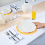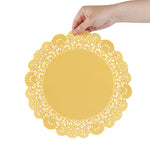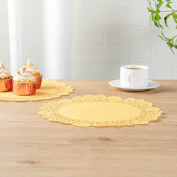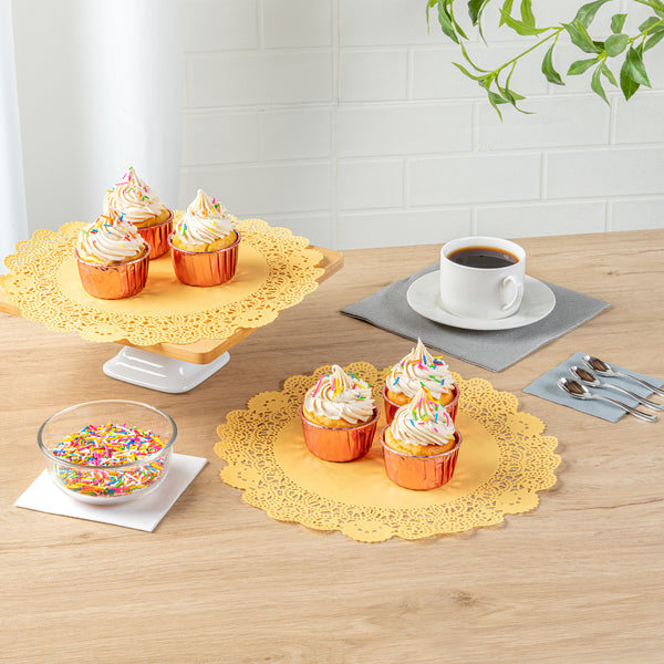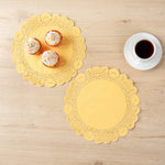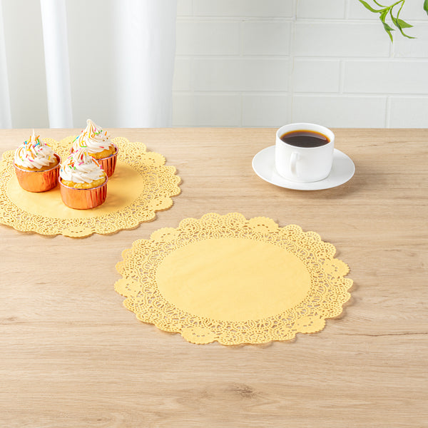 Enhance your dessert displays with elegance using our Pastry Tek Round Orange Paper Doilies. Crafted from high-quality paper, these lace doilies offer durability, ensuring that desserts at bakeries or catered luncheons are showcased without tearing or losing structural integrity. These table doilies feature intricate lace-like details that not only boost the visual appeal of your food presentations but also serve as functional barriers, protecting surfaces and absorbing moisture. The vibrant orange finish of these colored paper doilies is versatile, allowing them to effortlessly complement a wide range of table settings and themes, making them perfect for various events and occasions. Designed to be disposable, these small doilies eradicate the hassle of post-event cleanup, providing a convenient and time-saving solution for busy hosts and food establishments. Use these paper doilies under cupcakes, petit fours, macarons, and other small treats to add a touch of sophistication. Measuring 12 inches in diameter, these lace doilies offer ample space for a variety of desserts. Sold in a 100 count box.