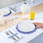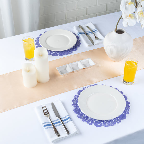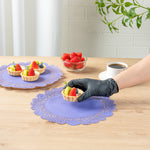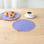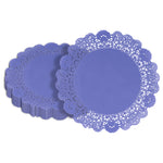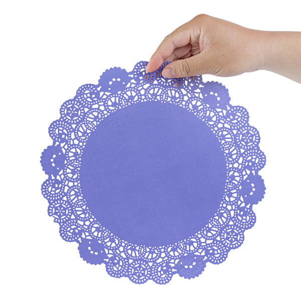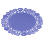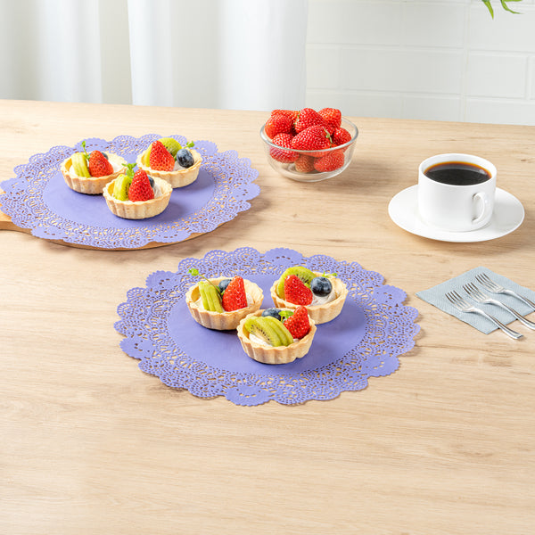 Enhance your dessert displays with our Pastry Tek Round Purple Paper Doilies, perfect for adding an elegant touch to any event. Crafted from high-quality paper, these lace doilies ensure durability while showcasing desserts at bakeries or catered luncheons without tearing or losing their structural integrity. Featuring intricate lace-like details, these table doilies not only enhance the visual appeal of food presentations but also serve as functional barriers, protecting surfaces and absorbing moisture. The specific purple finish of these colored paper doilies is versatile, allowing them to complement a wide range of table settings and themes, making them ideal for various events and occasions. Designed to be disposable, these small doilies eradicate the hassle of post-event cleanup, offering a convenient and time-saving solution for busy hosts and food establishments. Measuring 12 inches in diameter, these lace doilies are the perfect size for under cupcakes, petit fours, macarons, and other small treats. Sold in a 100 count box.