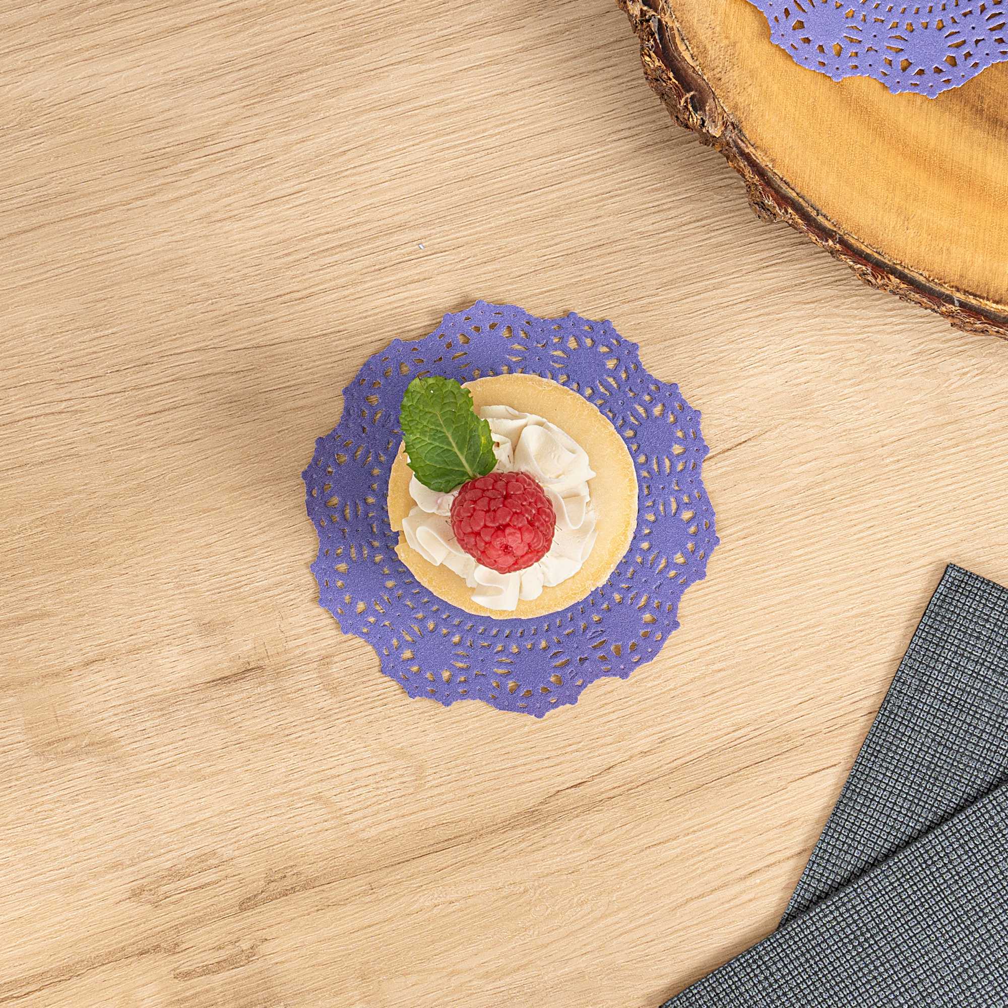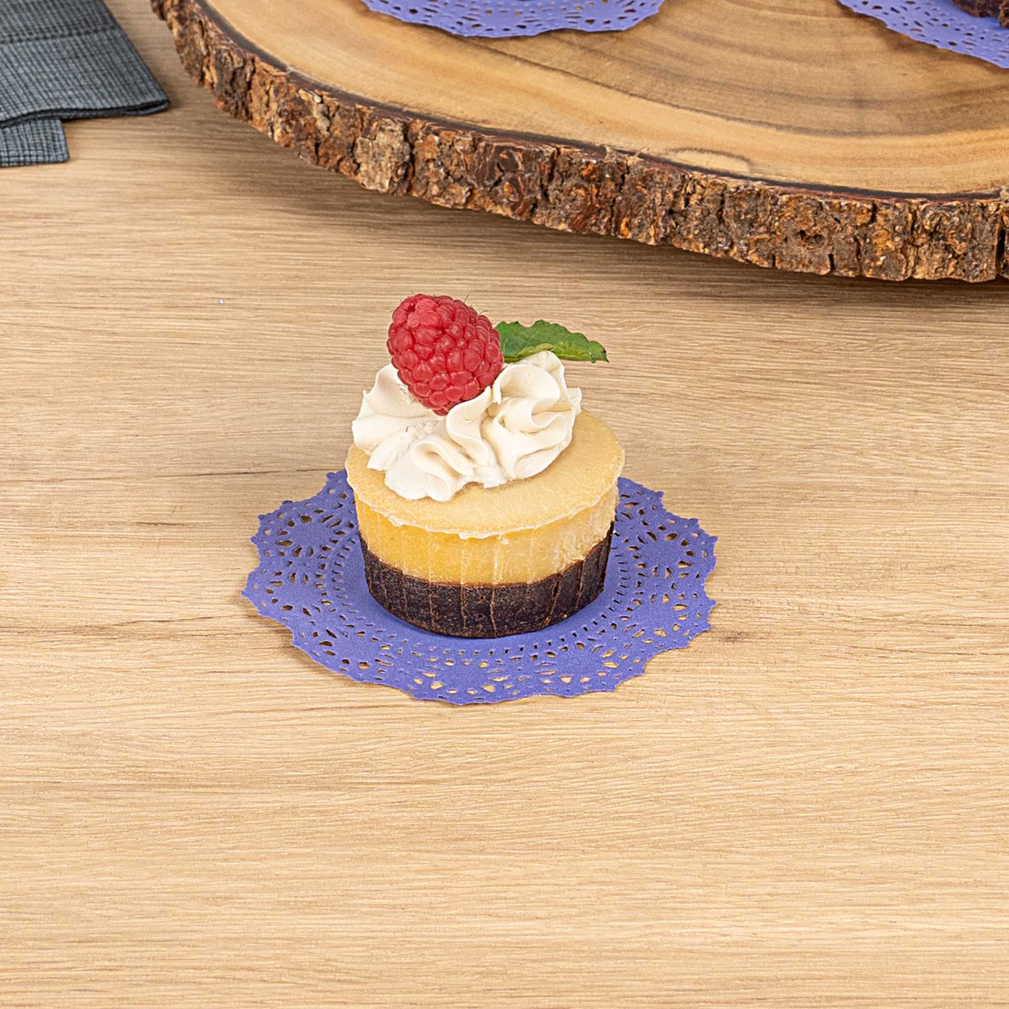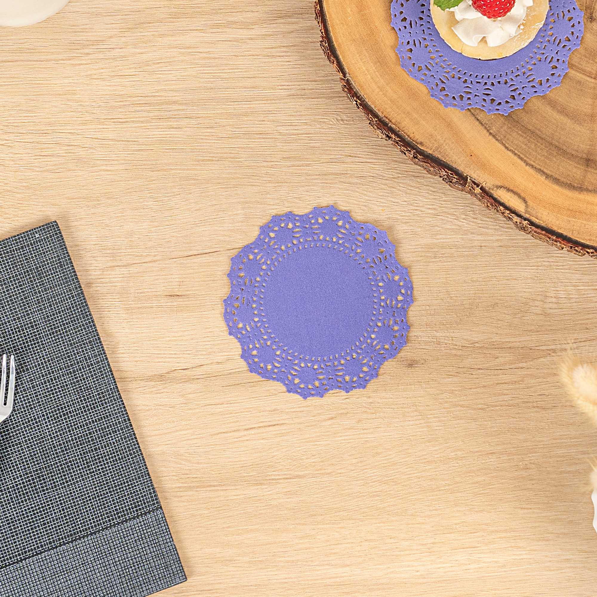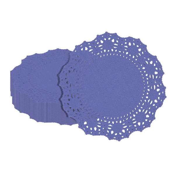 Enhance your dessert displays with our Pastry Tek Round Purple Paper Doilies, adding an elegant touch to any setting. Crafted from high-quality paper, these lace doilies provide durability while displaying double chocolate brownies at bakeries or catered luncheons without tearing or losing their structural integrity. Featuring intricate lace-like details, these table doilies increase the visual appeal of food presentations while serving as functional barriers, protecting surfaces, and absorbing moisture. The specific colored paper doilies' finish is versatile, allowing them to complement a wide range of table settings and themes, making them an ideal choice for various events and occasions. These disposable paper doilies eradicate the hassle of post-event cleanup, offering a convenient and time-saving solution for busy hosts and food establishments. Small doilies like these can be used under cupcakes, petit fours, macarons, and other small treats, making them perfect for a variety of confections. Measuring 4 inches in diameter, these lace doilies are the perfect size for enhancing your food presentation. Sold in a 4,000 count box.