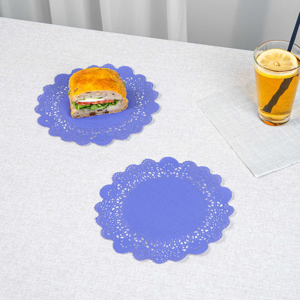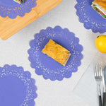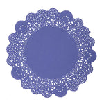 Enhance your dessert displays with our Pastry Tek Round Purple Paper Doilies, designed to add an elegant touch to any table setting. Crafted from high-quality paper, these table doilies provide durability while showcasing desserts at bakeries or catered luncheons without tearing or losing their structural integrity. Featuring intricate lace-like details, these lace doilies not only increase the visual appeal of food presentations but also serve as functional barriers, protecting surfaces and absorbing moisture. The versatile colored paper doilies easily complement a wide range of table settings and themes, making them an ideal choice for various events and occasions. Disposable by design, these small doilies eradicate the hassle of post-event cleanup, offering a convenient and time-saving solution for busy hosts and food establishments. Measuring 8 inches in diameter, these paper doilies are perfect for use under cupcakes, petit fours, macarons, and other small treats. Sold in a 100 count box.
