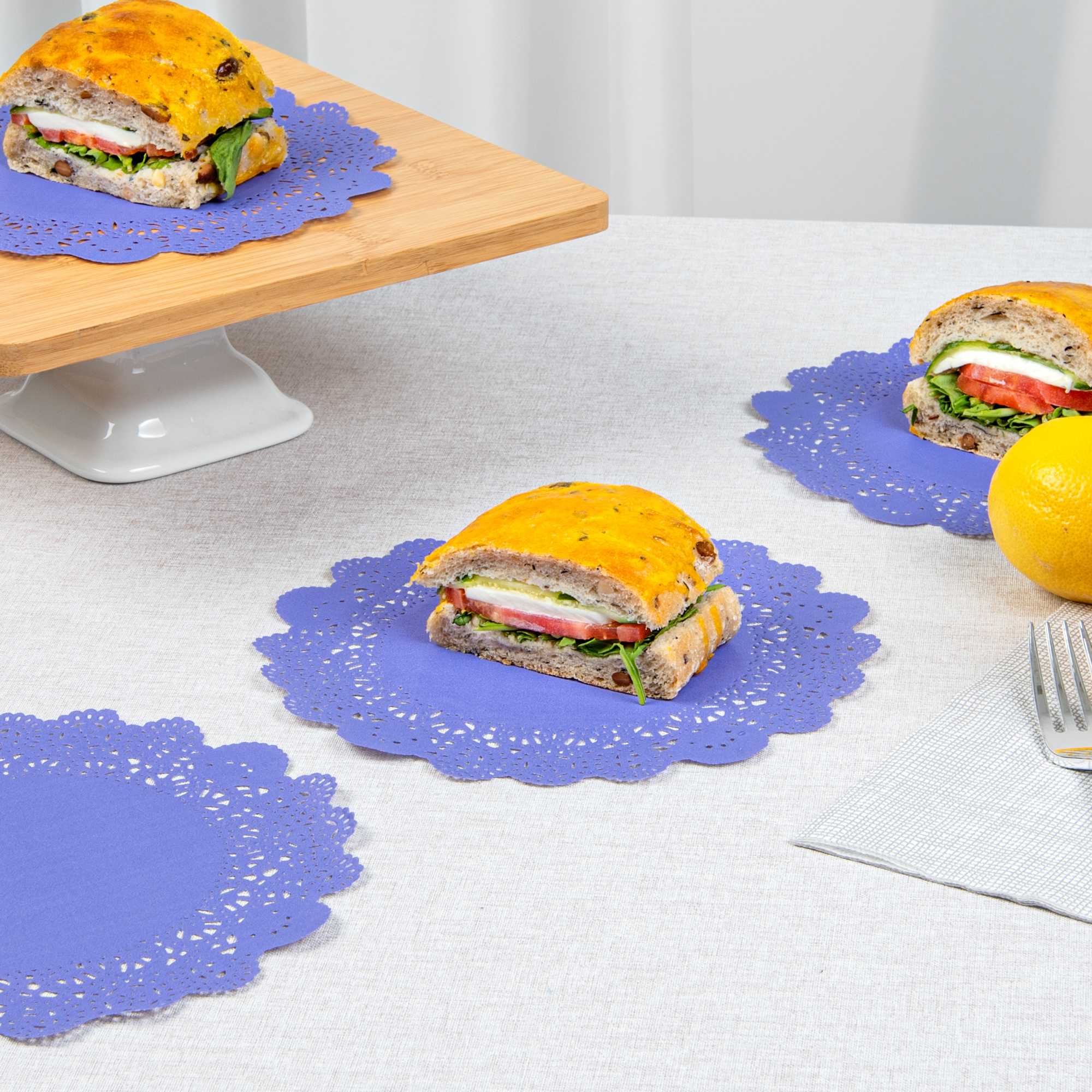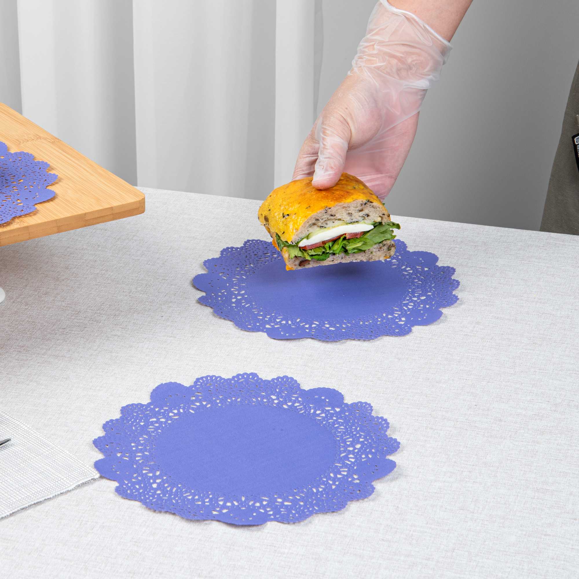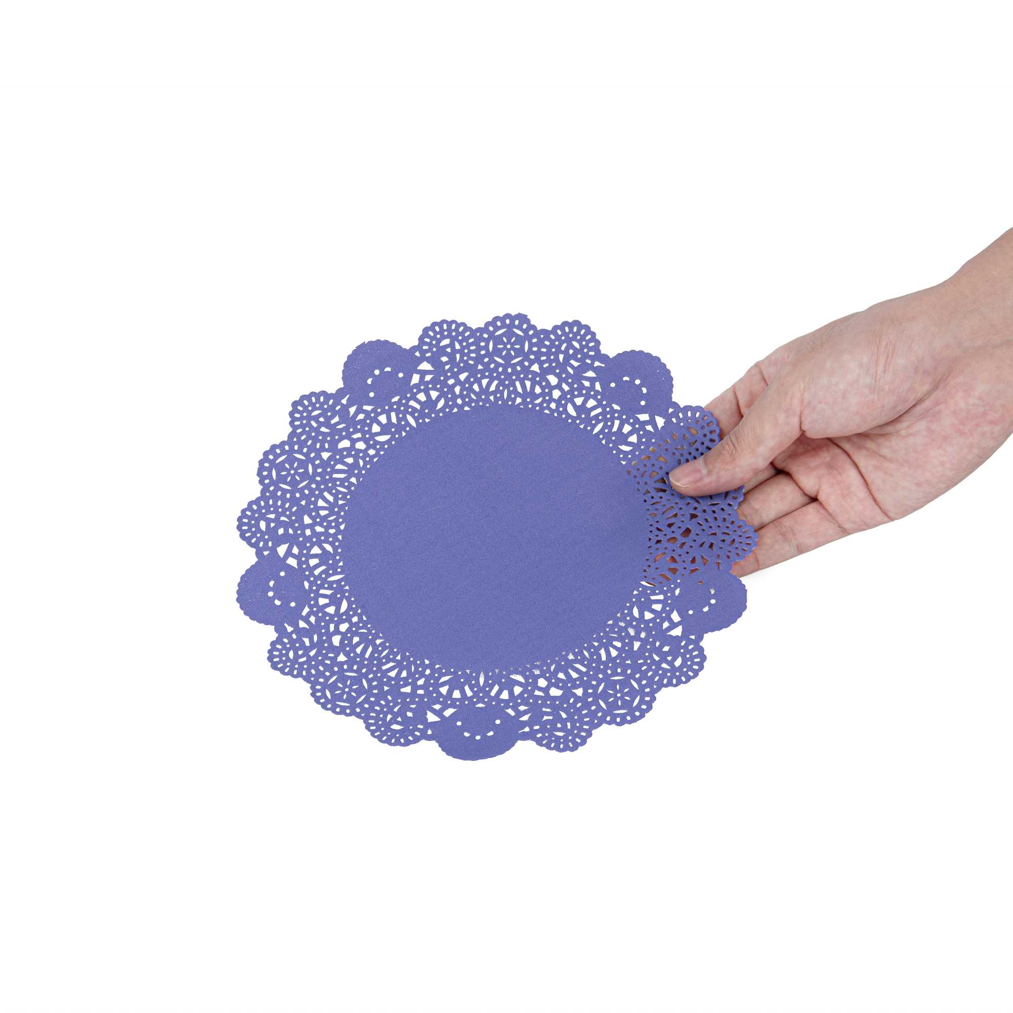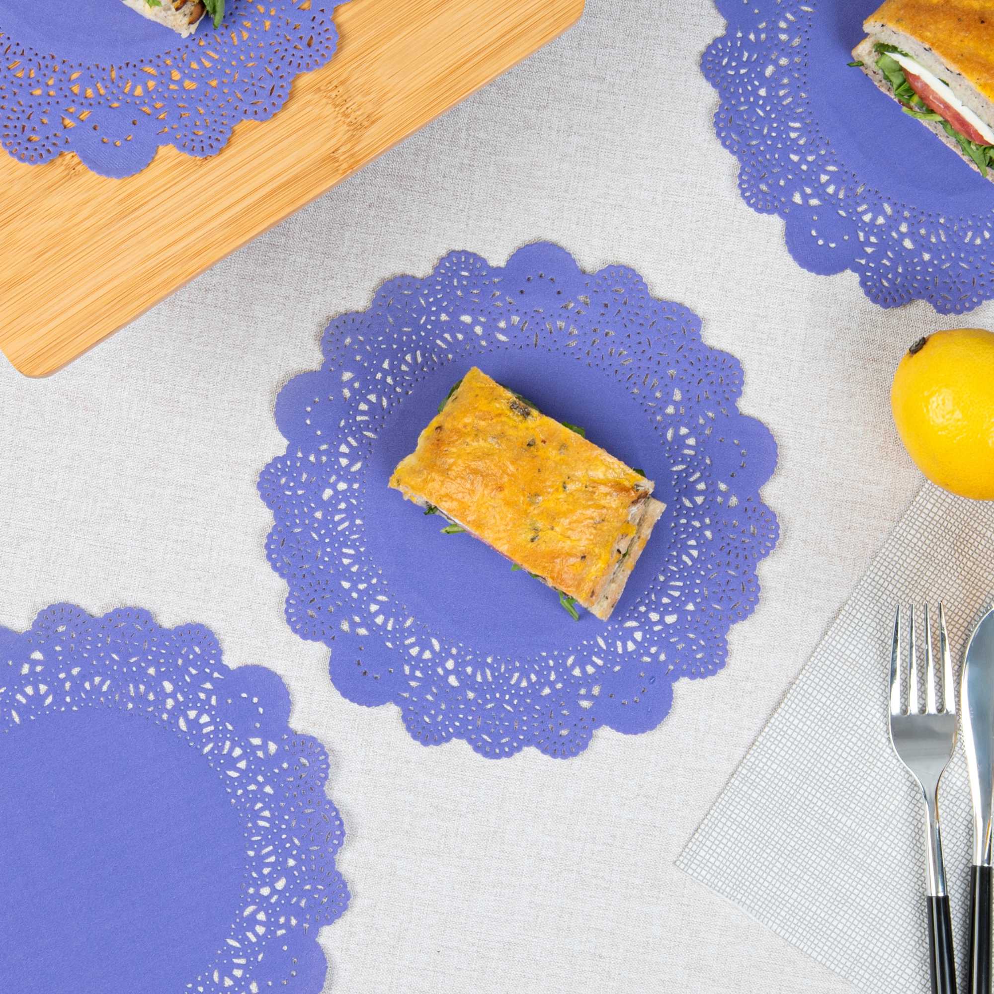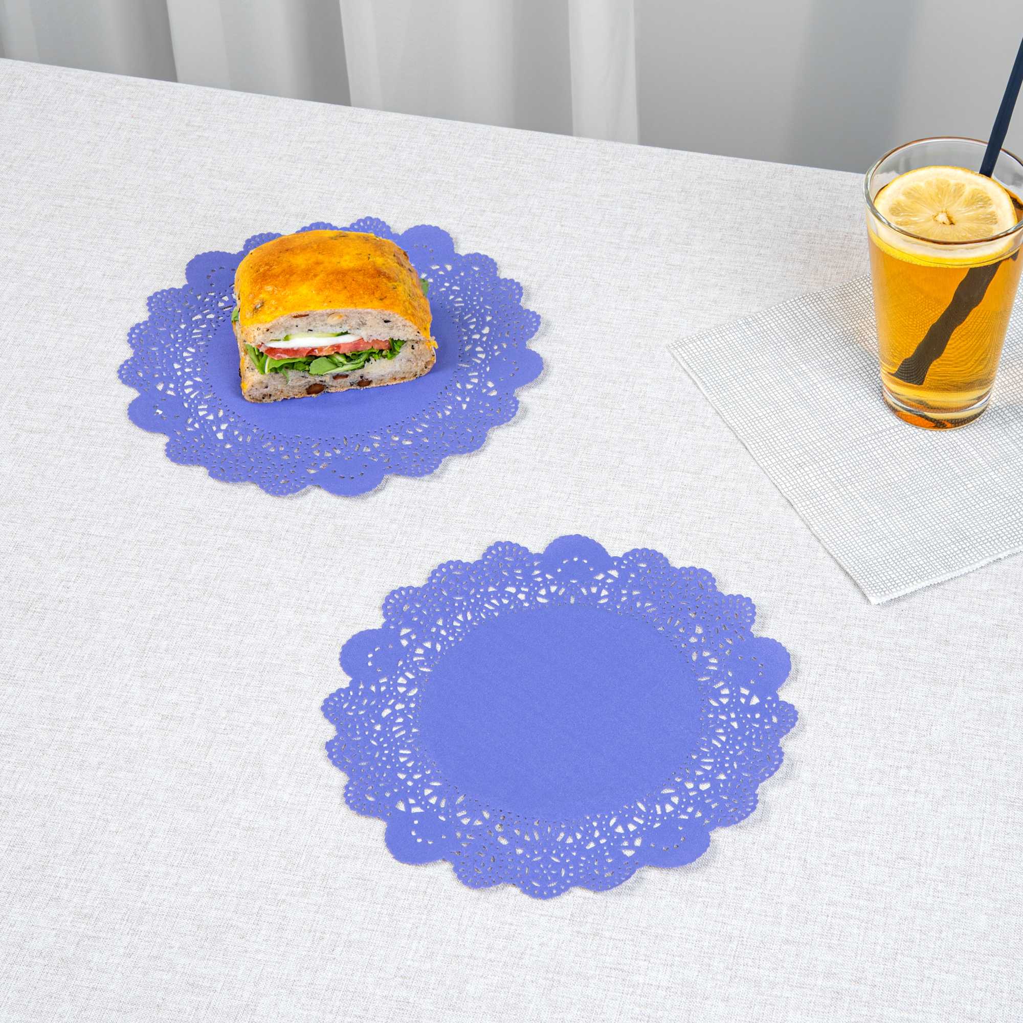 Enhance your dessert displays with our Pastry Tek Round Purple Paper Doilies, designed to add an elegant touch to any table setting. Crafted from high-quality paper, these table doilies provide durability while showcasing desserts at bakeries or catered luncheons without tearing or losing their structural integrity. Featuring intricate lace-like details, these lace doilies not only increase the visual appeal of food presentations but also serve as functional barriers, protecting surfaces and absorbing moisture. The versatile colored paper doilies easily complement a wide range of table settings and themes, making them an ideal choice for various events and occasions. Disposable by design, these small doilies eradicate the hassle of post-event cleanup, offering a convenient and time-saving solution for busy hosts and food establishments. Measuring 8 inches in diameter, these paper doilies are perfect for use under cupcakes, petit fours, macarons, and other small treats. Sold in a 4,000 count box.