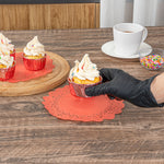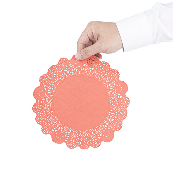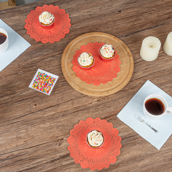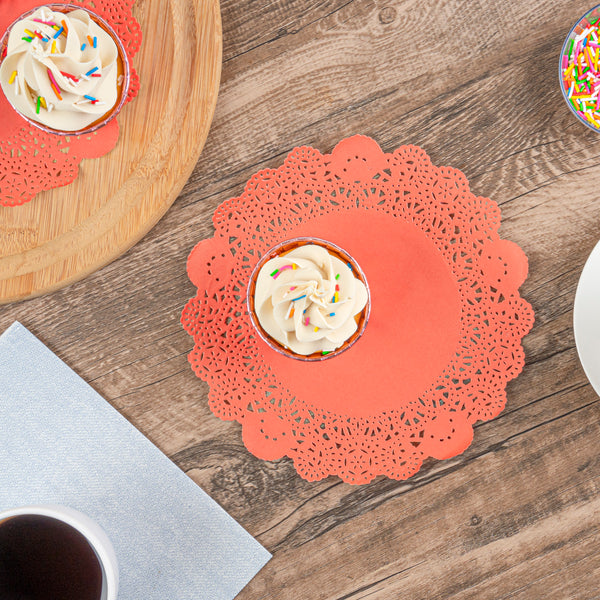 Enhance any dining experience with elegant, disposable decor. Pastry Tek Lace Design Paper Doilies with their intricate lace-like details elevate the visual appeal of food presentations, making them ideal for caterers and bakers using paper doilies for events. The vibrant red color of these lace paper doilies adds a festive touch to themed events, transforming ordinary table settings into standout displays. Measuring 8 inches in diameter, they are versatile enough to accommodate a range of plate sizes, whether you're serving cold or hot dishes. Upgrade your table presentations and impress guests with these versatile doilies that are both cold and hot food friendly, perfect for diverse menu items. Invest in a solution that combines elegance with practicality, perfect for catering and restaurant environments. Each order includes 100 Pastry Tek Lace Design Paper Doilies.
