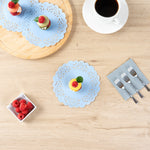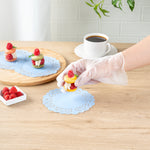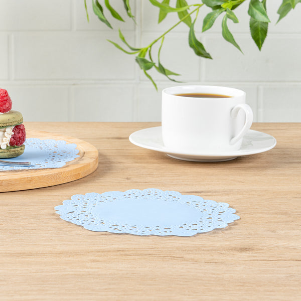 Elevate your dessert presentations with our Pastry Tek Round Sky Blue Paper Doilies. Adding an elegant touch to your dessert displays, these lace doilies enhance the visual appeal of your bakery's offerings. Crafted from high-quality paper, these table doilies provide durability while showcasing desserts without tearing or losing their structural integrity. With intricate lace-like details, these colored paper doilies serve as functional barriers, protecting surfaces and absorbing moisture efficiently. The versatile sky blue finish of these small doilies complements a wide range of table settings and themes, making them perfect for various events and occasions. Disposable by design, these paper doilies eradicate the hassle of post-event cleanup, offering a convenient and time-saving solution for busy hosts and food establishments. Measuring 6 inches in diameter, these lace doilies are ideal for use under cupcakes, petit fours, macarons, and other small treats. Sold in a 100 count box.