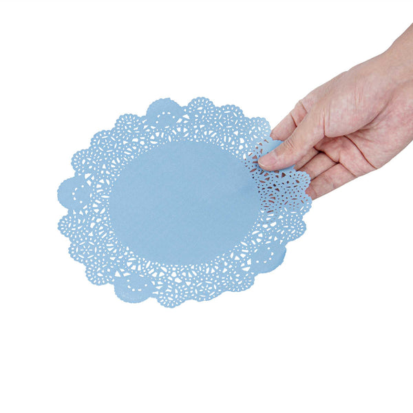 Enhance your dessert displays with our Pastry Tek Round Sky Blue Paper Doilies, which add an elegant touch to any dessert presentation. Crafted from high-quality paper, these table doilies provide durability while displaying desserts at bakeries or catered luncheons without tearing or losing their structural integrity. The intricate lace-like details of these lace doilies increase the visual appeal of food presentations while serving as functional barriers, protecting surfaces and absorbing moisture. Featuring a sky blue finish, these colored paper doilies are versatile, allowing them to complement a wide range of table settings and themes, making them ideal for various events and occasions. These disposable paper doilies eradicate the hassle of post-event cleanup, offering a convenient and time-saving solution for busy hosts and food establishments. Use these small doilies under cupcakes, petit fours, macarons, and other small treats to elevate your dessert offerings. Measuring 8 inches in diameter, these paper doilies perfectly fit a variety of table settings. Sold in a 100 count box.