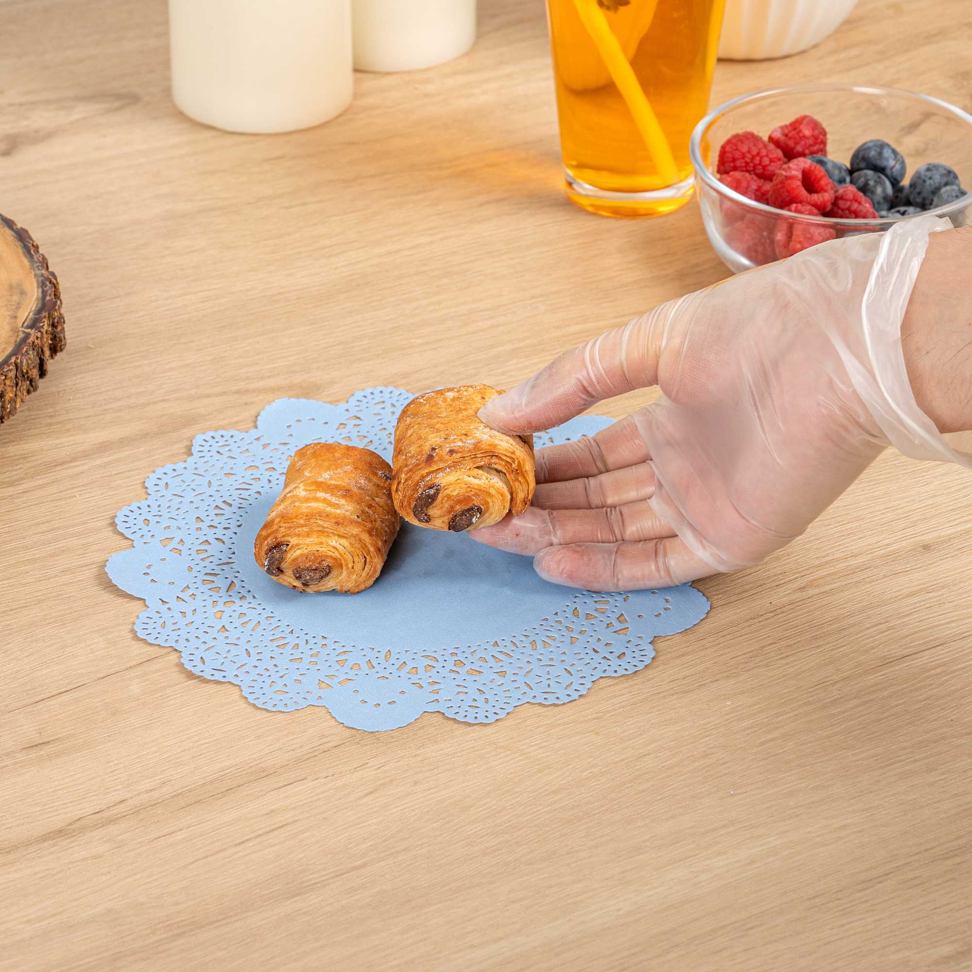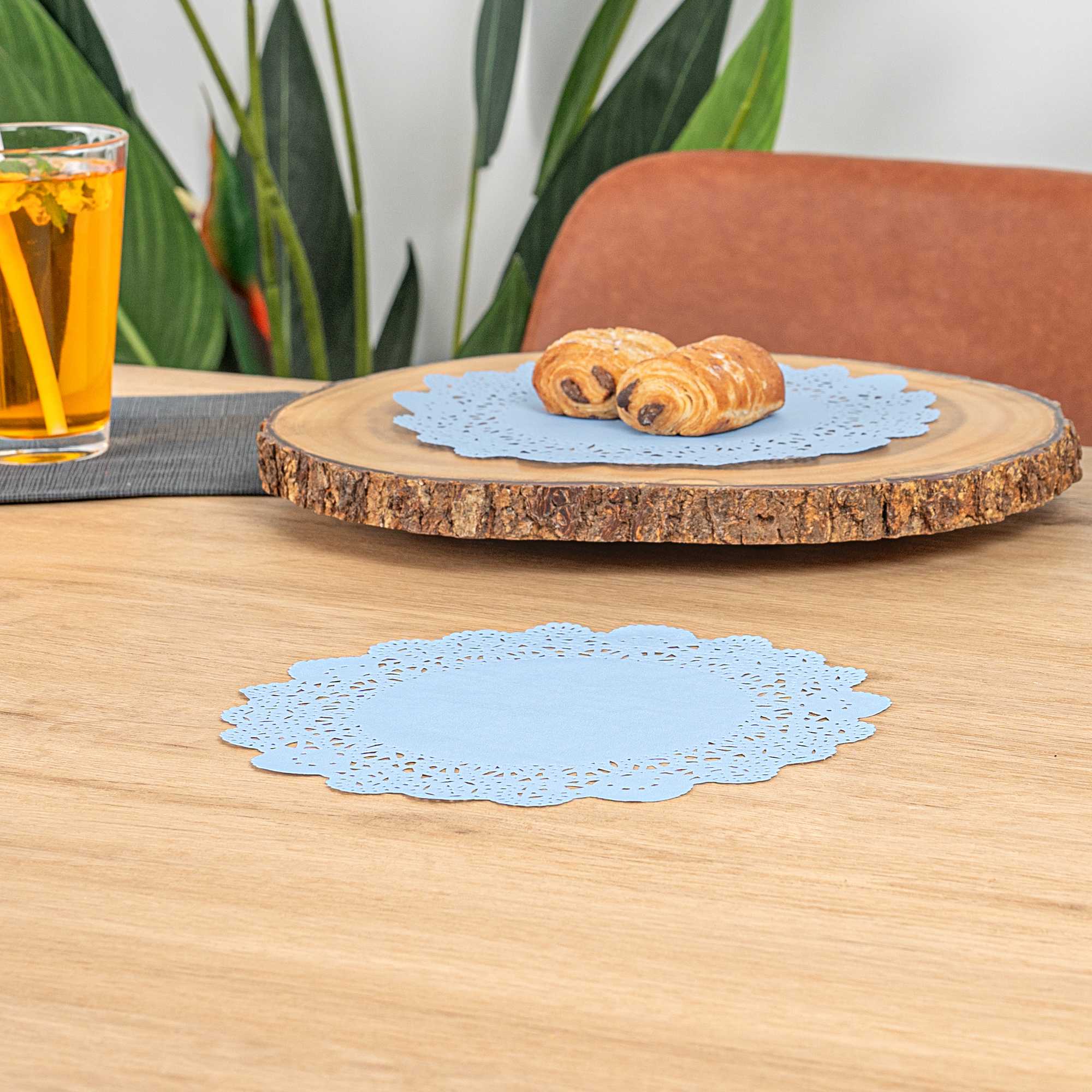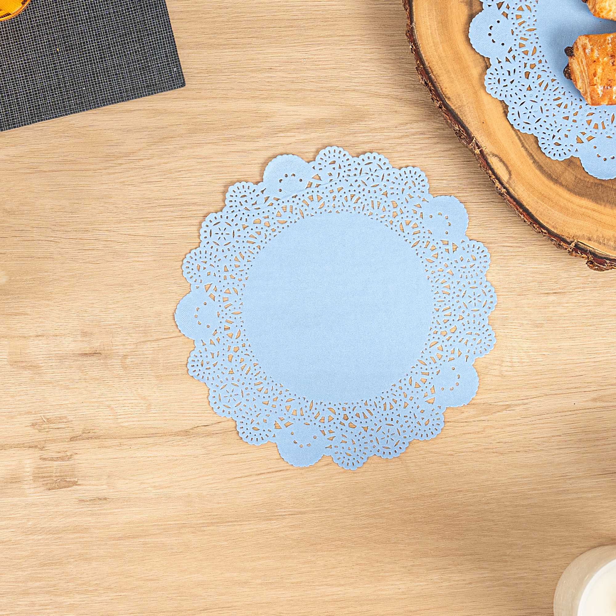 Enhance your dessert displays with our Pastry Tek Round Sky Blue Paper Doilies, which add an elegant touch to any dessert presentation. Crafted from high-quality paper, these table doilies provide durability while displaying desserts at bakeries or catered luncheons without tearing or losing their structural integrity. The intricate lace-like details of these lace doilies increase the visual appeal of food presentations while serving as functional barriers, protecting surfaces and absorbing moisture. Featuring a sky blue finish, these colored paper doilies are versatile, allowing them to complement a wide range of table settings and themes, making them ideal for various events and occasions. These disposable paper doilies eradicate the hassle of post-event cleanup, offering a convenient and time-saving solution for busy hosts and food establishments. Use these small doilies under cupcakes, petit fours, macarons, and other small treats to elevate your dessert offerings. Measuring 8 inches in diameter, these paper doilies perfectly fit a variety of table settings. Sold in a 4,000 count box.