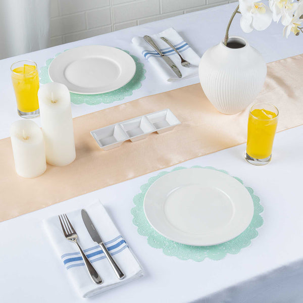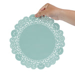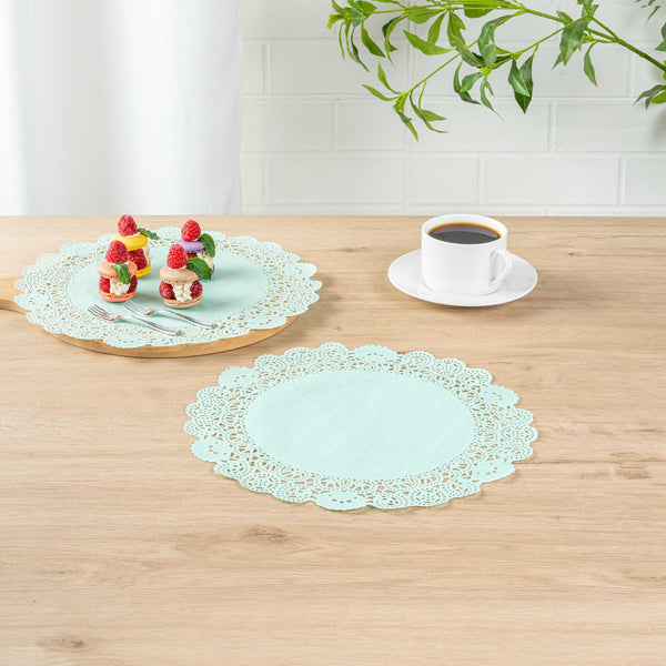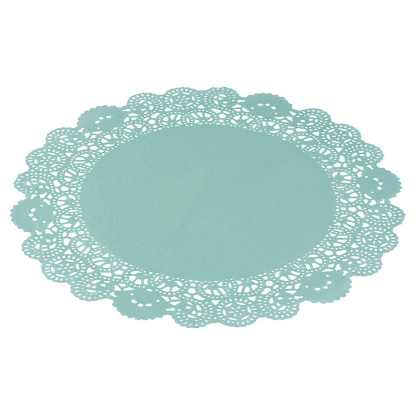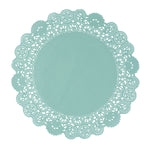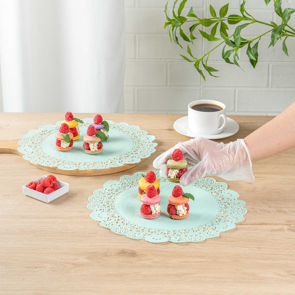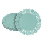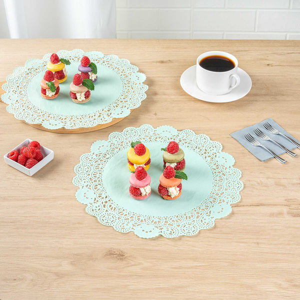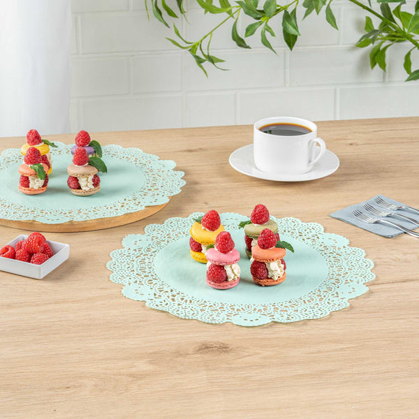 Enhance your dessert displays with our Pastry Tek Round Teal Paper Doilies, the perfect addition to any food presentation. Crafted from high-quality paper, these lace doilies provide exceptional durability, allowing you to display desserts at bakeries or catered luncheons without tearing or losing their structural integrity. Designed with intricate lace-like details, these table doilies increase the visual appeal of food presentations while serving as functional barriers that protect surfaces and absorb moisture. The teal finish of these colored paper doilies is versatile, complementing a wide range of table settings and themes, making them ideal for various events and occasions. Perfect for busy hosts and food establishments, these disposable paper doilies eradicate the hassle of post-event cleanup, offering a convenient and time-saving solution. These small doilies are perfect for use under cupcakes, petit fours, macarons, and other small treats. Measuring 12 inches in diameter, these lace doilies fit perfectly on standard serving trays and dessert displays. Sold in a 4,000 count box.