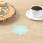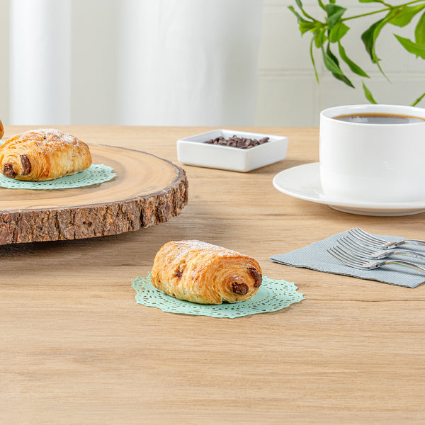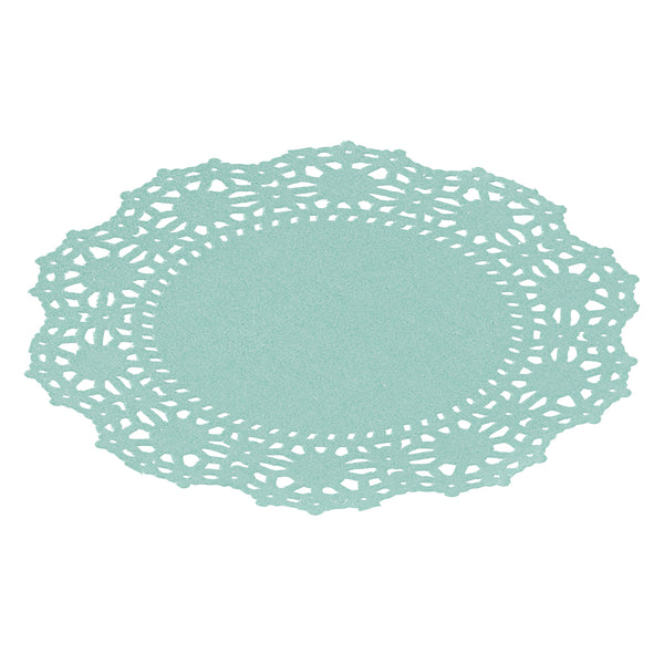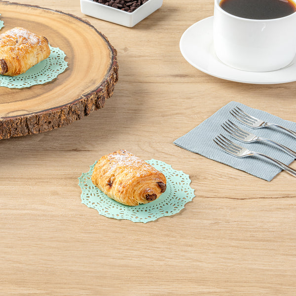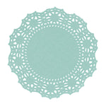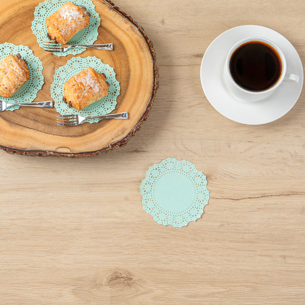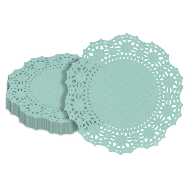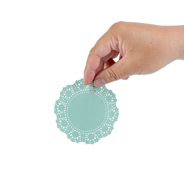 Enhance your dessert displays with our Pastry Tek Round Teal Paper Doilies, adding an elegant touch to any presentation. These paper doilies are crafted from high-quality materials, ensuring durability while displaying double chocolate brownies at bakeries or catered luncheons without tearing. Featuring intricate lace-like details, these table doilies increase the visual appeal of food presentations and serve as functional barriers, protecting surfaces and absorbing moisture. The specific colored finish of these lace doilies is versatile, allowing them to complement a wide range of table settings and themes, making them an ideal choice for various events and occasions. Disposable by design, these colored paper doilies eradicate the hassle of post-event cleanup, offering a convenient and time-saving solution for busy hosts and food establishments. Small doilies like these can be perfectly used under cupcakes, petit fours, macarons, and other small treats. Measuring 4 inches in diameter, these paper doilies are the perfect size for a variety of uses. Sold in a 4,000 count box.
