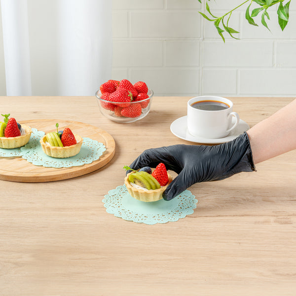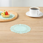 Enhance your dessert displays with our Pastry Tek Round Teal Paper Doilies. These elegant paper doilies add a refined touch to any table setting, making your desserts look even more irresistible. Crafted from high-quality paper, this lace doily is designed to withstand the demands of busy bakeries and catered luncheons without tearing or losing structural integrity. The intricate lace-like details of these table doilies not only increase the visual appeal of your food presentations but also serve as functional barriers by protecting surfaces and absorbing moisture. The teal colored paper doilies perfectly complement a wide range of table settings and themes, making them ideal for various events and occasions. These small doilies are disposable, eradicating the hassle of post-event cleanup and offering a convenient, time-saving solution for busy hosts and food establishments. Measuring 6 inches in diameter, these doilies are perfect for cupcakes, petit fours, macarons, and other small treats. Sold in a 100 count box.
