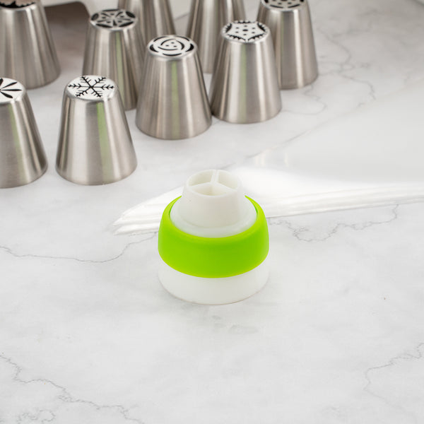 Add a fun twist to desserts with our Pastry Tek Round White Plastic Tri-Color Russian Piping Tip Coupler. With a 4-piece design, this decorating coupler includes 3 interlocking coupler pieces and a ring to lock in large Russian piping tips and create flawless tri-color decorations in one simple motion. This 3 color coupler provides you with a quick and hassle-free way to switch piping tips without using a new piping bag to streamline the dessert decorating process at your bakery, cake shop, or food truck. Constructed from premium plastic, this dishwasher-safe decorating coupler is easy to clean and built to maintain its exceptional design for long-lasting use. Prevent frosting from oozing out when piping cupcakes or pies by pairing this piping coupler with our collection of large Russian piping tips. This tri-color piping coupler measures 1.8 inches in diameter by 1.8 inches in height. Sold in a 1 count box. Russian piping tips are available and sold separately.