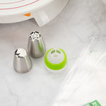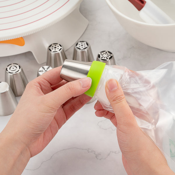 - Base and ring allow you to use different frosting tips with the same icing bag