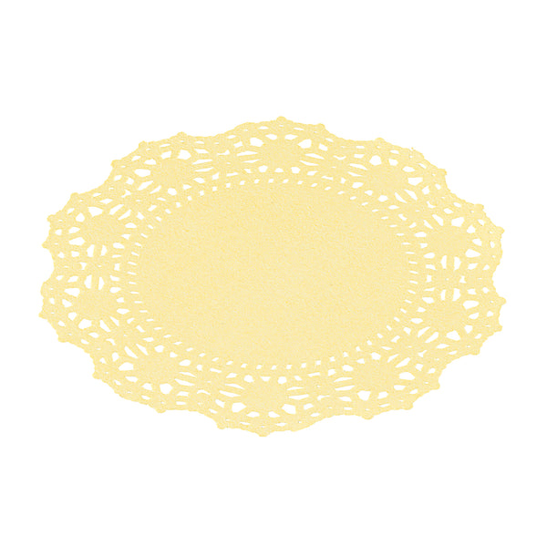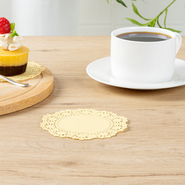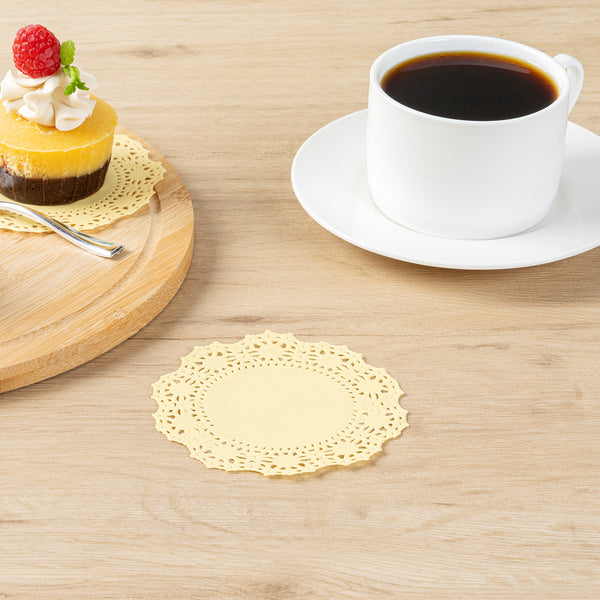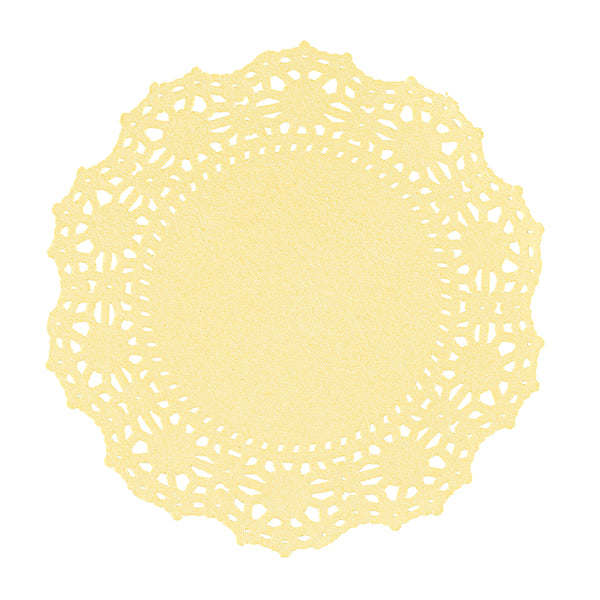 Enhance your dessert displays with our Pastry Tek Round Yellow Paper Doilies. These elegant paper doilies add a touch of sophistication to any table setting, making them perfect for bakeries or catered luncheons. Crafted from high-quality paper, these lace doilies provide exceptional durability, ensuring they won't tear or lose their structural integrity while showcasing double chocolate brownies. The intricate lace-like details of these table doilies not only boost the visual appeal of your food presentations but also serve as functional barriers, protecting surfaces and absorbing moisture. Versatile in their design, these colored paper doilies seamlessly complement a wide range of table settings and themes, making them an ideal choice for various events and occasions. Disposable by nature, these small doilies eradicate the hassle of post-event cleanup, offering a convenient and time-saving solution for busy hosts and food establishments. Measuring 4 inches in diameter, these lace doilies are perfect for placing under cupcakes, petit fours, macarons, and other small treats. Sold in a 4,000 count box.